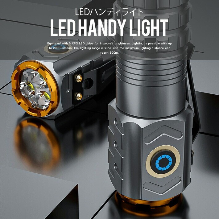XPG LEDチップを3つ搭載し、輝度が向上。最大2000ルーメンで照明可能です。照明範囲が広く、最大照明距離は300mに達します。暗闇の中でも部屋全体を照らすことができます。