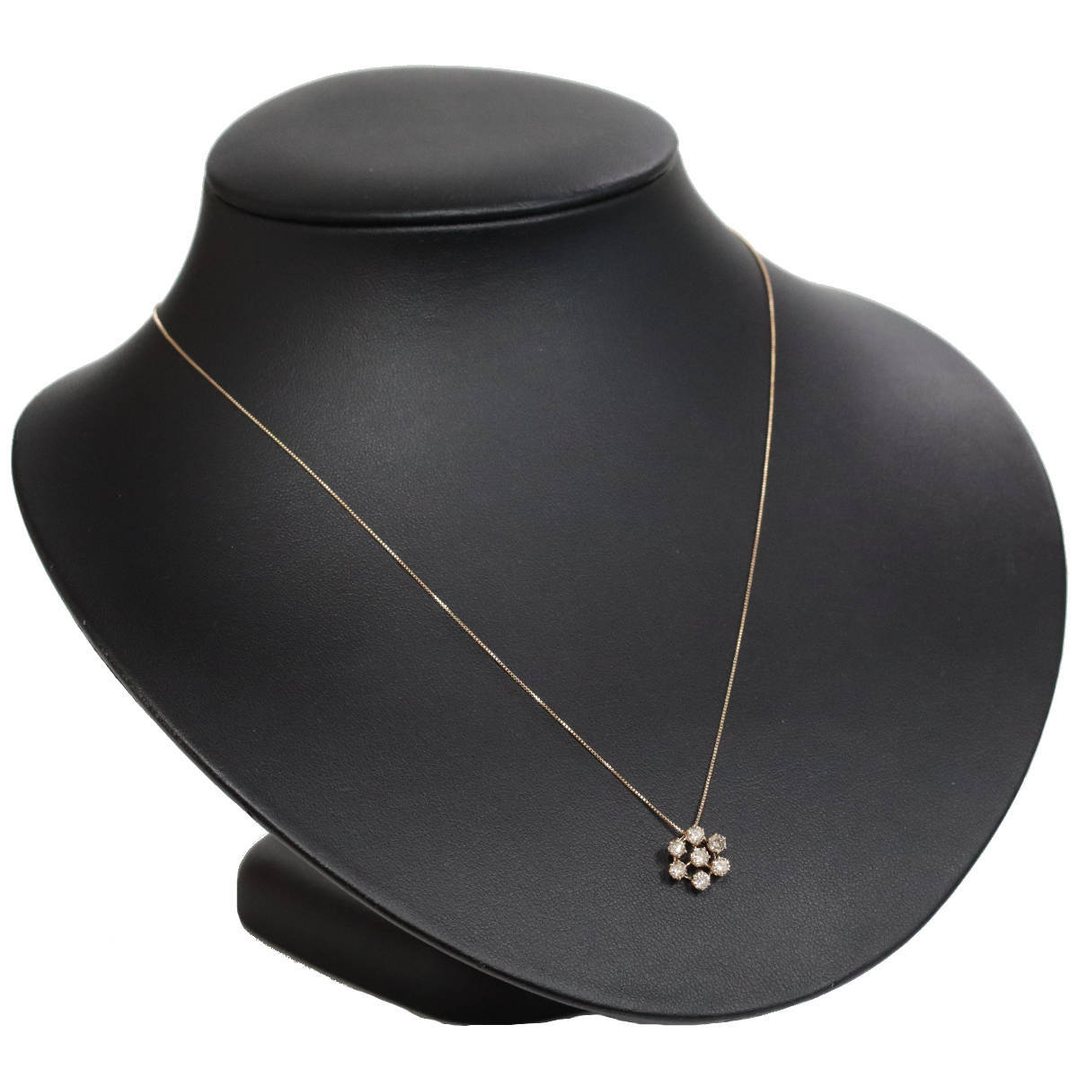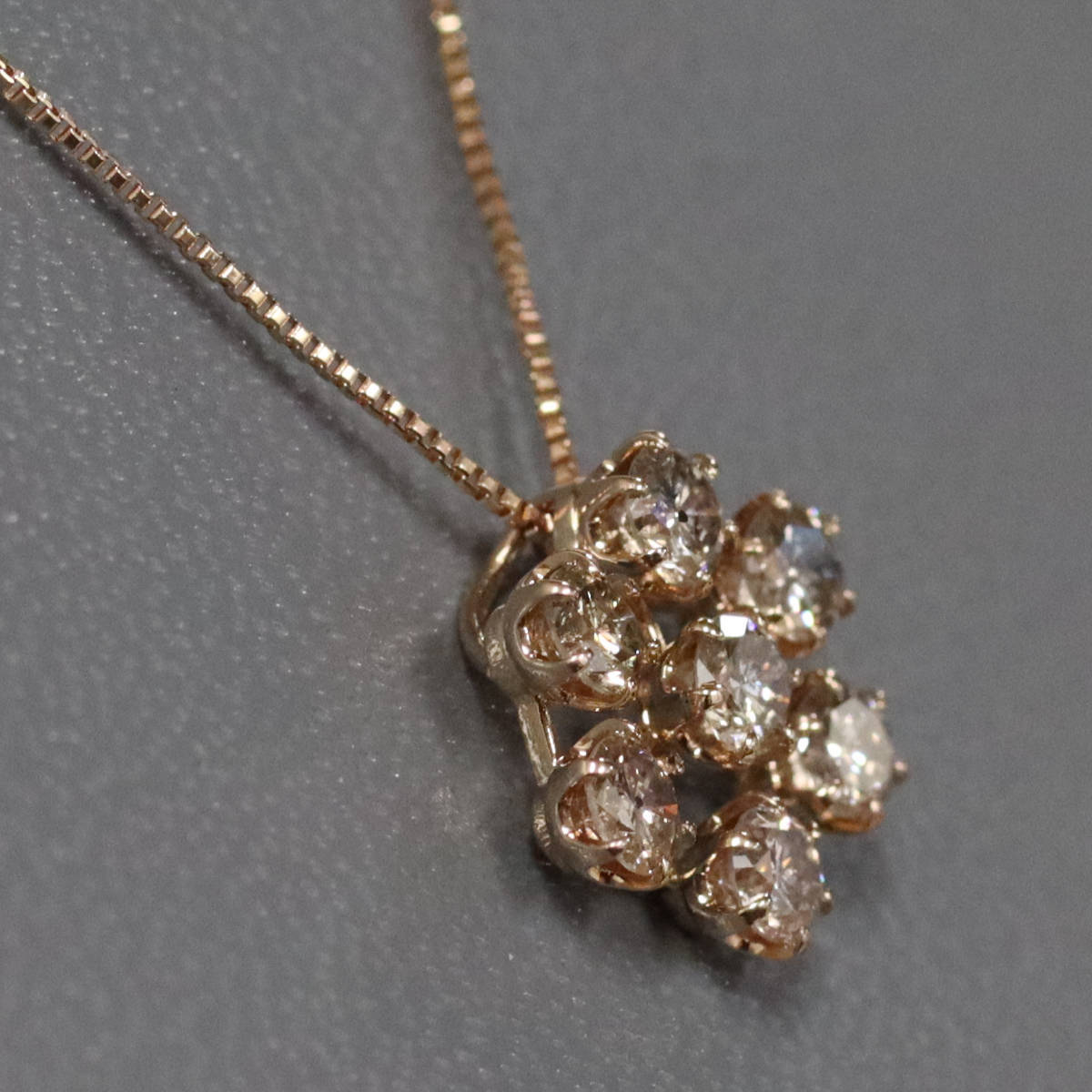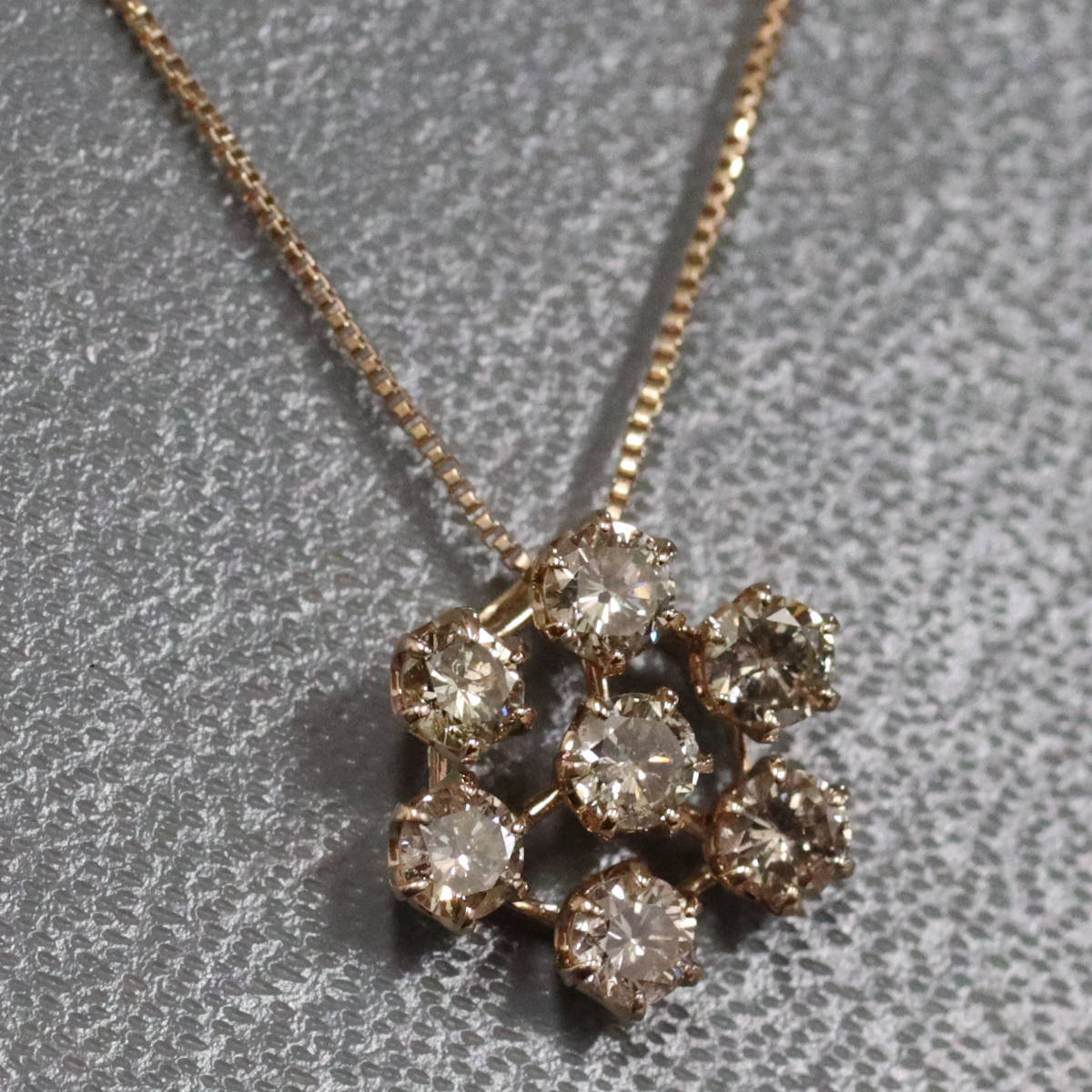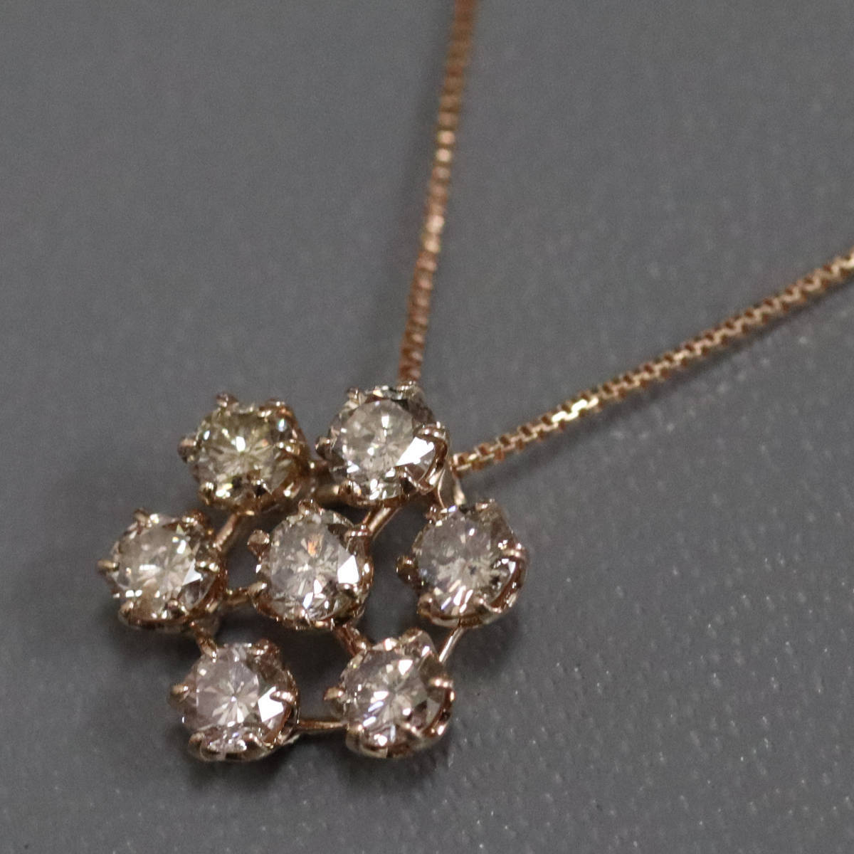 K18PGダイヤモンドペンダントの中古品です。 インクルージョンがやや多く、ルーペで見ると黒いカーボンが多く見えます。 やや茶色に近いお色味ですが、照りと輝きは良好です。 地金には小傷がございます。