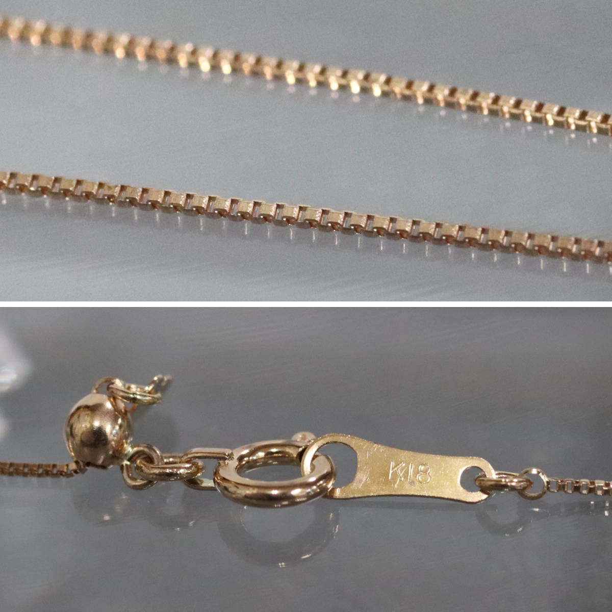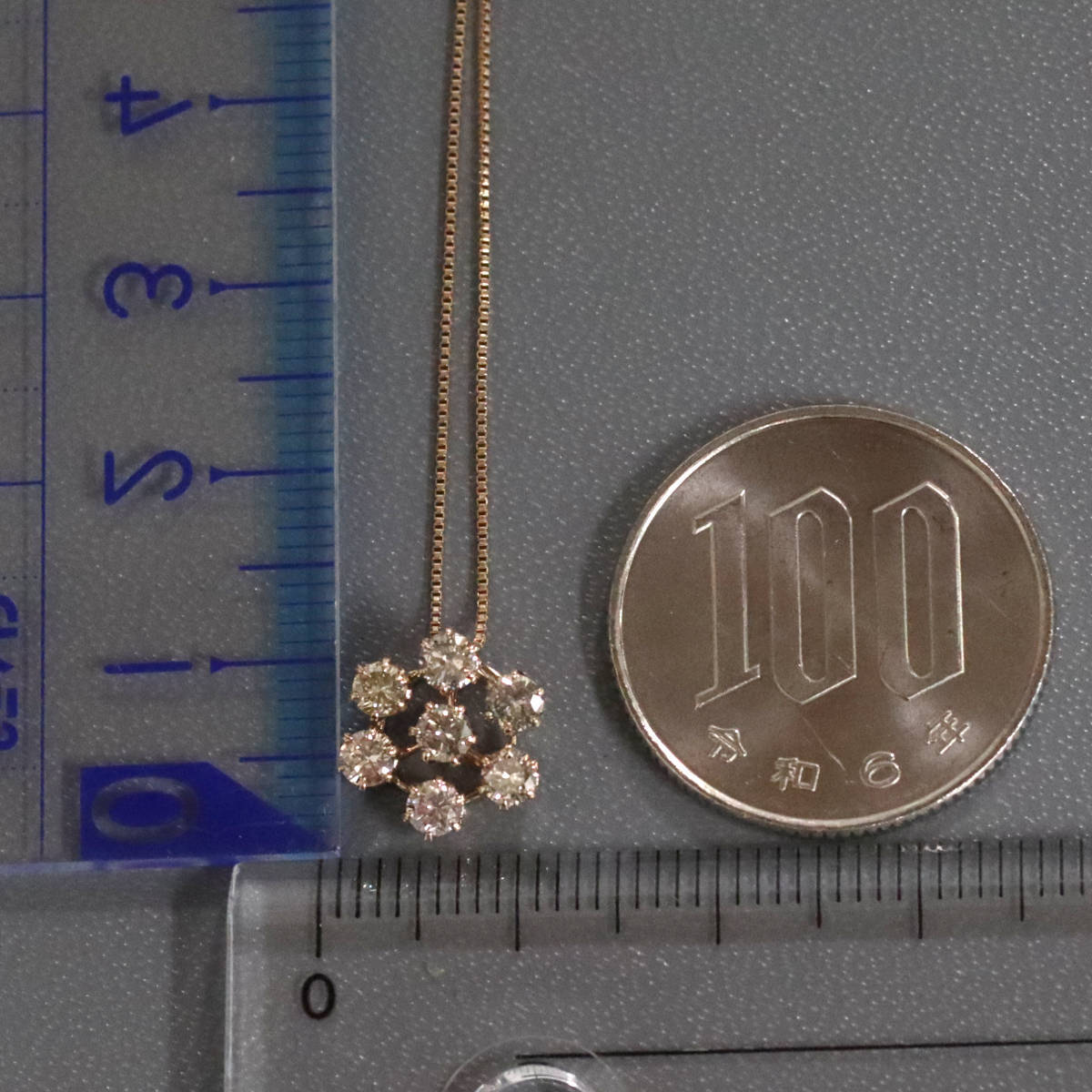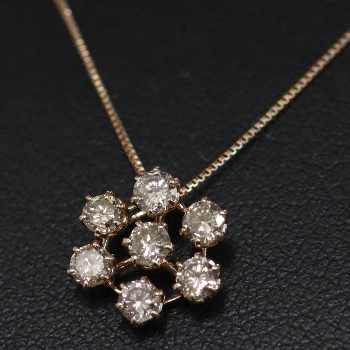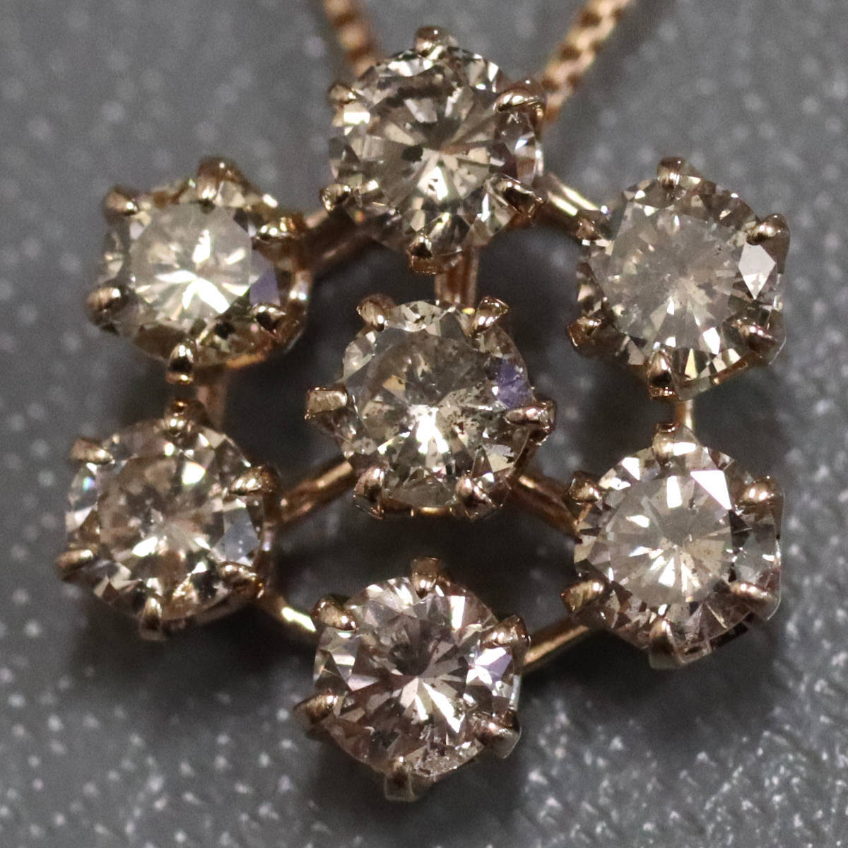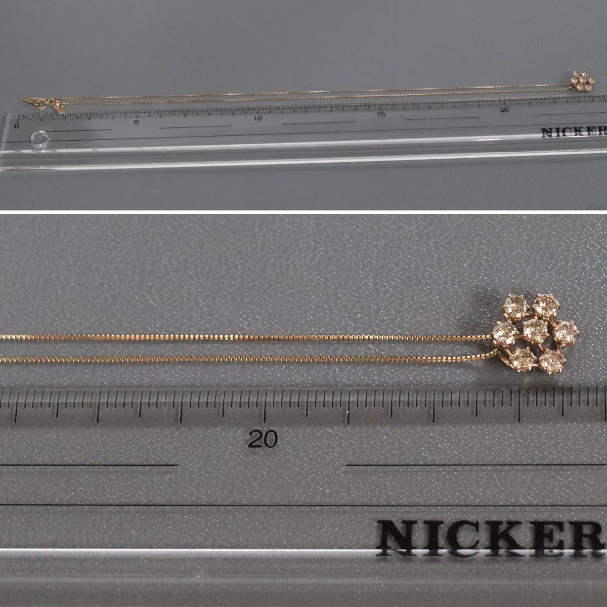 K18PGダイヤモンドペンダントの中古品です。 インクルージョンがやや多く、ルーペで見ると黒いカーボンが多く見えます。 やや茶色に近いお色味ですが、照りと輝きは良好です。 地金には小傷がございます。