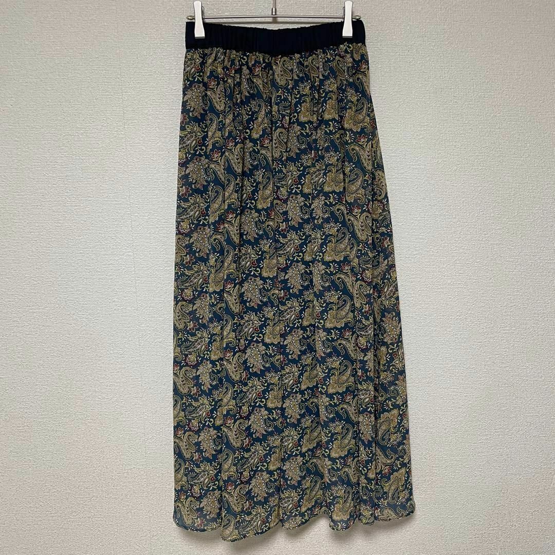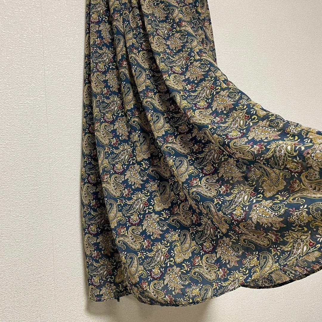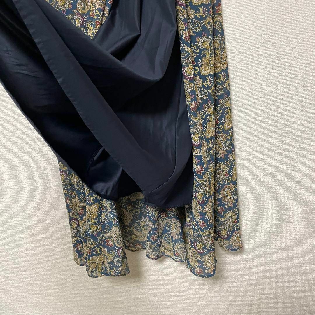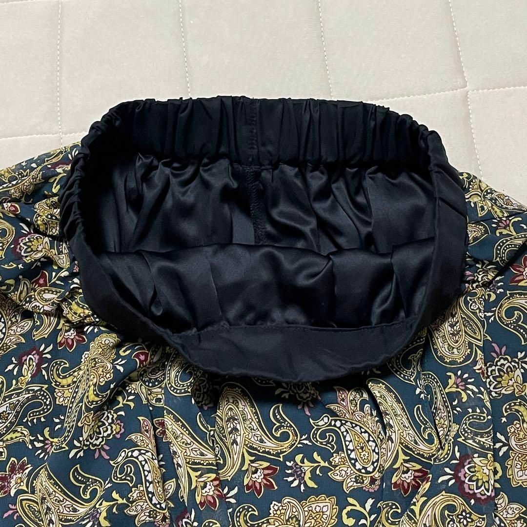 身長157センチ(標準体型、普段Mサイズ)ですと、おへそとアンダーバストの真ん中あたりにウエストを合わせますとネイビーの生地はふくらはぎ真ん中くらいで柄の丈はくるぶしより長く床には着かないくらいです