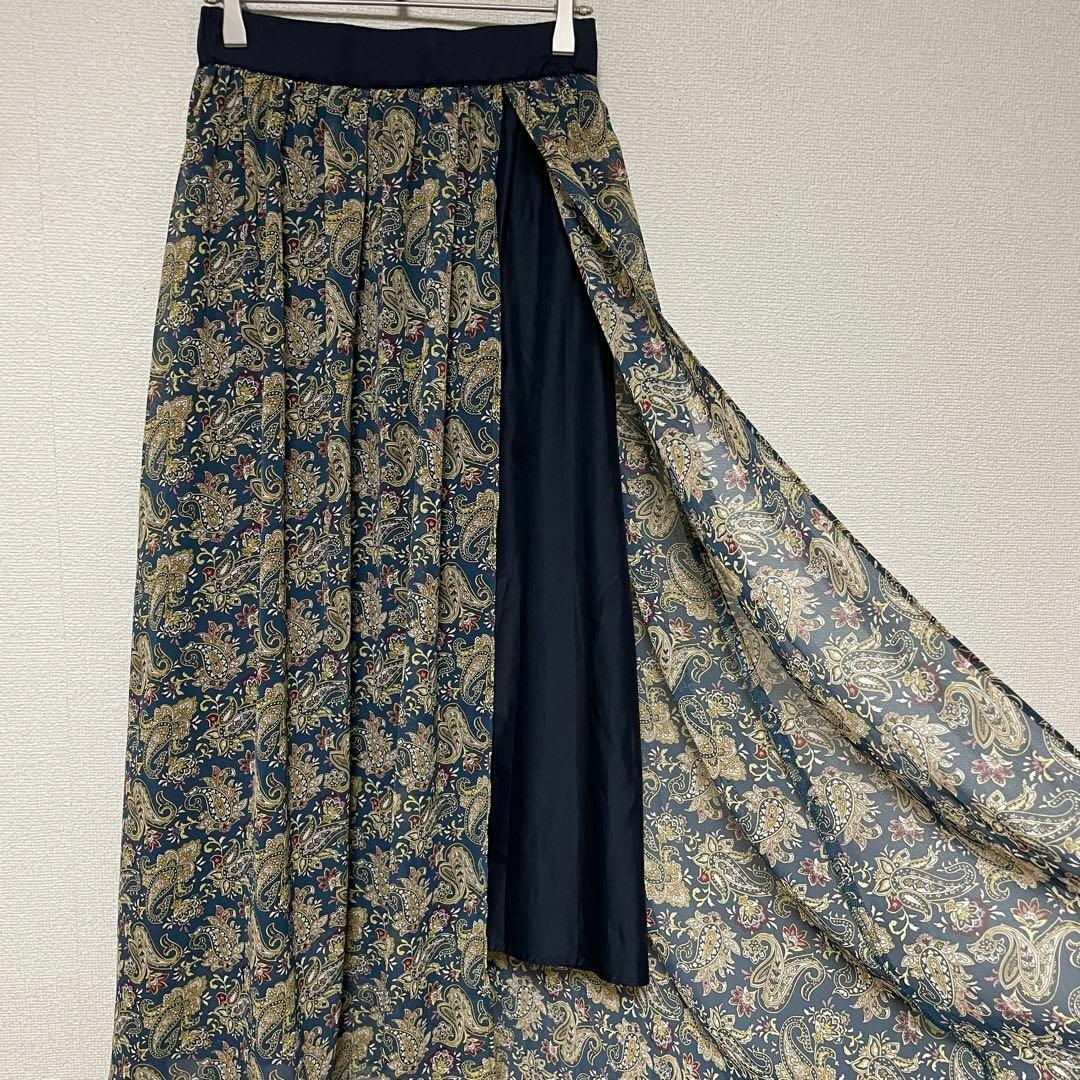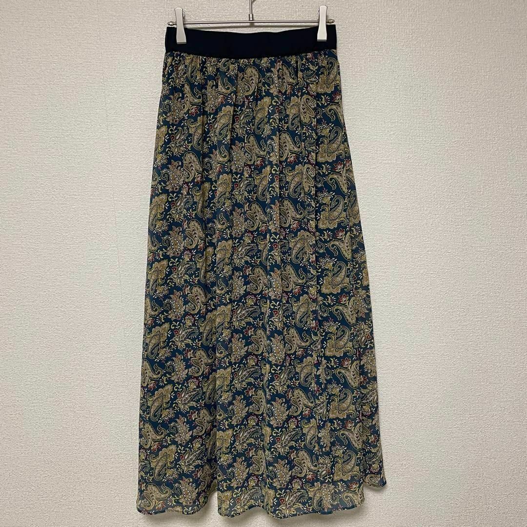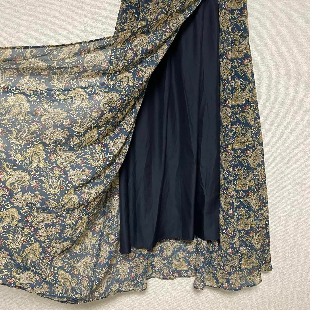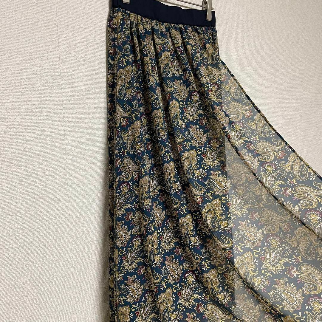 身長157センチ(標準体型、普段Mサイズ)ですと、おへそとアンダーバストの真ん中あたりにウエストを合わせますとネイビーの生地はふくらはぎ真ん中くらいで柄の丈はくるぶしより長く床には着かないくらいです