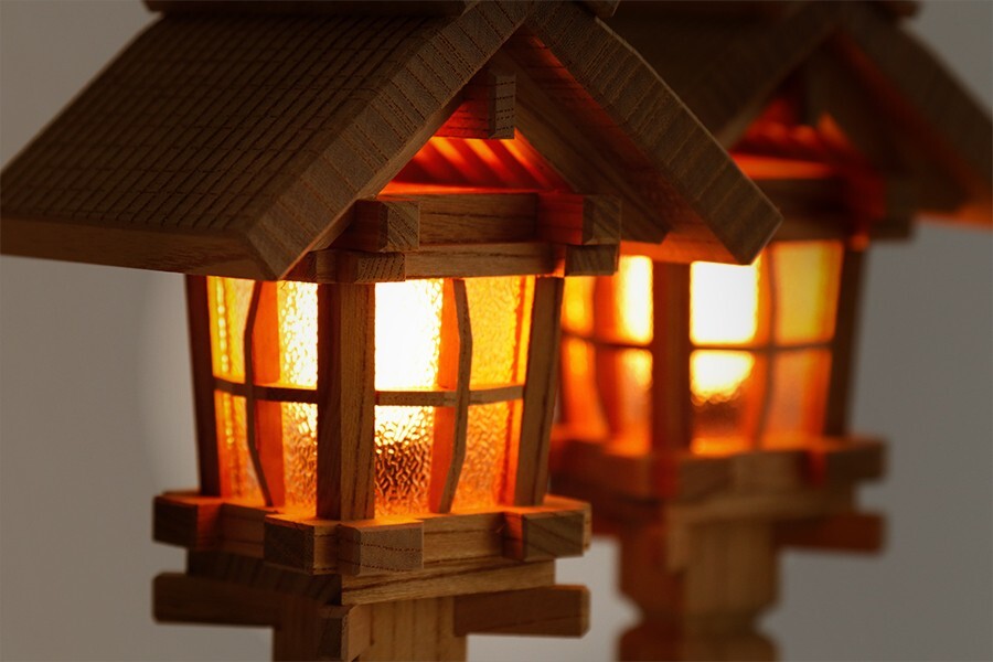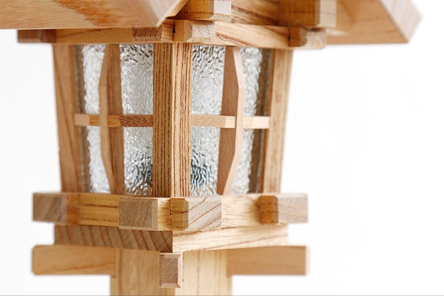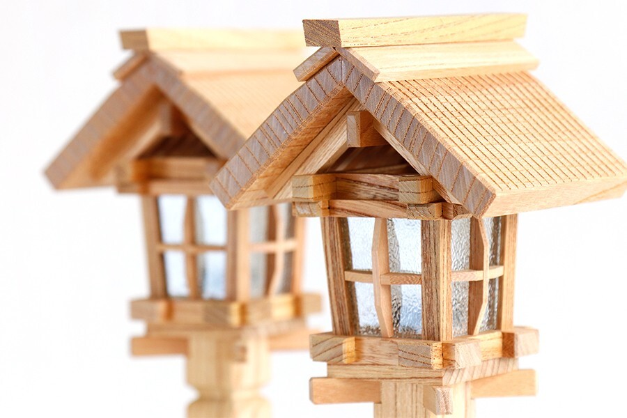 濃い色と木目が美しい本欅を素材とした神具用品です。 木目の美しい最上級の本欅灯籠。密に詰まった年輪と優しい木肌。神具にもこだわりの逸品を。 屋根には細かな木彫りが、窓部分はガラス板に木枠を取り付けた職人仕上げです。 | |||