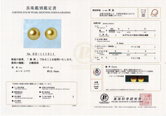 南洋白蝶ゴールド真珠 ピアス又はイヤリング用ペアルース 真珠科学研究所鑑別付(SS-111511) 真珠のサイズ 約12.0X12.0mm 形状 ラウンド 色 茶金ゴールド(ナチュラルカラー) テリ ◎最強 巻き ◎最良 巻厚値◎3.2mm 瑕 ◎ほとんど無し ピアス又はイヤリングをご希望の方は別途金具代が掛かりますのでお申し付け下さい。 ※現在は無穴です ※暗室でのライトアップ撮影の為実際とは多少違って見える場合が御座います。 |