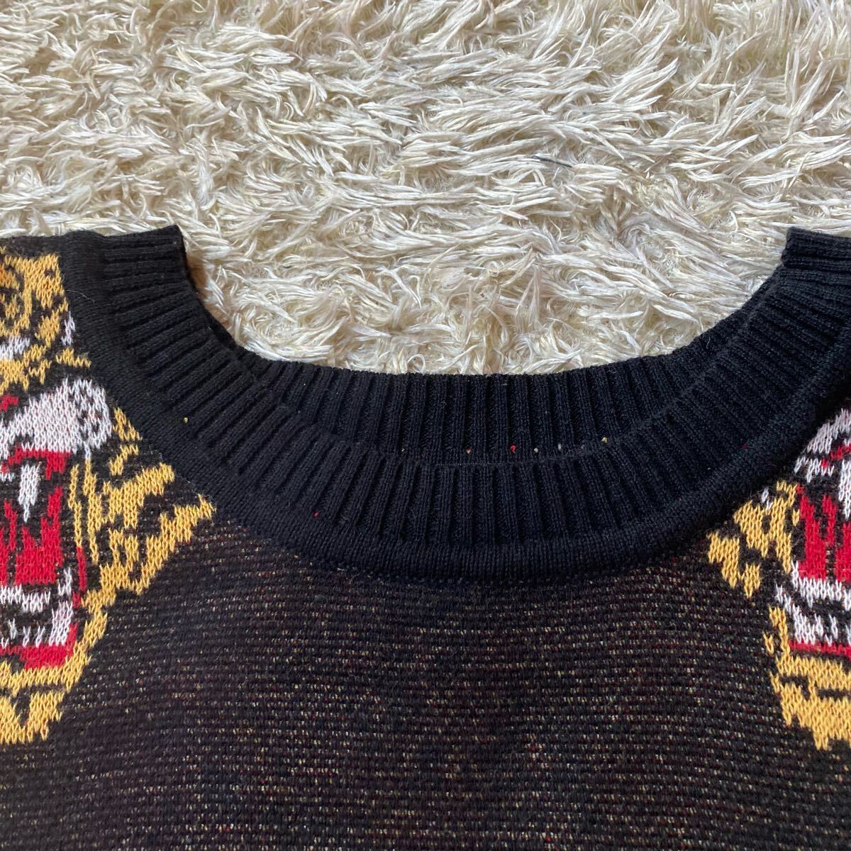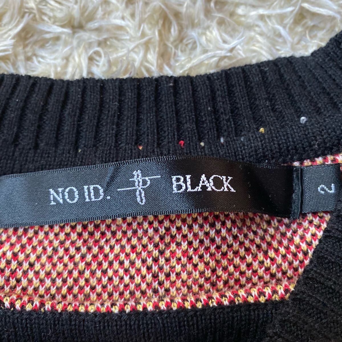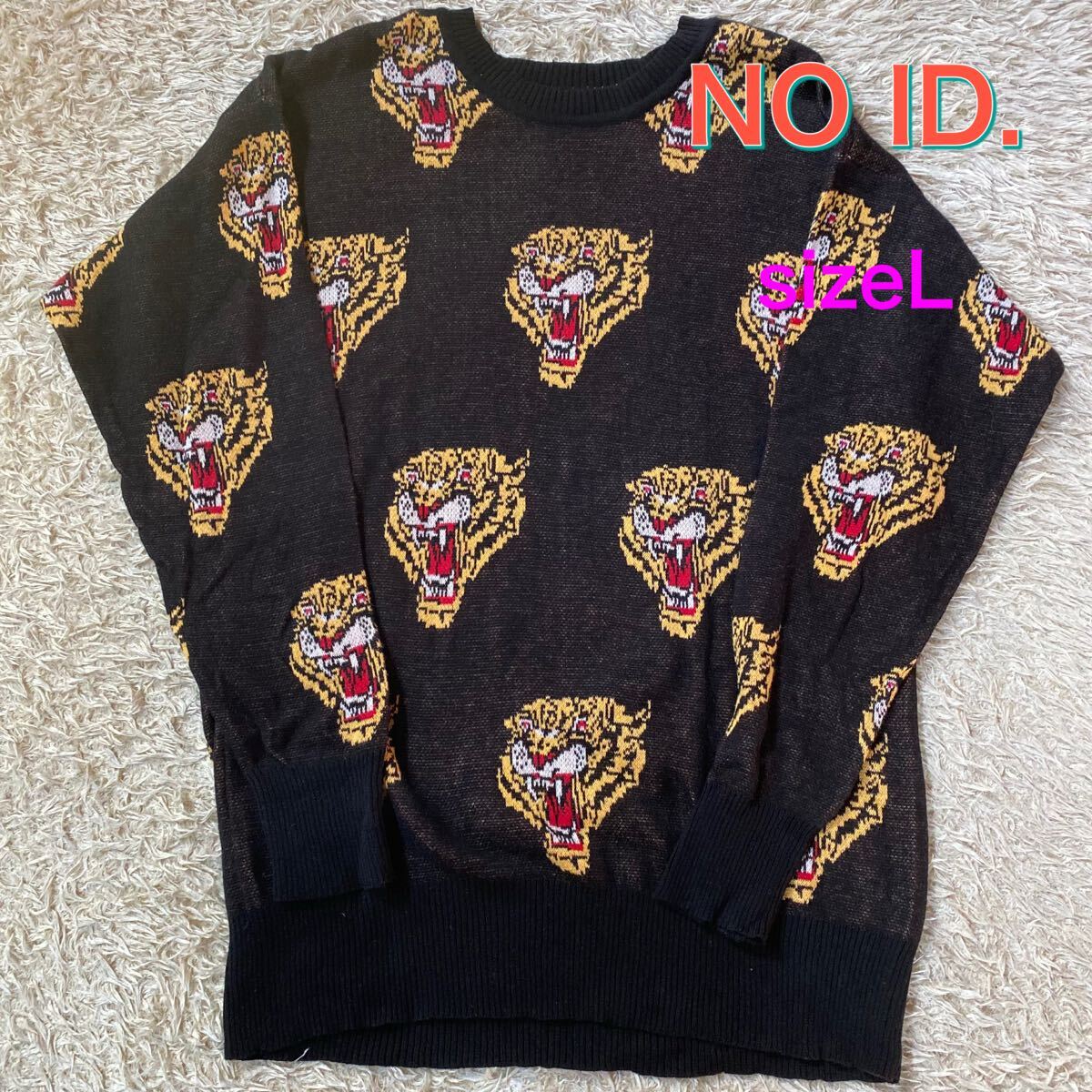 このNO ID.のアニマル総柄の薄手ニットセーターは、落ち着いたブラック系の色合いで、メンズサイズのMです。アートを感じる独特のデザインが魅力的で、季節の変わり目や冷え込む季節に最適な一枚です。ファッションにアクセントを加えたい方におすすめです。
