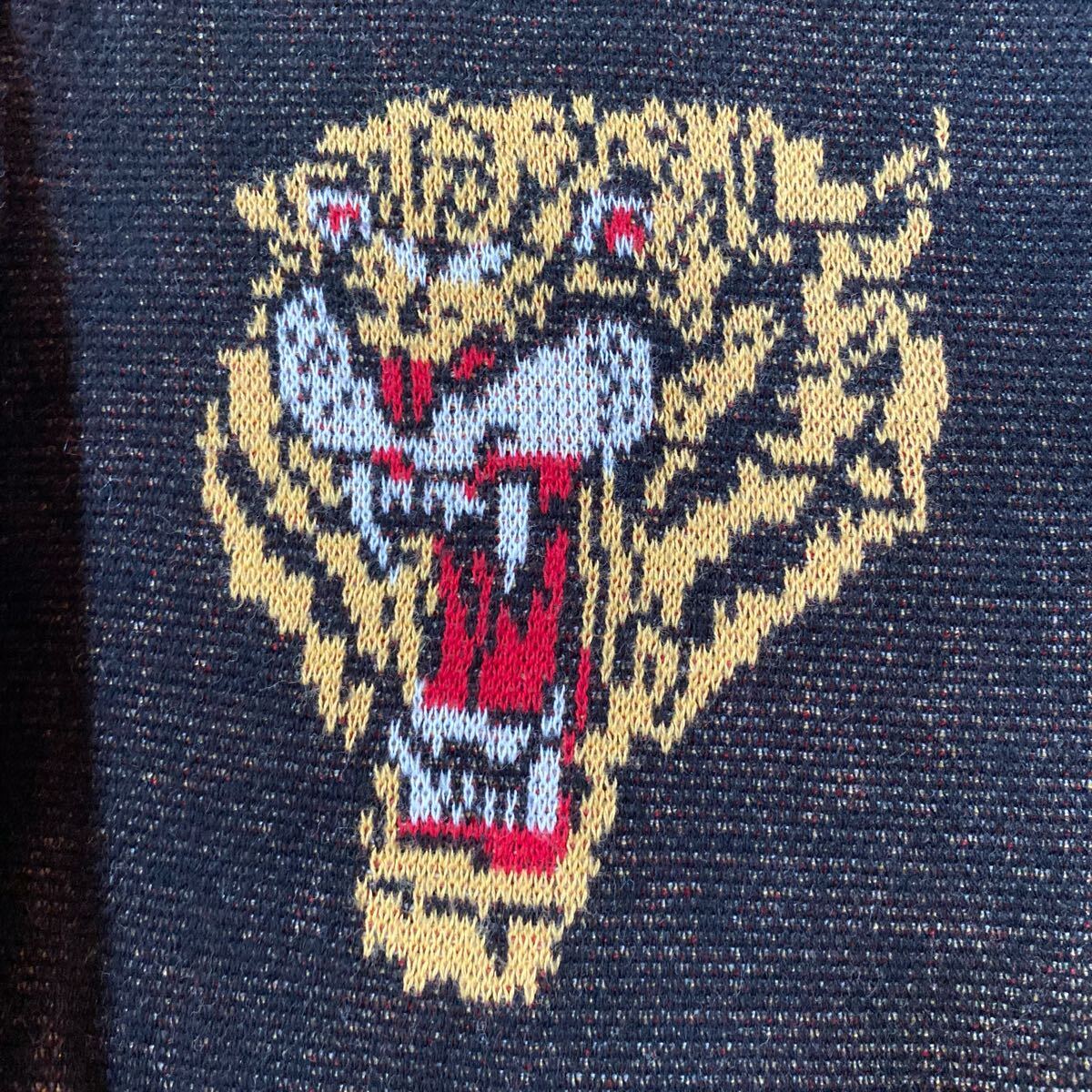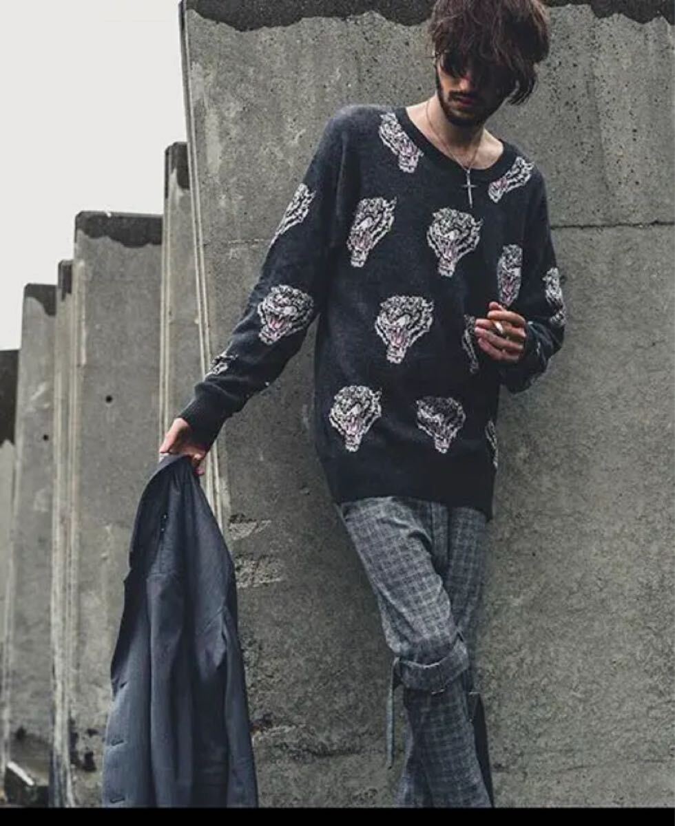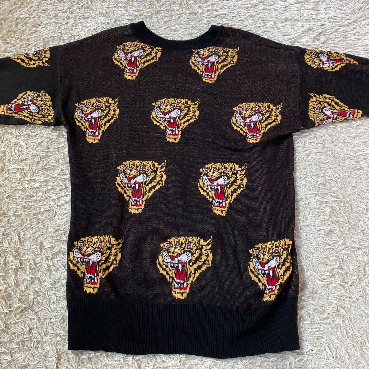 このNO ID.のアニマル総柄の薄手ニットセーターは、落ち着いたブラック系の色合いで、メンズサイズのMです。アートを感じる独特のデザインが魅力的で、季節の変わり目や冷え込む季節に最適な一枚です。ファッションにアクセントを加えたい方におすすめです。