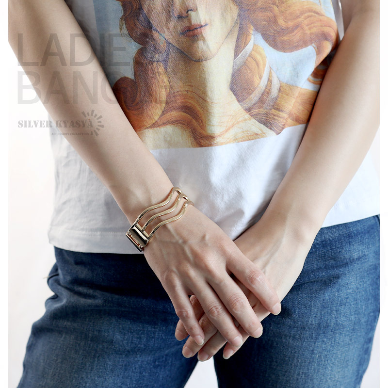 バングル レディース 太幅 ワイド ウェーブ スリーライン 大人 腕輪 ゴールド 開閉式 ワイドバングル
