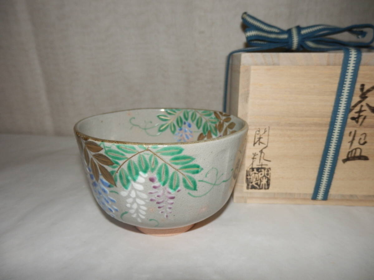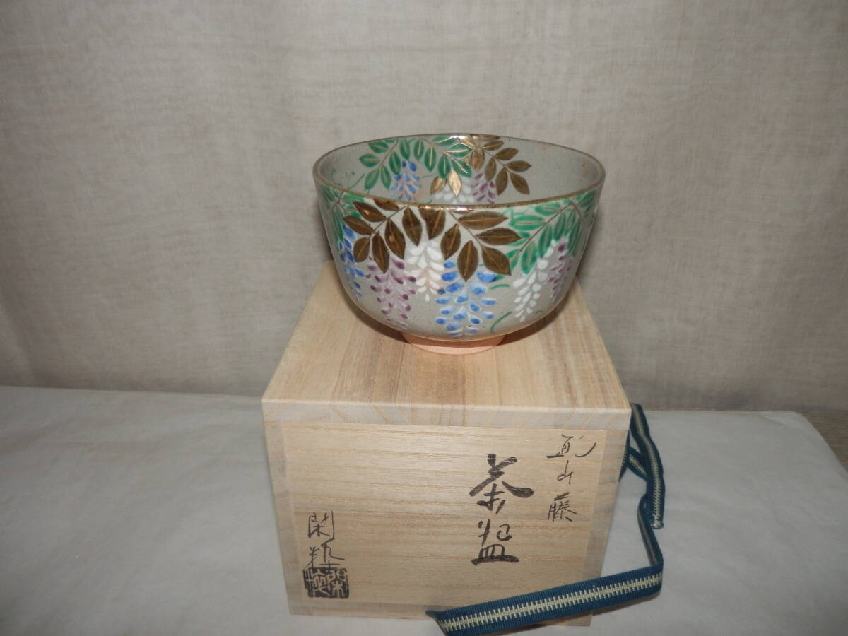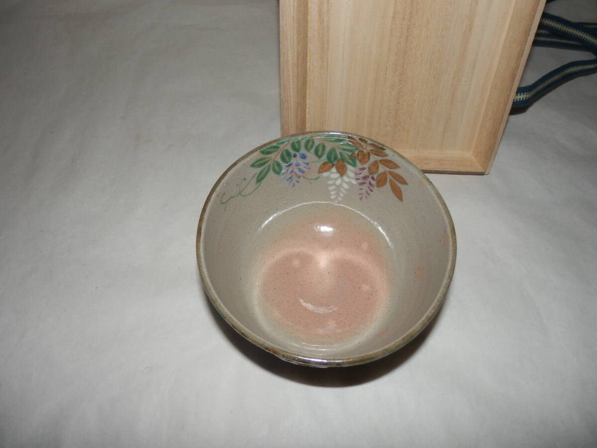 「新品・茶道具」杣山焼の南口閑粋さんの乾山写の茶碗です。藤です。 径約11.8cm 高さ約7.7cm 高台に閑粋の小判印有。 桐共箱。 どうぞ宜しく。