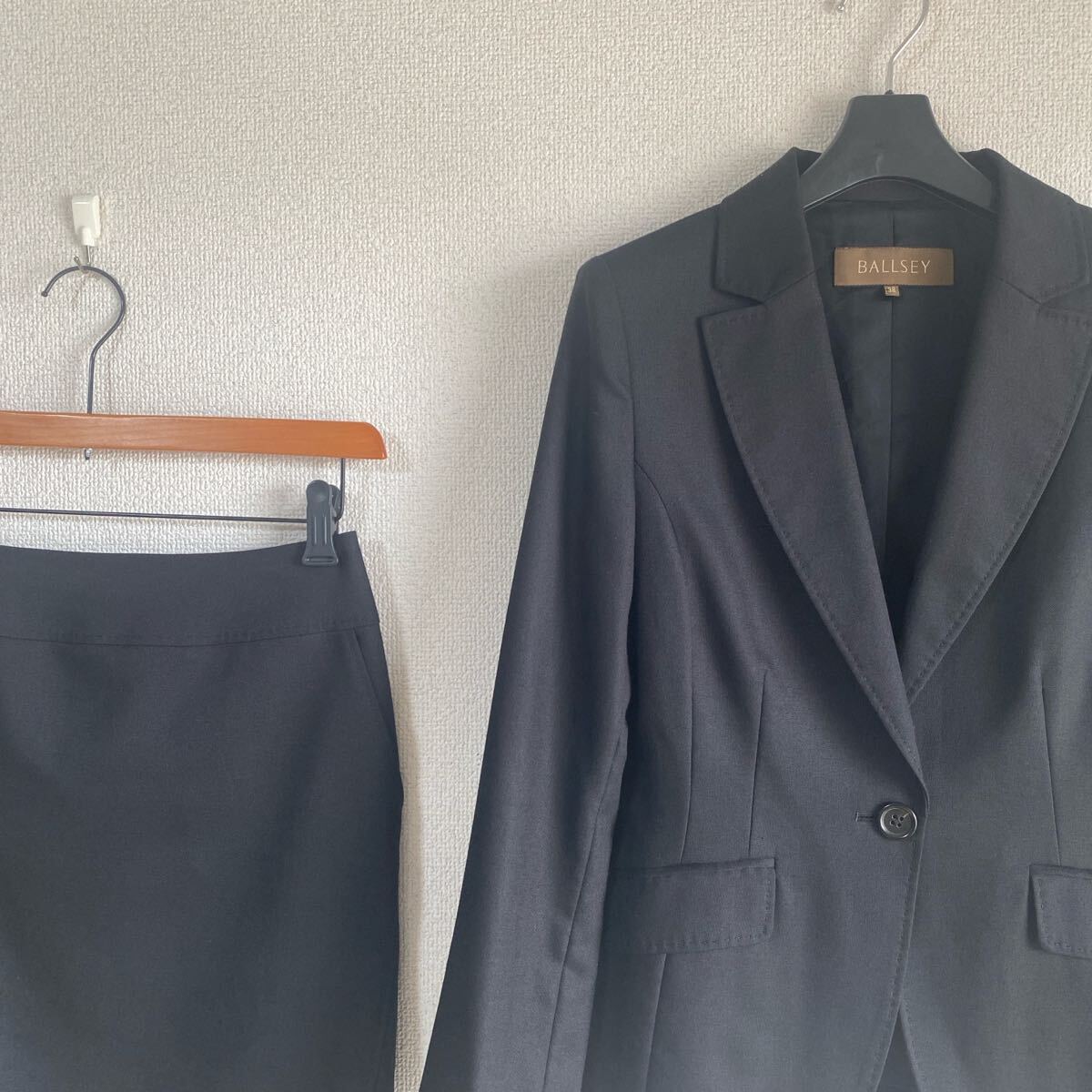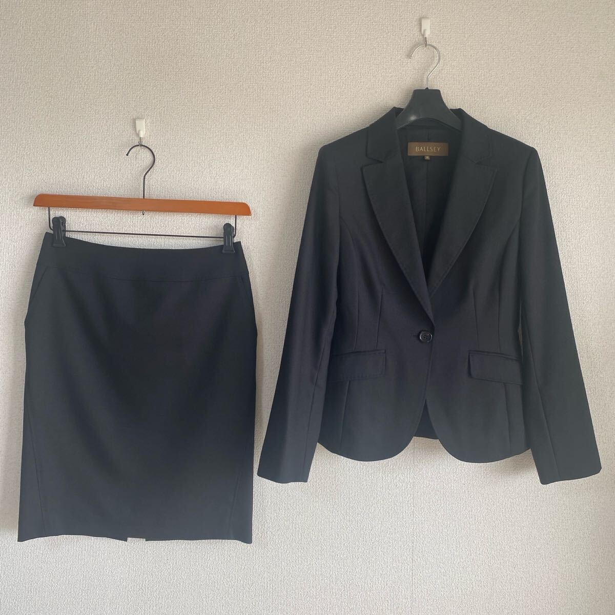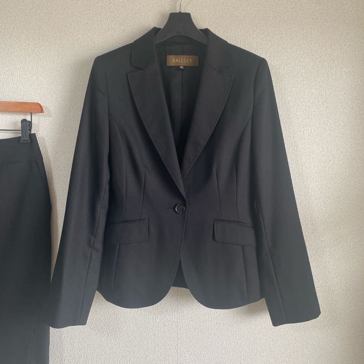 BALLSEY(ボールジィ)の、上品で、清楚な雰囲気で着こなせる、上質スーツです。面接、ビジネス、学校行事にお勧めです。お色は画像でご確認下さい。黒(ブラック)です。ウール、シルク混素材のスーツです。総裏仕立て、春秋シーズンにお召しになれる素材です。1つボタン。袖口にボタンが、3つ付いています。ジャケット、外ポケット×2。内ポケット×0。ノーベント。スカート、センターバックファスナー、フロントポケット×2。背面ポケット×2。スリットあり(背面、約12センチ)。とてもきれいなスカートスーツです。サイズの合う方にお勧めします。