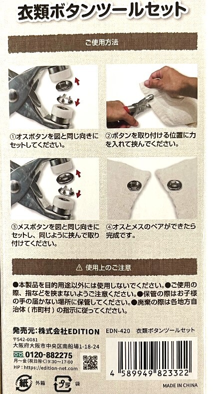 衣類のボタンを簡単取り付け。プレスツールとボタンのセット。