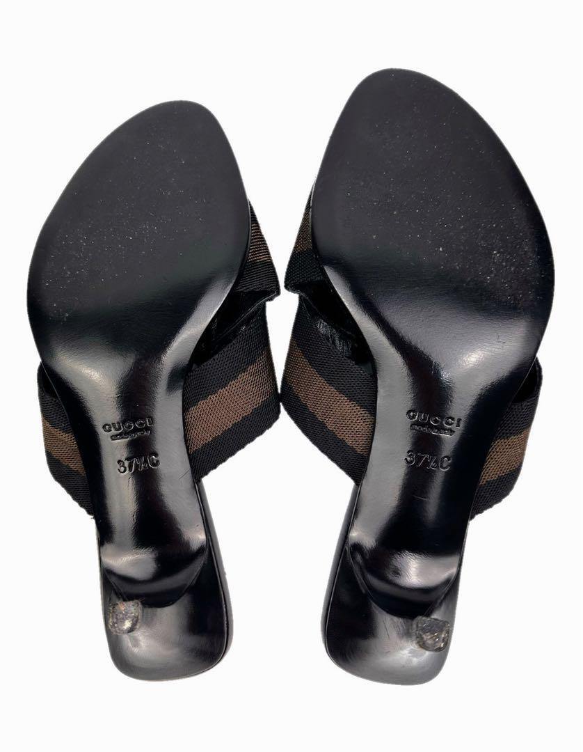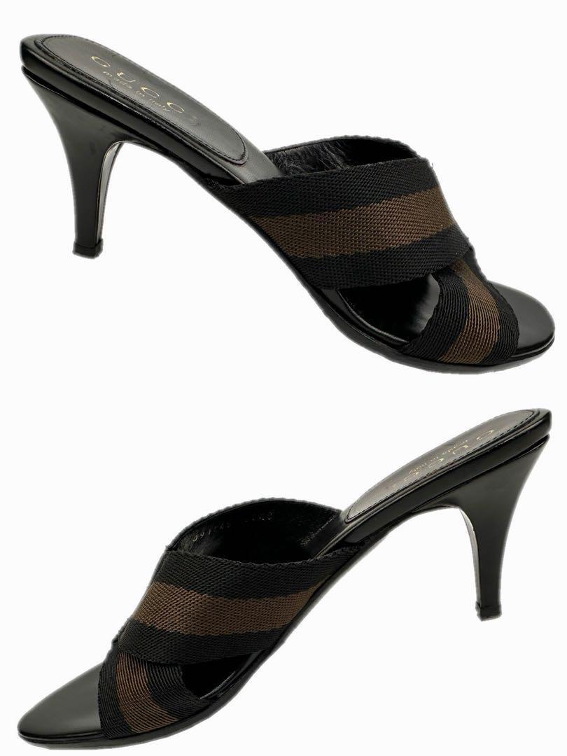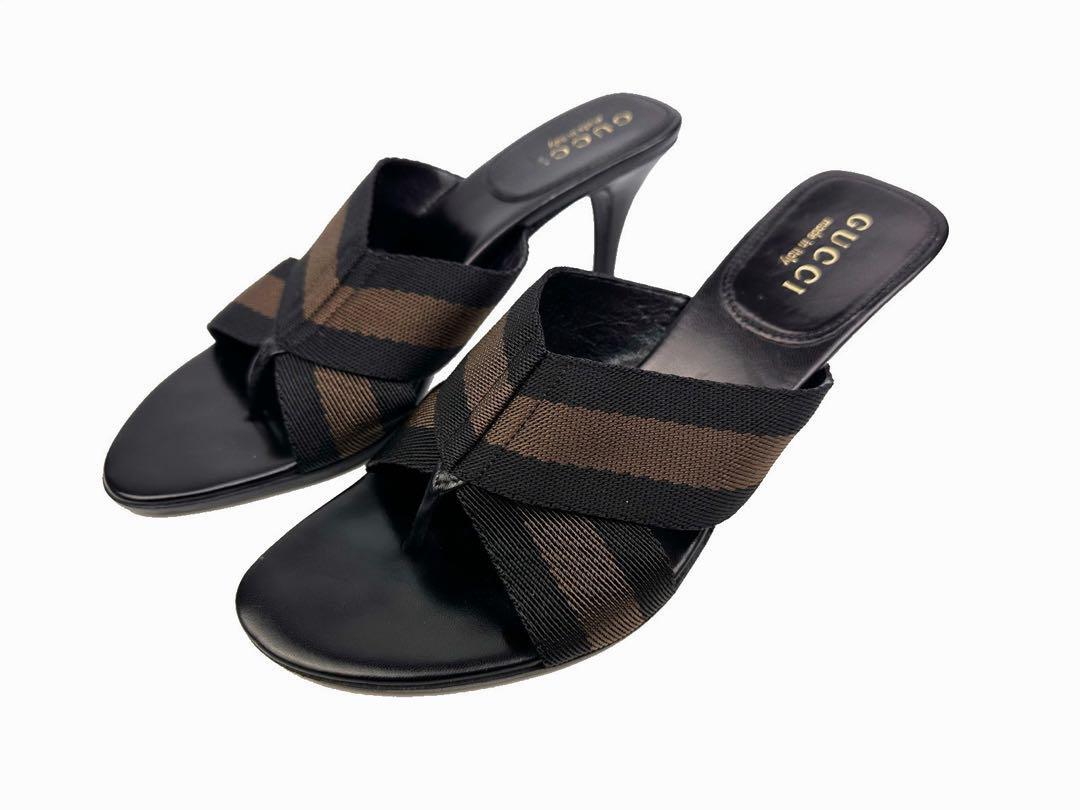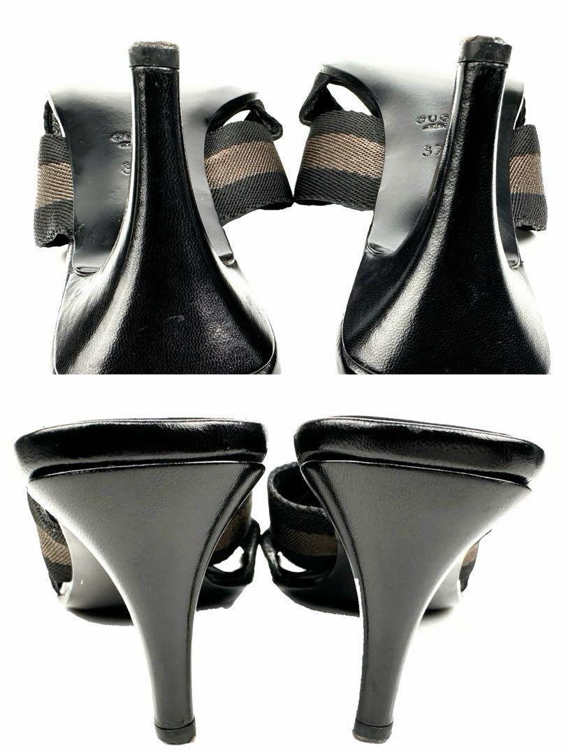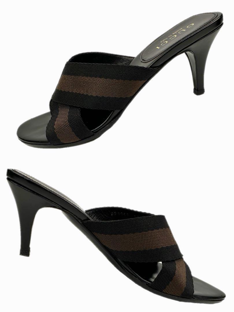 ◆◇グッチ GUCCI 091049 ストライプ サンダル リボン ヒール キャンバス レザー ブラック×ブラウン 黒×茶 ヒールサンダル ピンヒール ハイヒール レザー37 1/2C 約24.5cm レディース◇◆