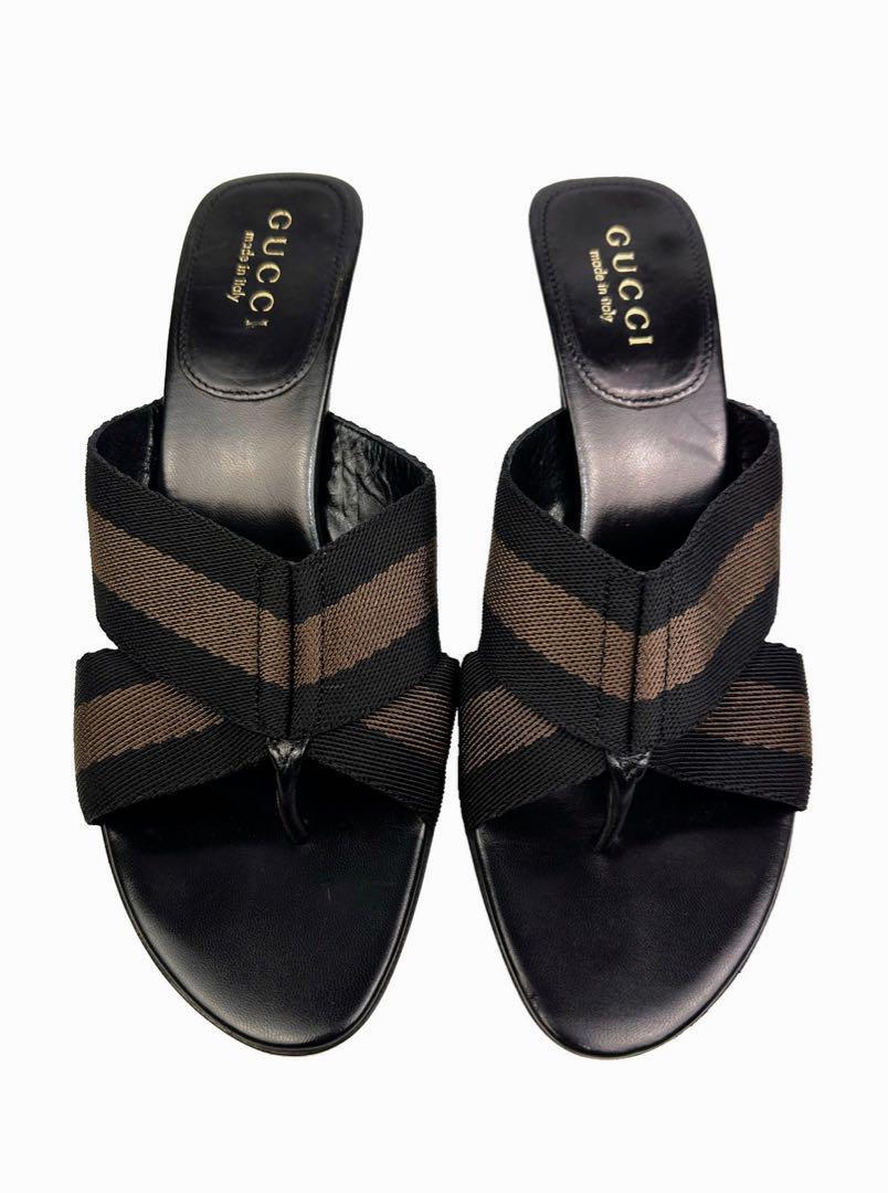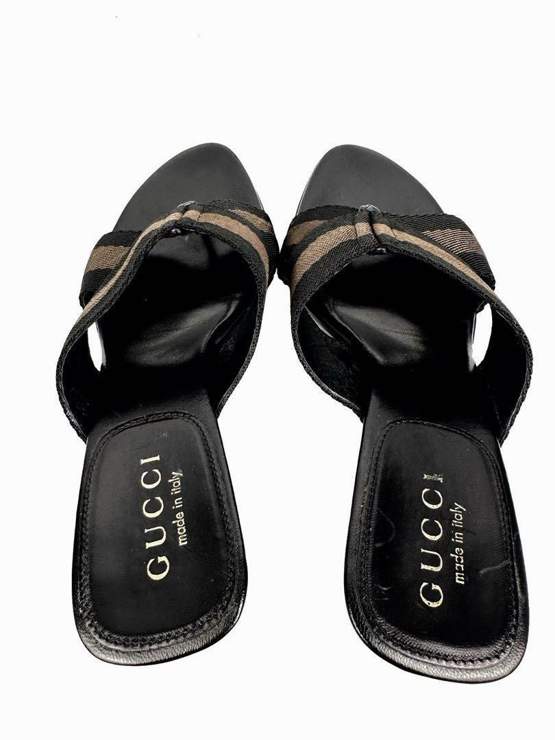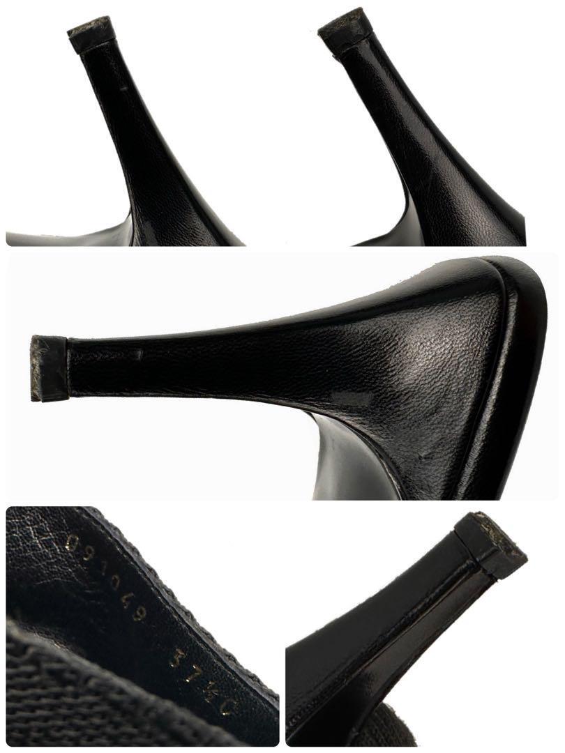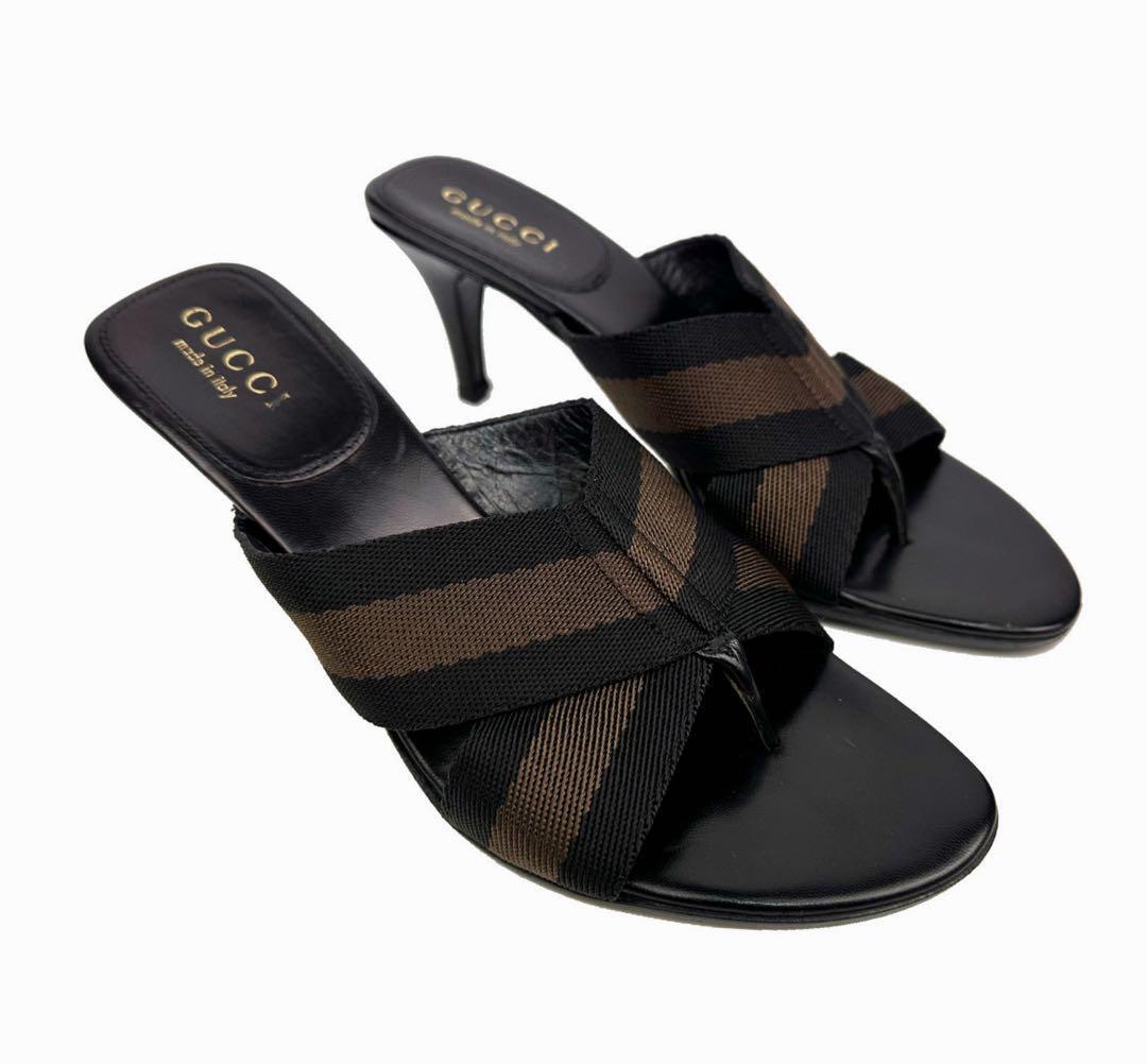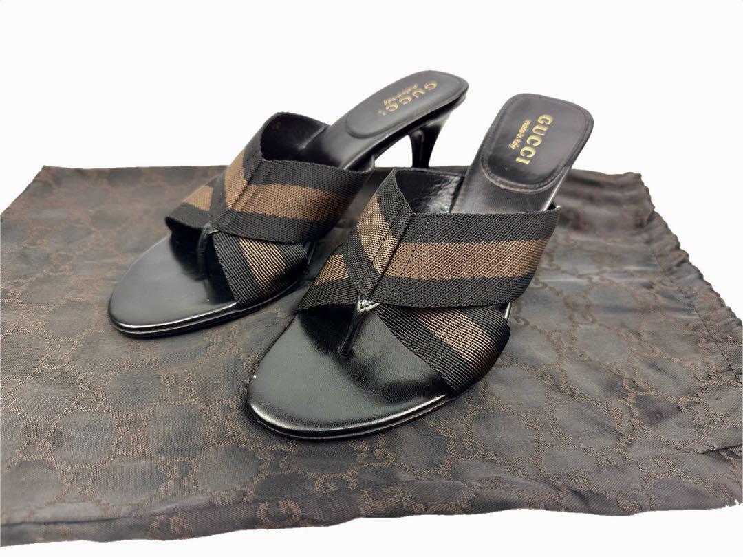 ◆◇グッチ GUCCI 091049 ストライプ サンダル リボン ヒール キャンバス レザー ブラック×ブラウン 黒×茶 ヒールサンダル ピンヒール ハイヒール レザー37 1/2C 約24.5cm レディース◇◆