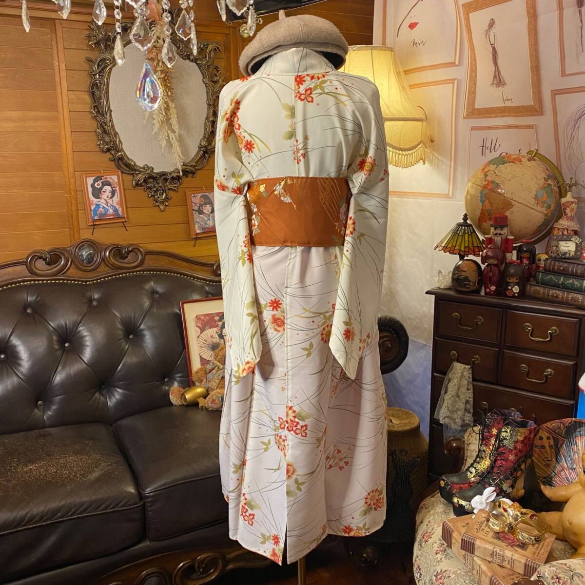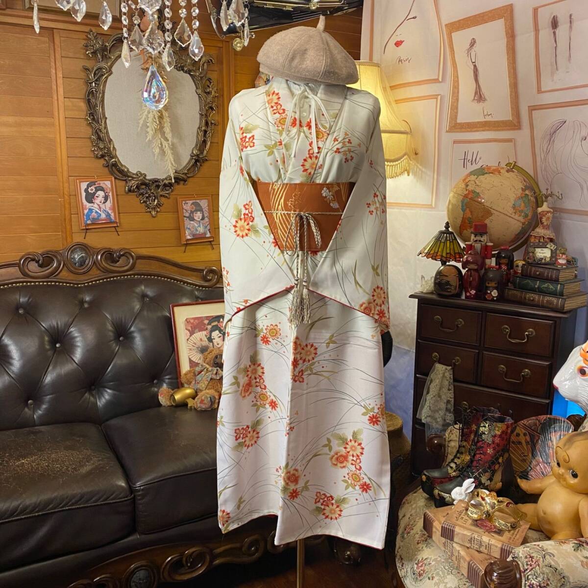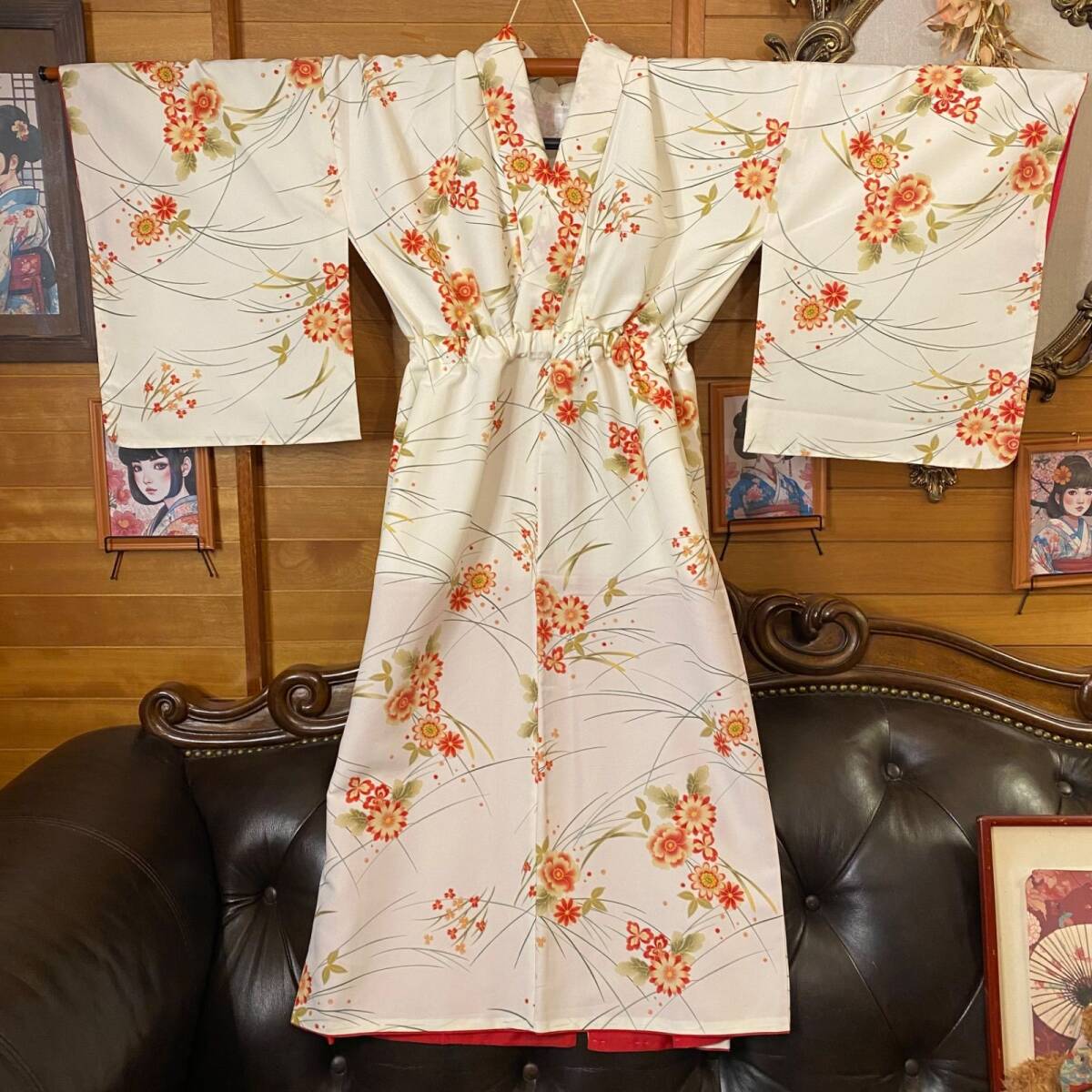 【着物リメイク セミロング ワンピース|洗える化繊素材&名古屋帯サッシュベルト付き レトロ 古着 ハンドメイド ふわりと舞うようなオフホワイトに、繊細なタッチで描かれた紅花が咲き誇る KW-822 】