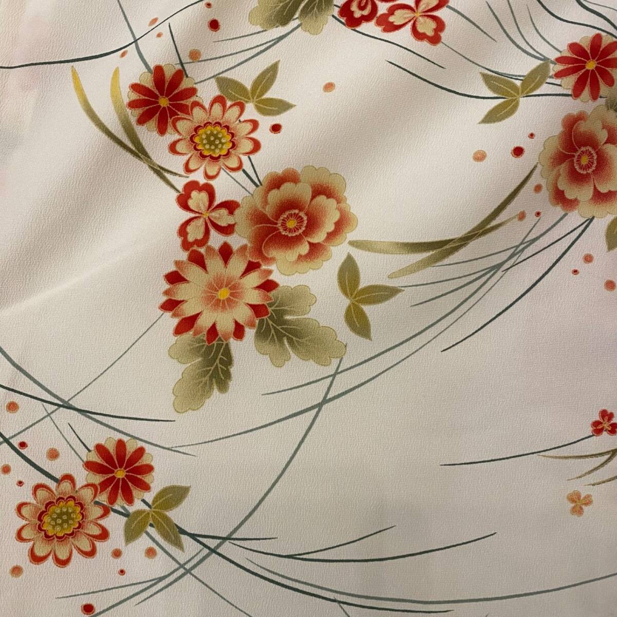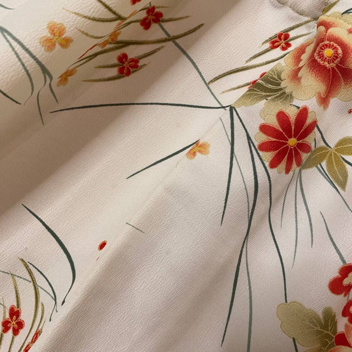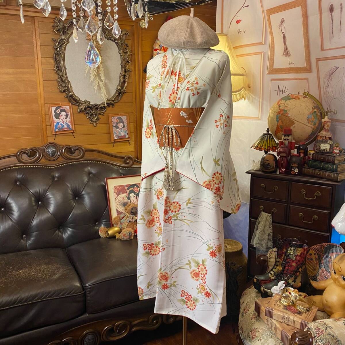 【着物リメイク セミロング ワンピース|洗える化繊素材&名古屋帯サッシュベルト付き レトロ 古着 ハンドメイド ふわりと舞うようなオフホワイトに、繊細なタッチで描かれた紅花が咲き誇る KW-822 】