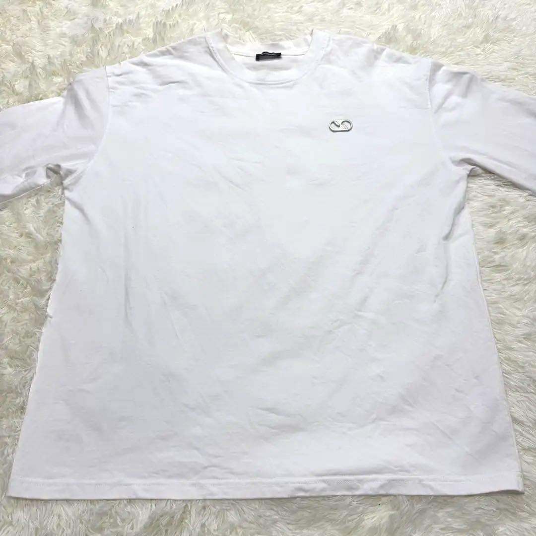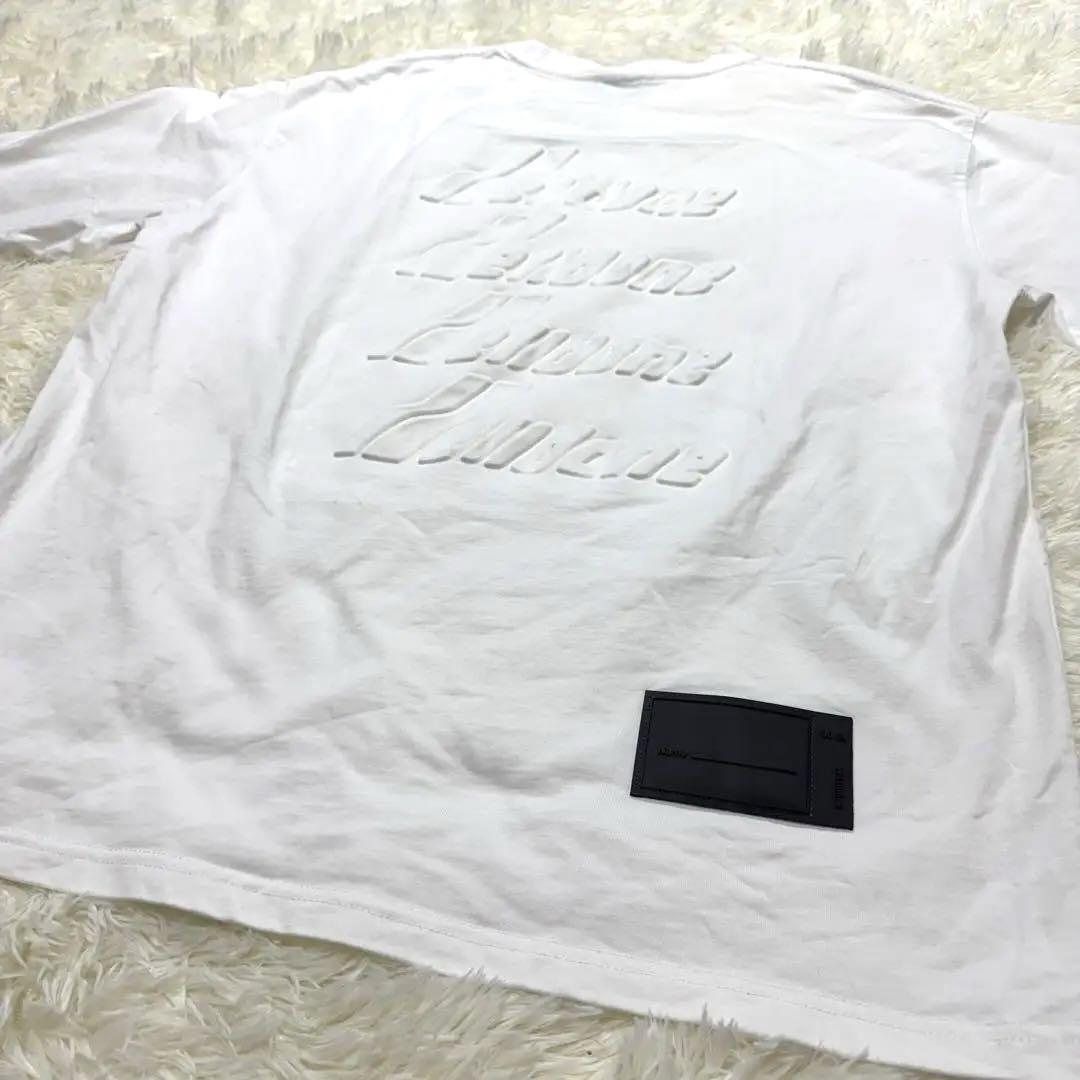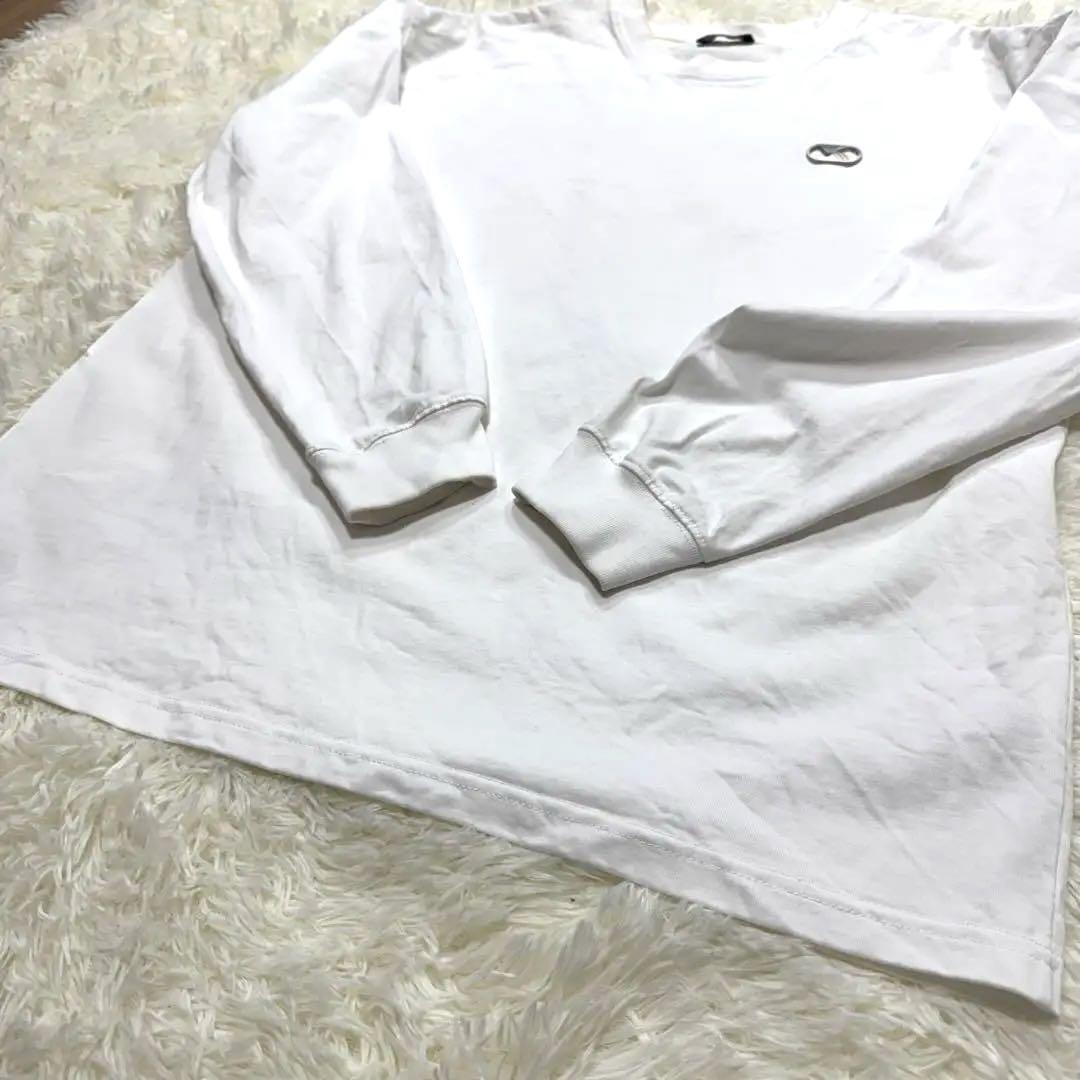 エンボス加工のロゴが特徴的なホワイトの長袖カットソー。