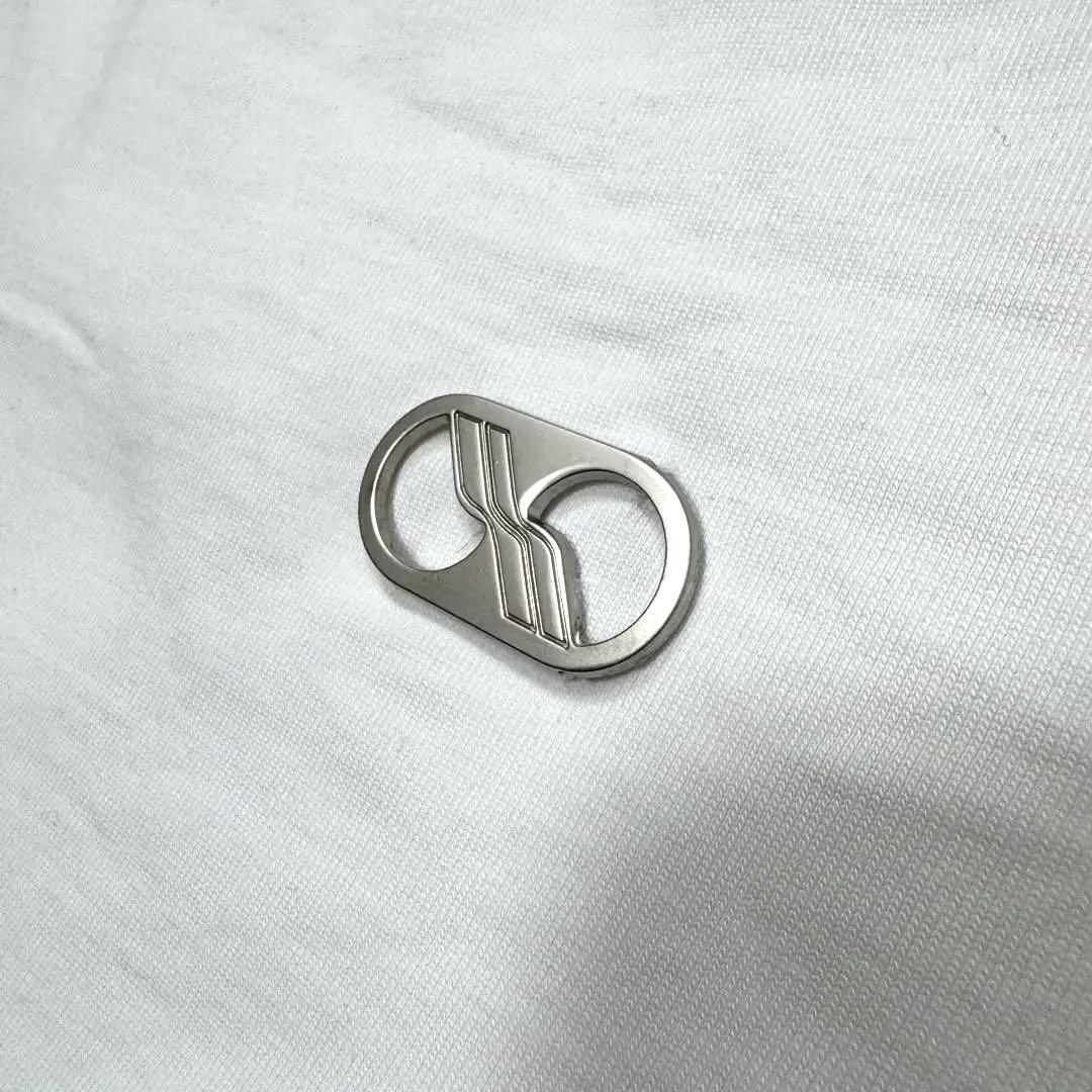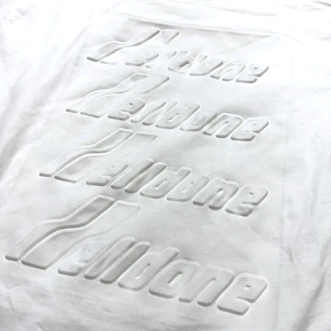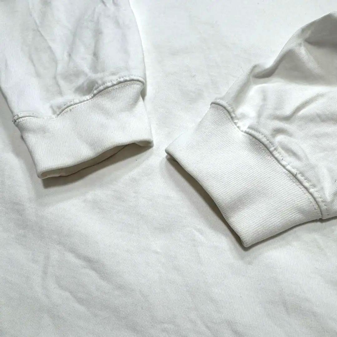 エンボス加工のロゴが特徴的なホワイトの長袖カットソー。