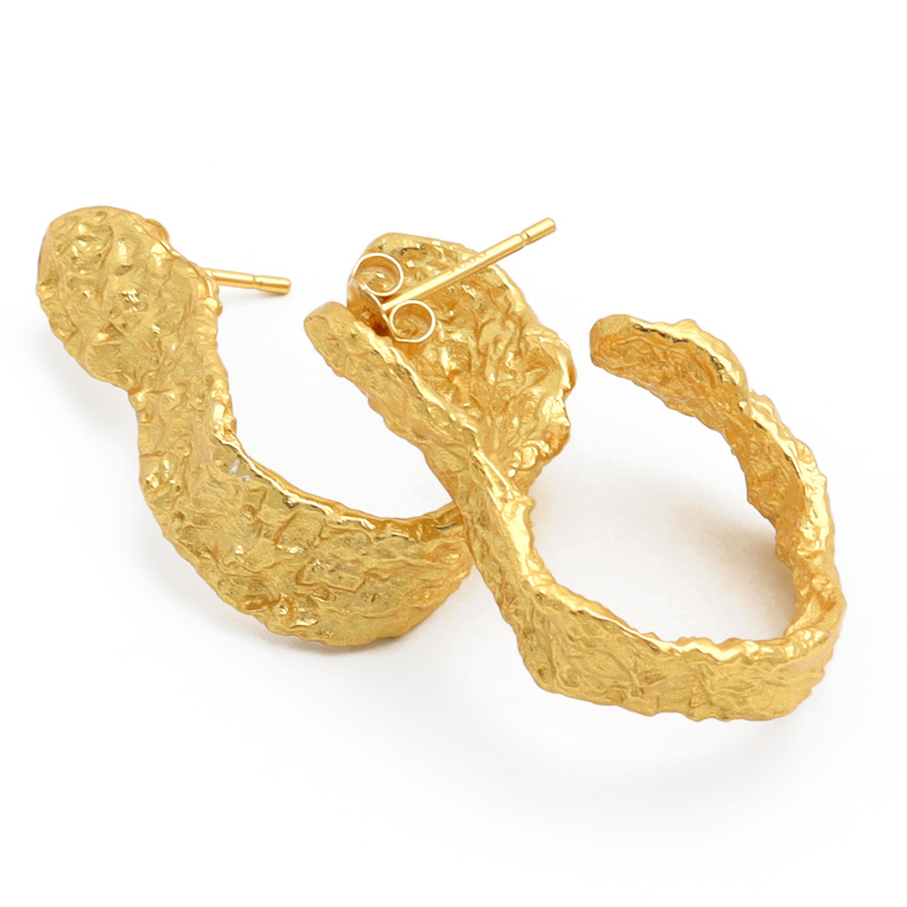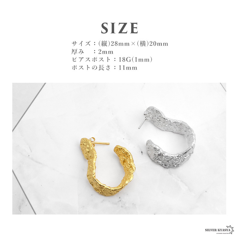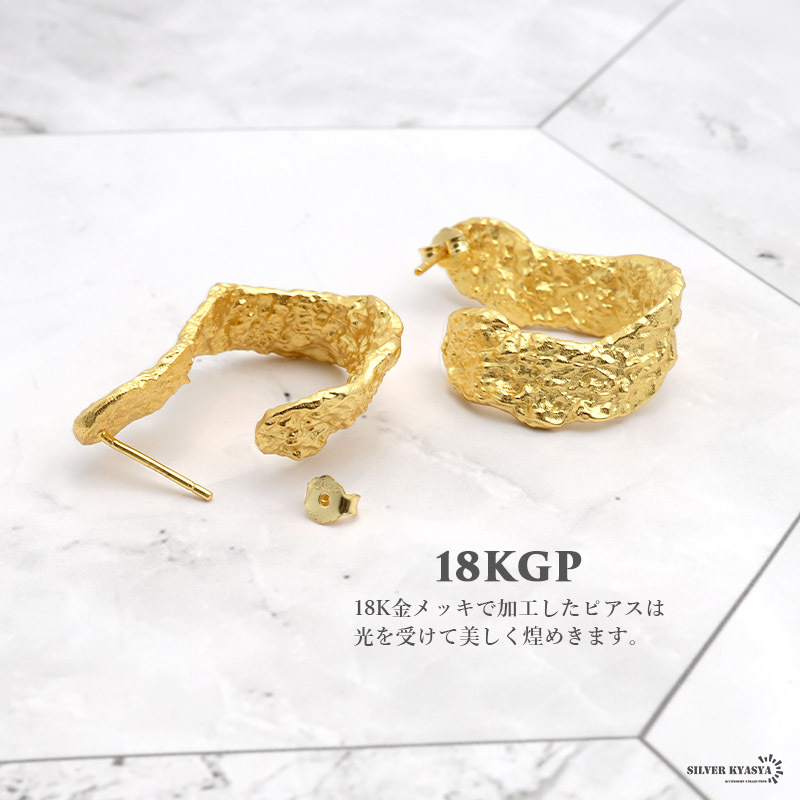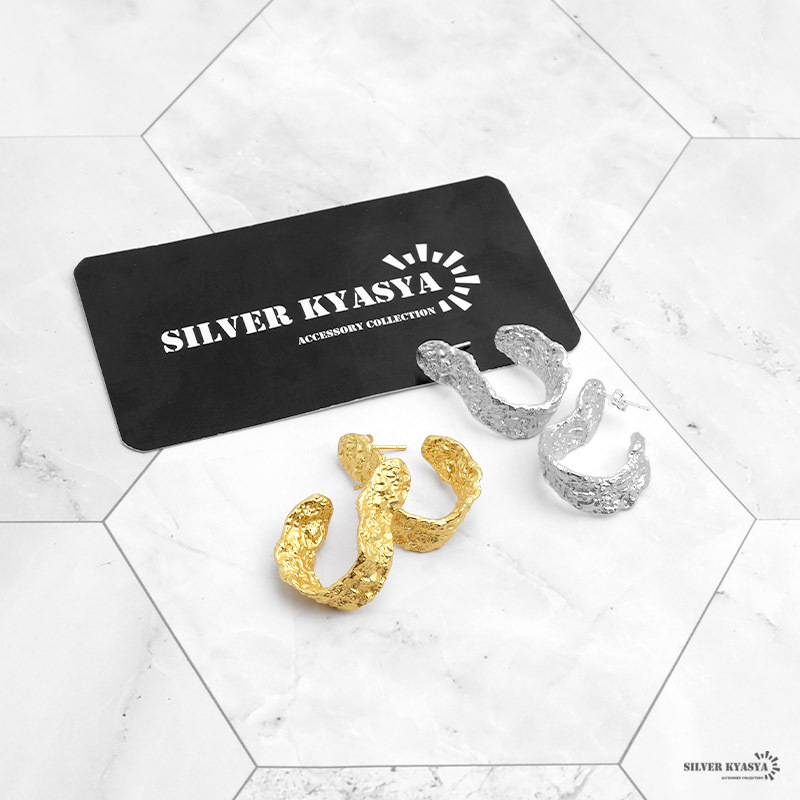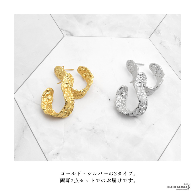 ■凹凸のある表面が光を受けて魅力的に輝くピアス。ゴールド・シルバーの2タイプから選べます。