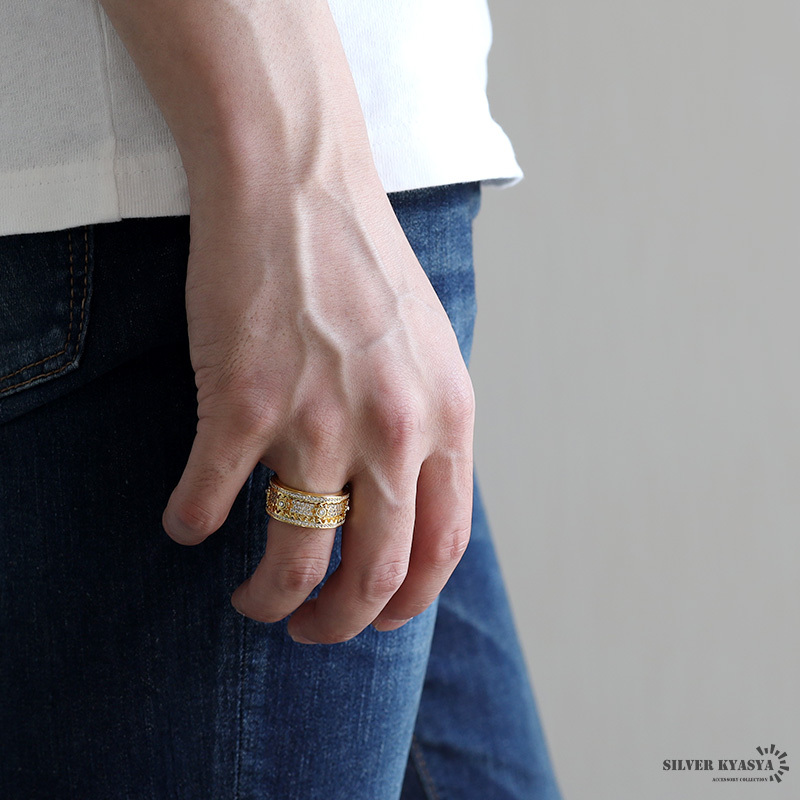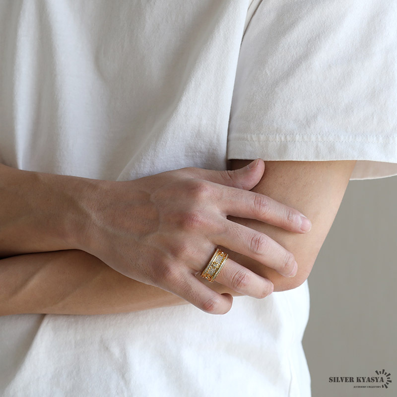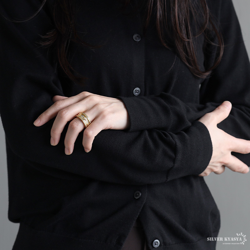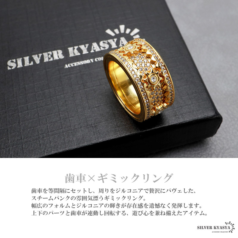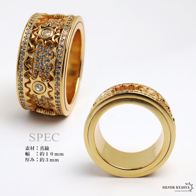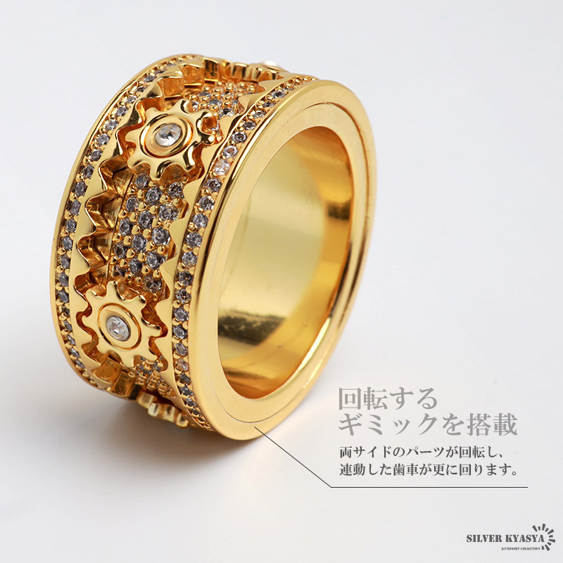 | 商品概要 | ■歯車×ギミックリング 歯車を等間隔にセットし、周りをジルコニアで贅沢にパヴェした、スチームパンクの雰囲気漂うギミックリング。幅広のフォルムとジルコニアの輝きが存在感を遺憾なく発揮します。上下のパーツが歯車が連動し回転する、遊び心を兼ね備えたアイテム。 ■18KGP ラグジュアリーな18金コーティングを施し、華やかな腕元を演出します。 |
