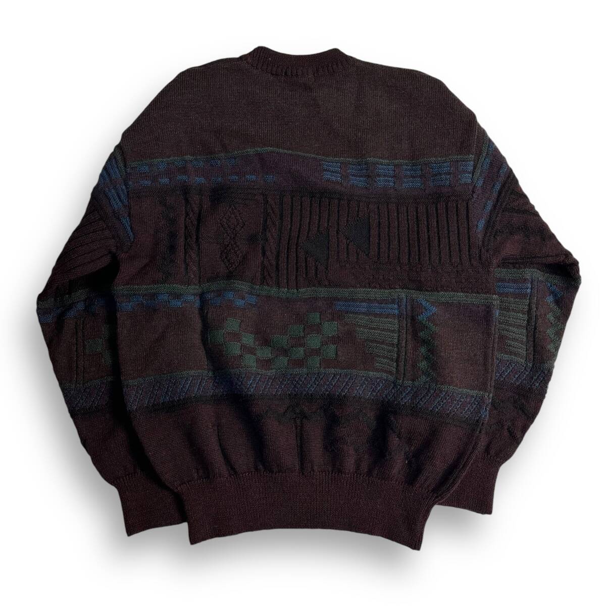 ダークトーンのカラーベースに立体デザインを施したビンテージクルーネックニット