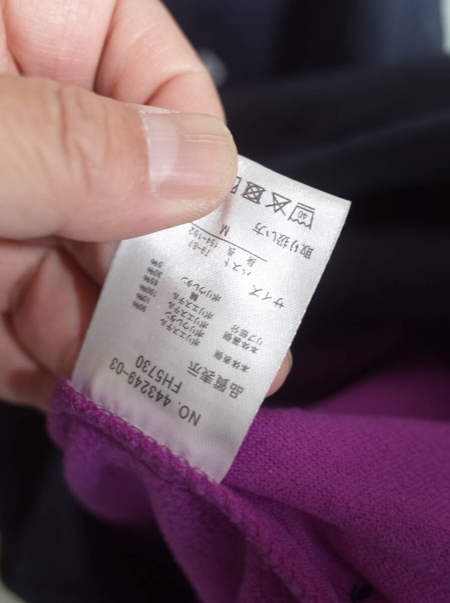 素材:ポリエステル90%ポリウレタン10%、本体裏側・ポリエステル、リブ・ポリエステル65%綿30%ポリウレタン5%