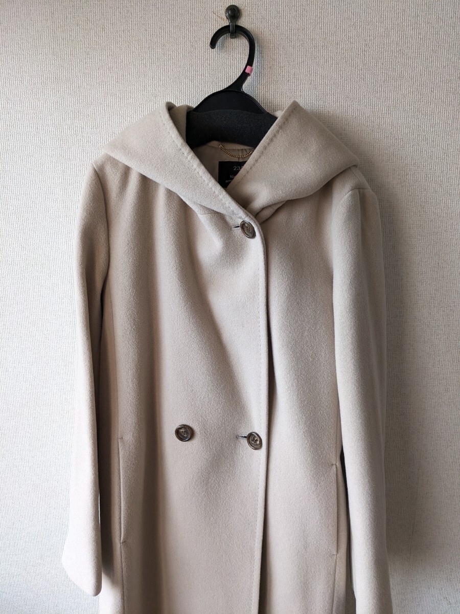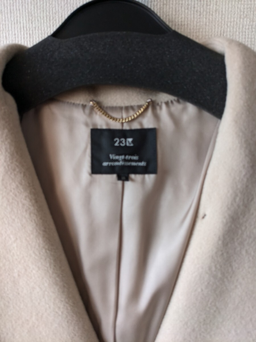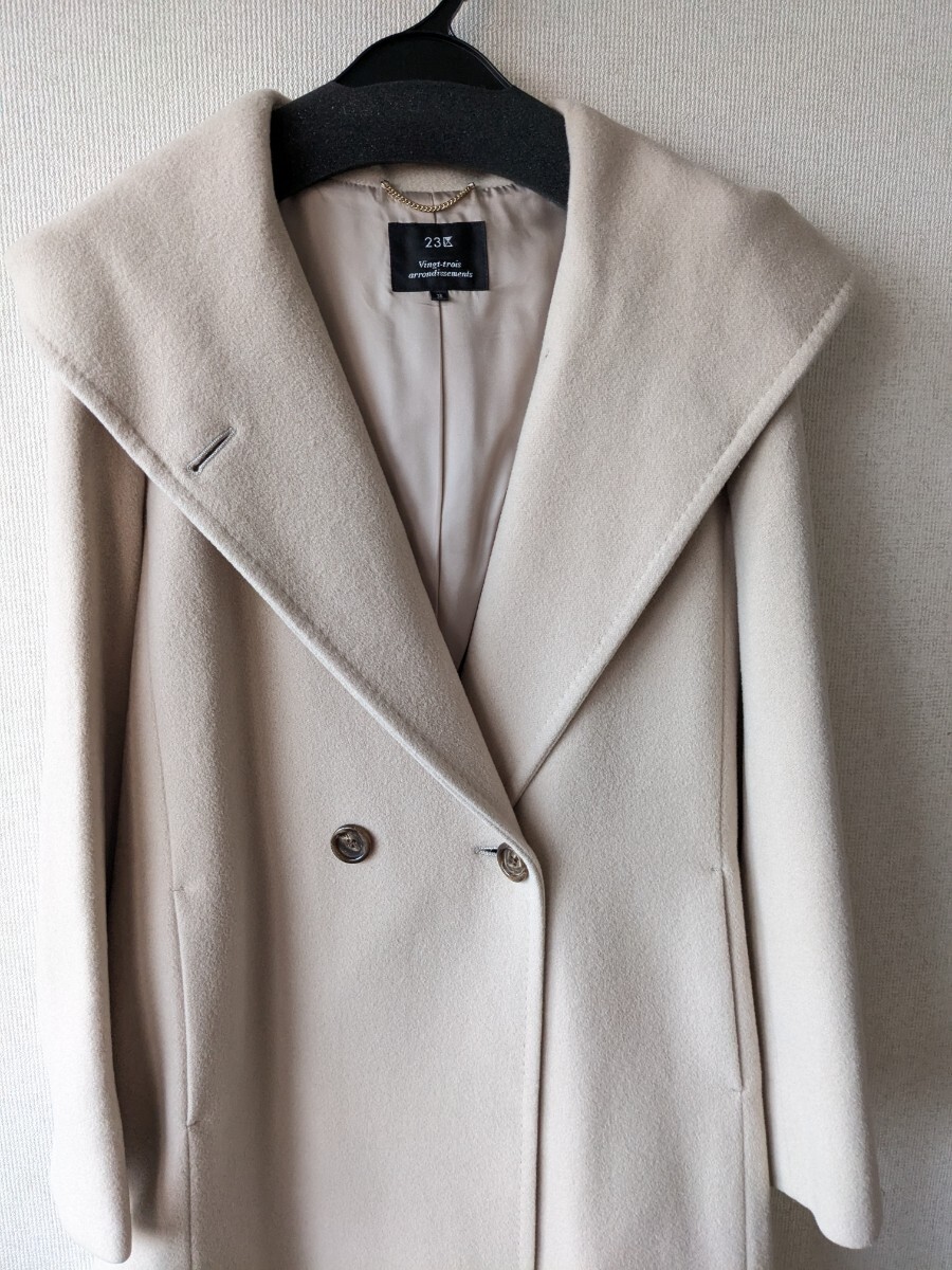 ☆羊毛素材で軽く保温力があり、スッキリとしたデザインです。上のボタンを止めると首元までしっかりと暖かいです。着用回数の少ないキレイなお品です。(参考価格6万円程)