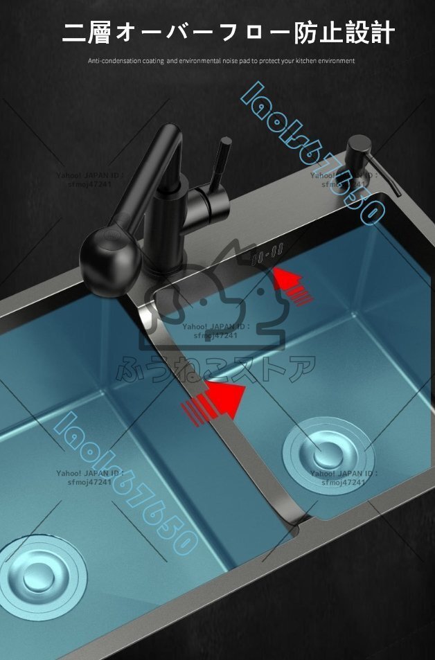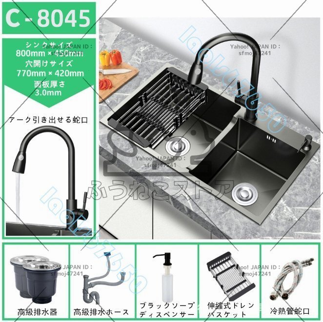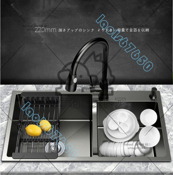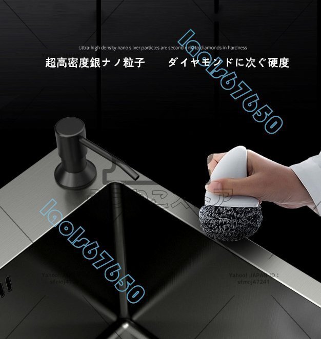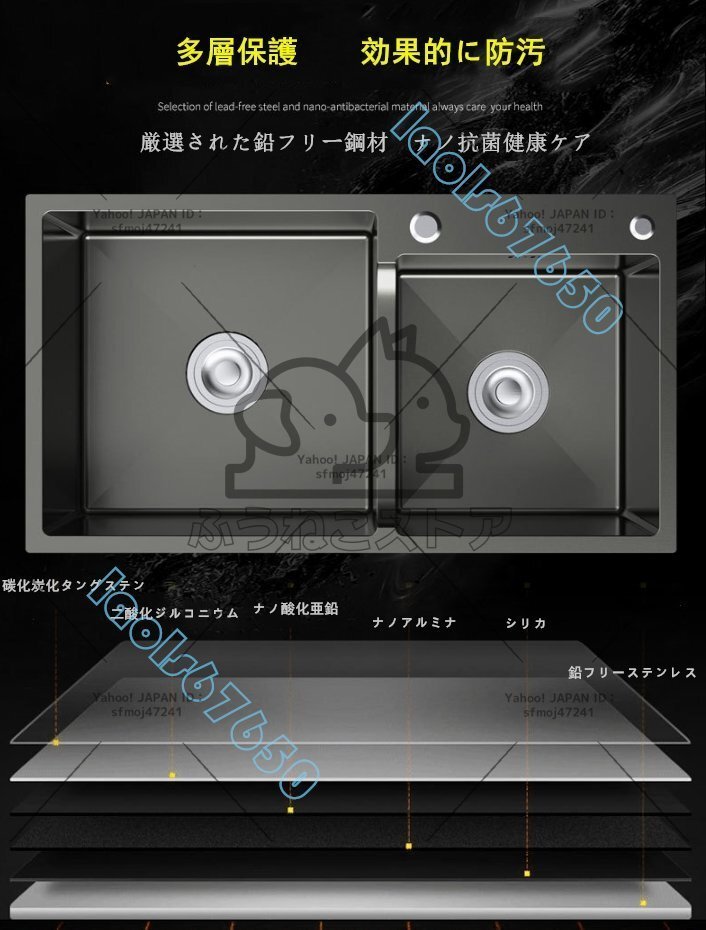 爆売り!ステンレス製流し台 台所 2槽シンク キッチン 中凹型シンク 納米技術 キッチンツール 野菜シンク ブラック黒い 大容量 80*45cm