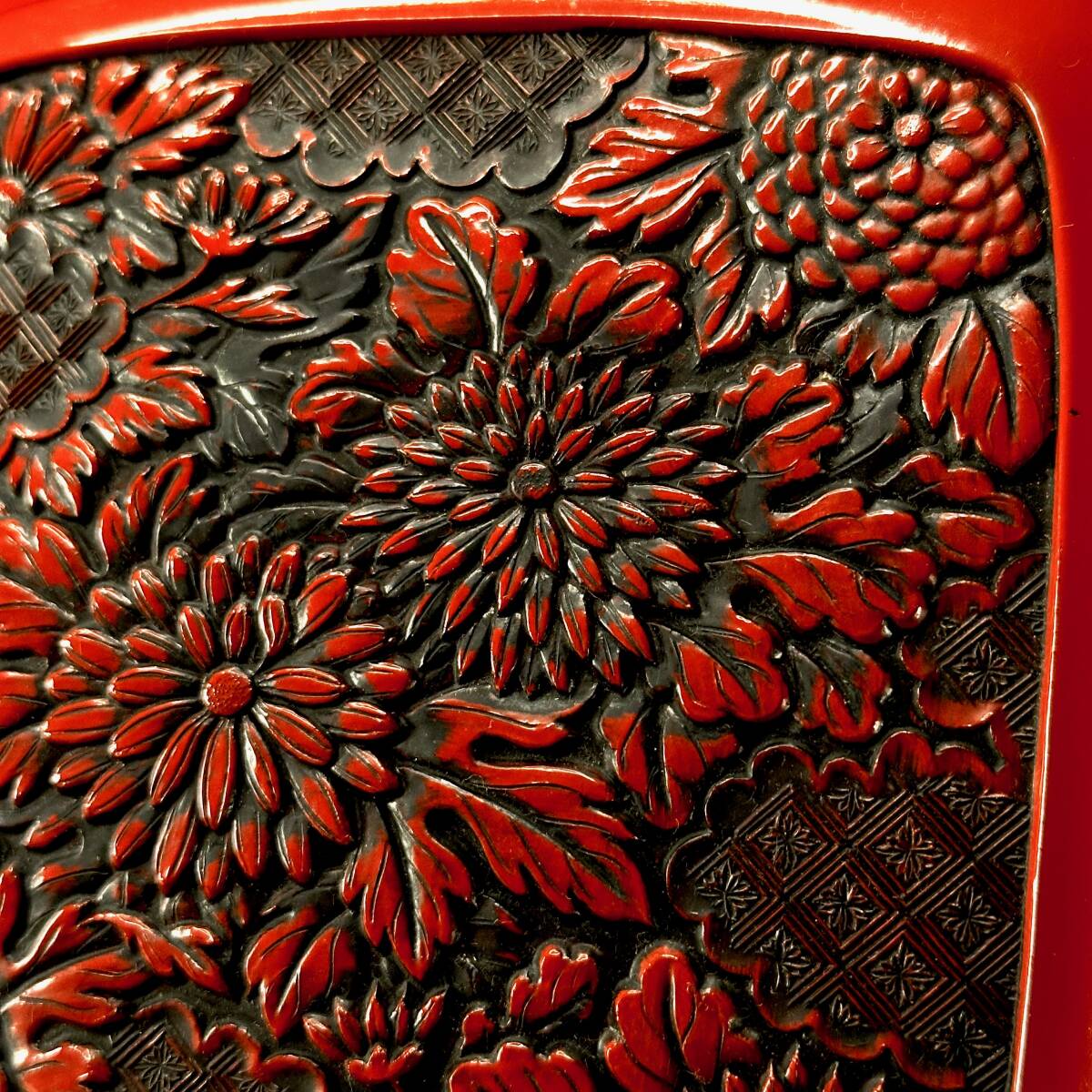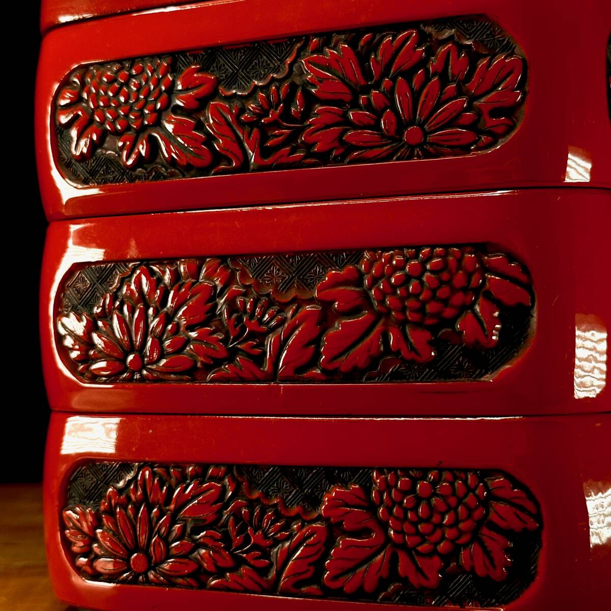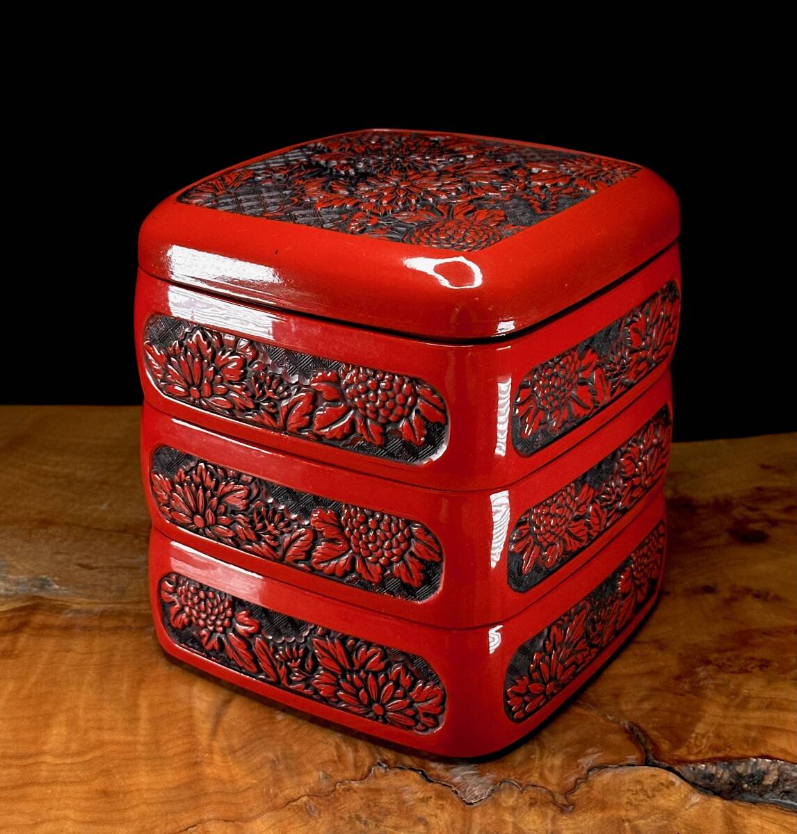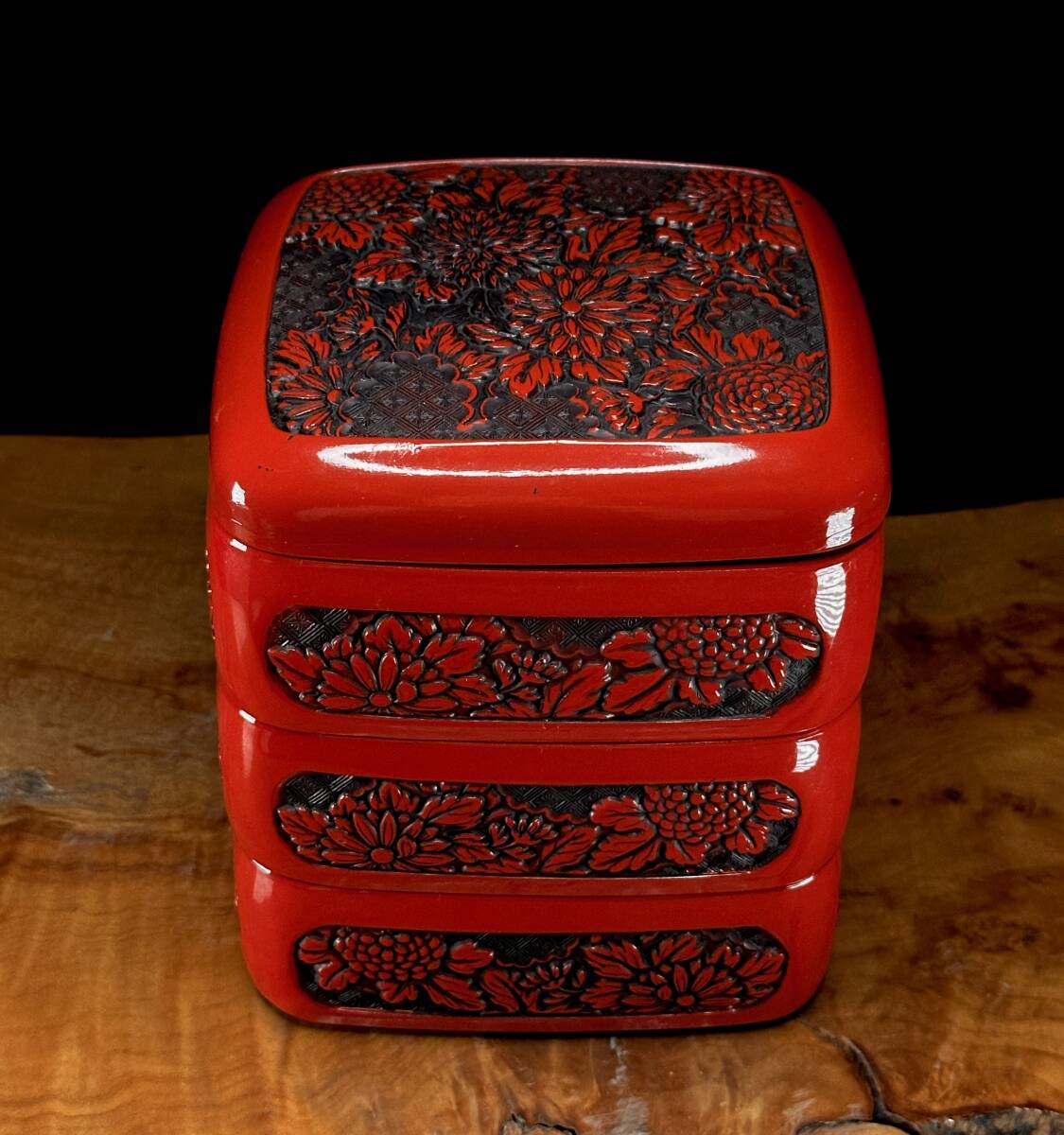 昭和ビンテージ 仙台堆朱 重箱 三段重 花文様彫刻 漆器 幅14cm 奥行き14cm 高さ16cm