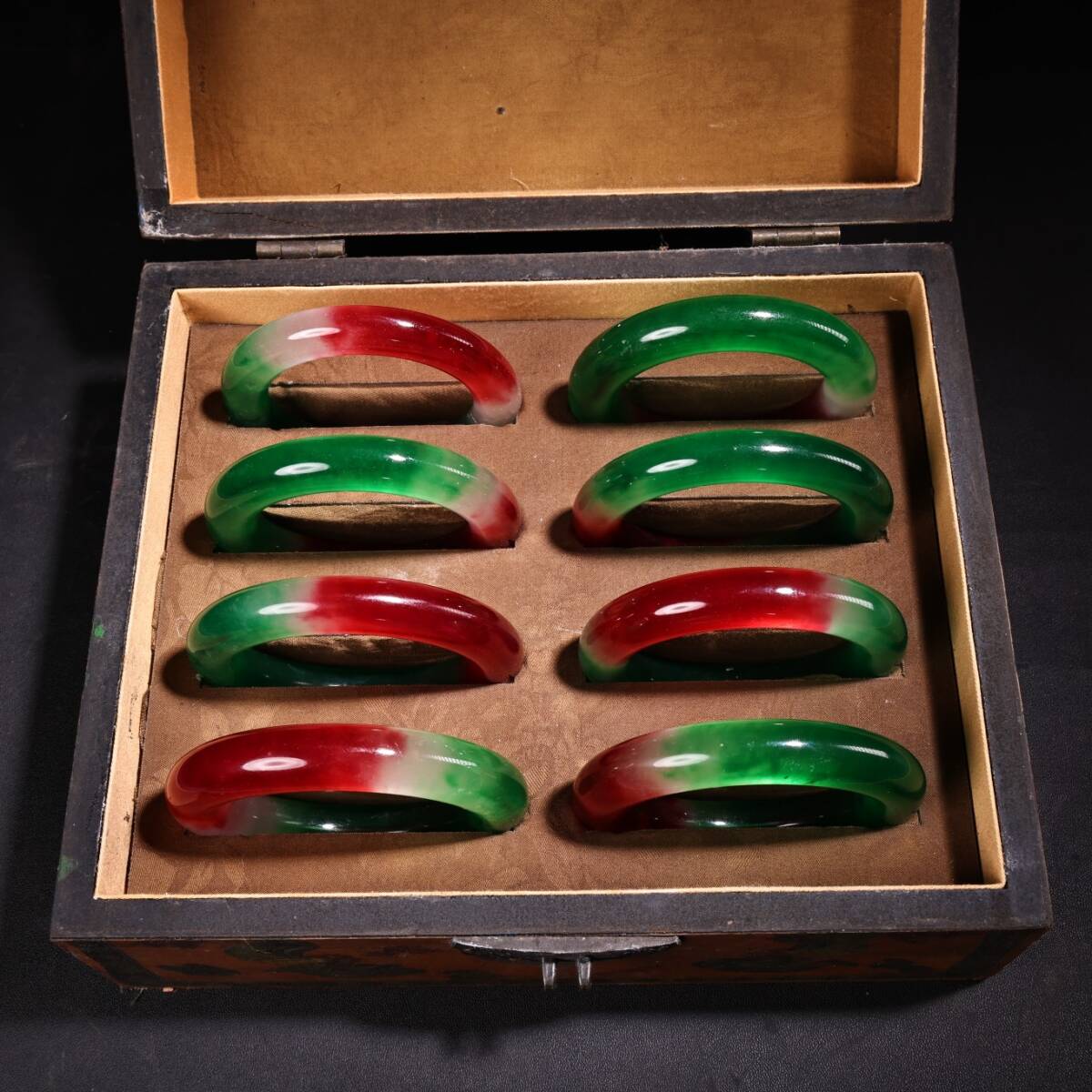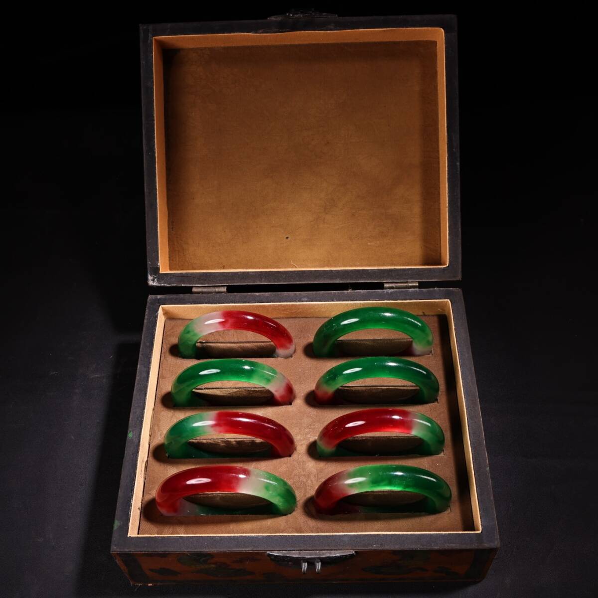 『清・宮廷御製・古高冰翡翠彫・多色翡翠・腕輪・漆器盒・箱付』極細工・東洋彫刻・骨董品・古賞物・中国古玩・中国古美術