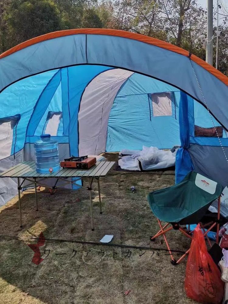 一室二ロビーで多人テント。内テントのサイズは310*200(8人用)です。寝室と休憩室があります。テーブルを置くと休憩室で食事ができます。通気窓、五つの窓(高密度防虫網糸)ナイロン袋贈ります(色はランダム出荷)