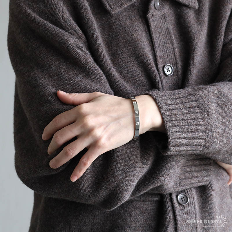 ツヤっとしたボディにストーンを添えたバングル。キラキラした見た目で華やかに手元を飾るアイテム。カラーは全3色からお選びいただけます。