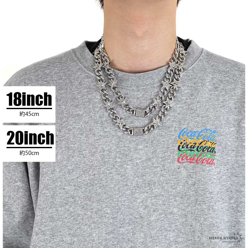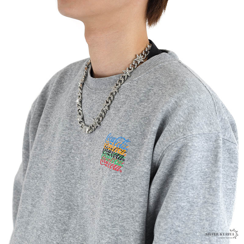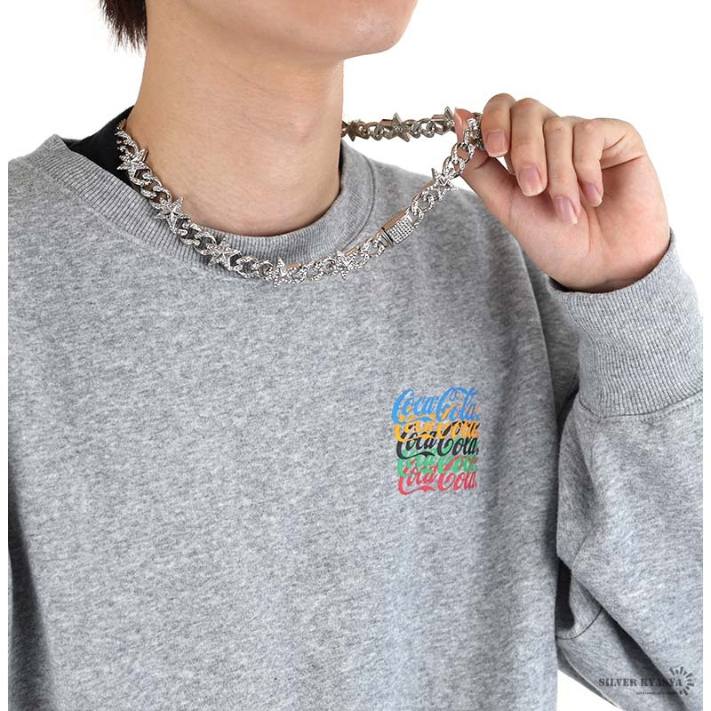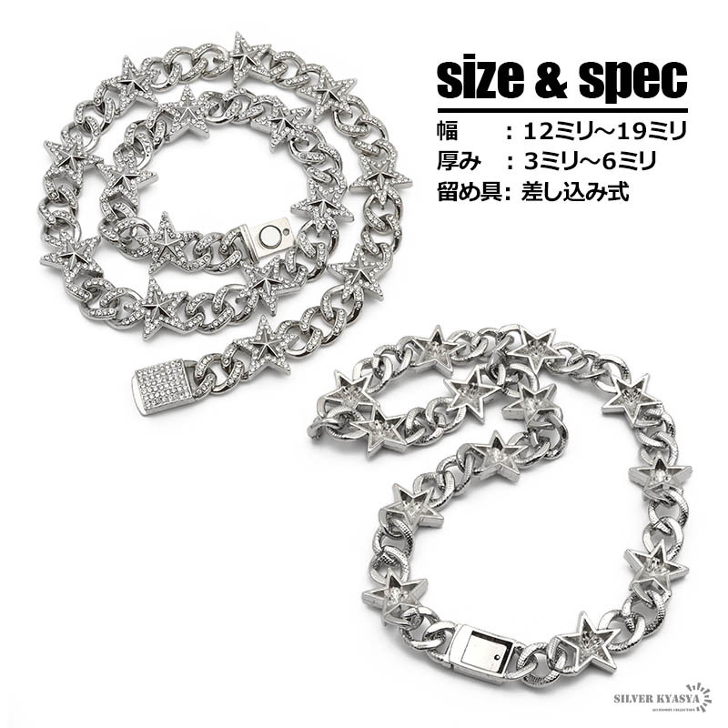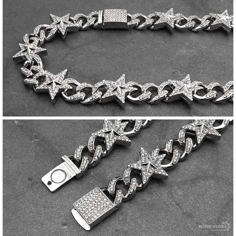 キュービックジルコニア(CZ)を敷き詰めた喜平チェーンネックレス。星のモチーフとチェーンを組み合わせた、存在感抜群なアイテム。あまり見られないユニークな一品。留め具は取り外し簡単な差し込み式。