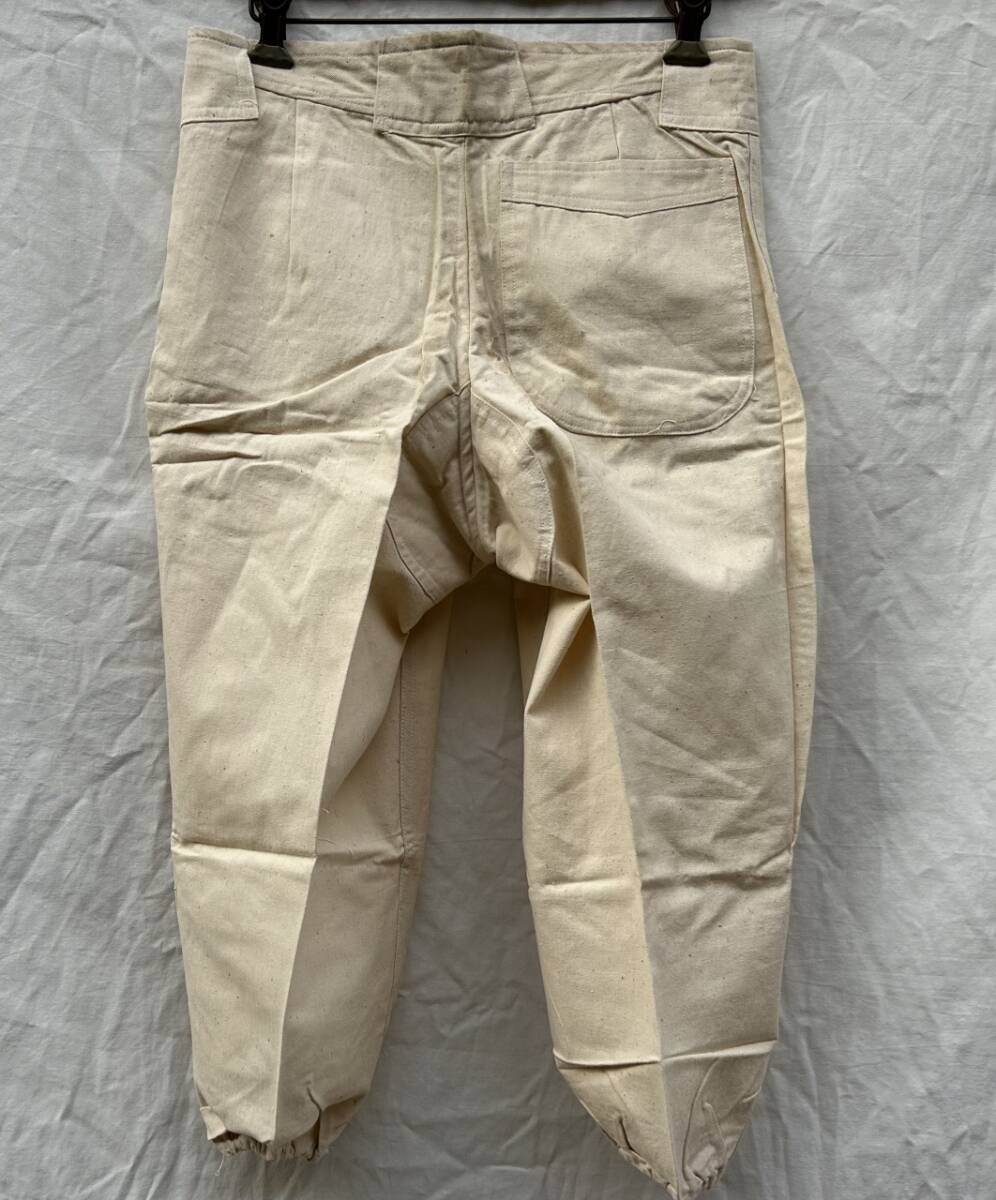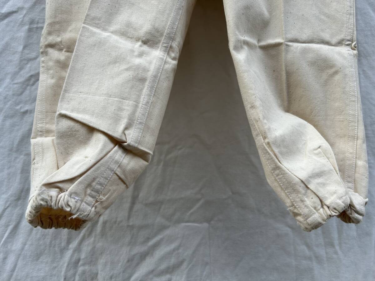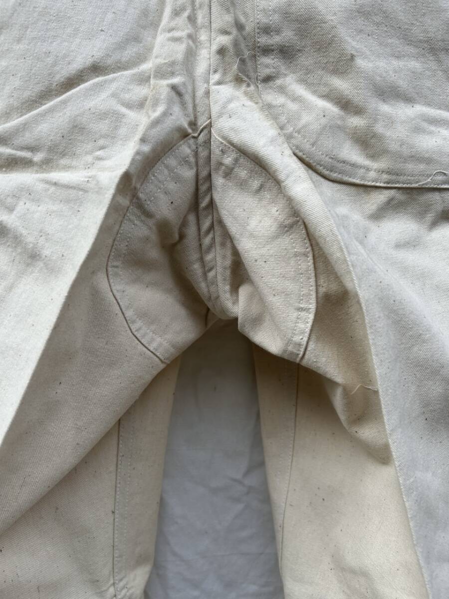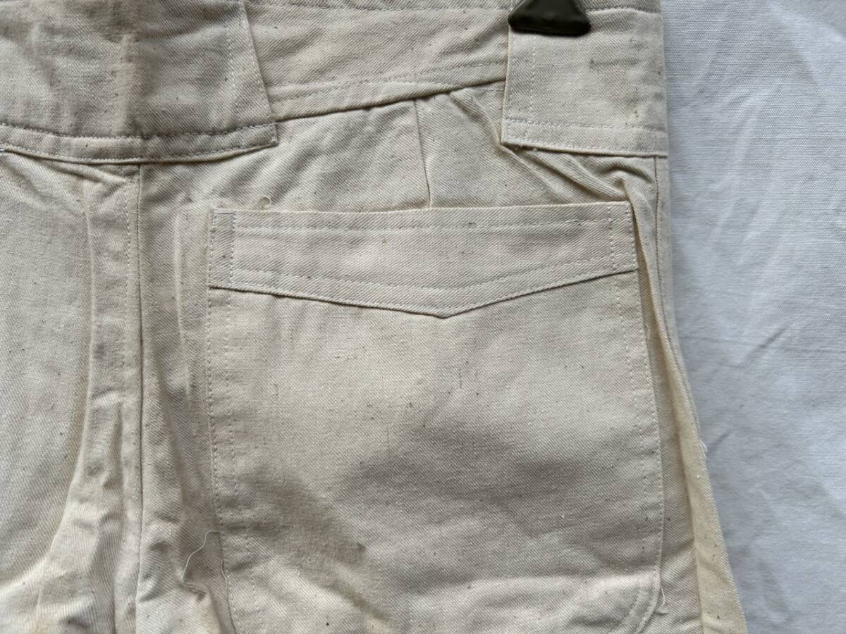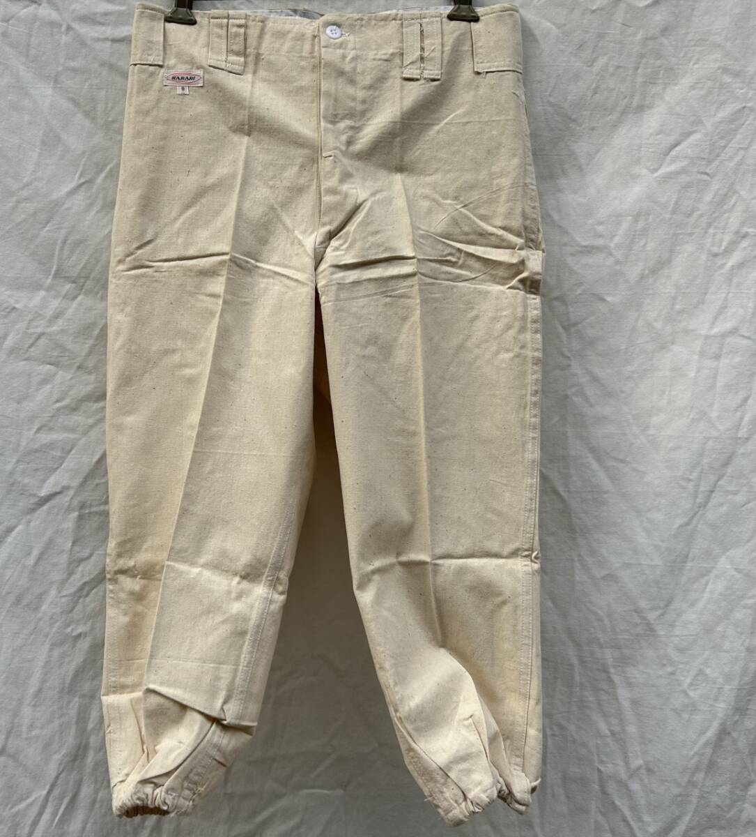 説明:極太のベルトループがいい雰囲気の古いベースボールパンツになります。ボタンフライ仕様、モンキーパッチ、右後ろのみポケットがつきます。あまりタウンユースで落とし込んで穿いている方は少ないですが非常に雰囲気のいい物です。丈短めですのでハイソックスなどと掛け合わせるのもいいですね、色々と合わせやすいので一本あると面白いかと思います。気になる方はお早めに!!