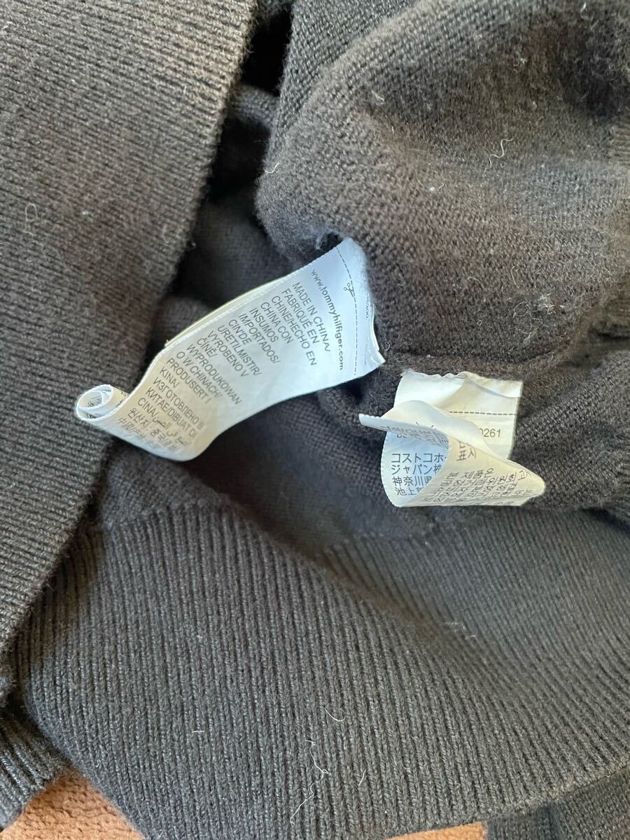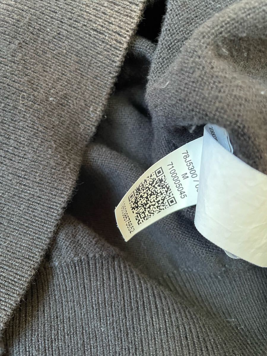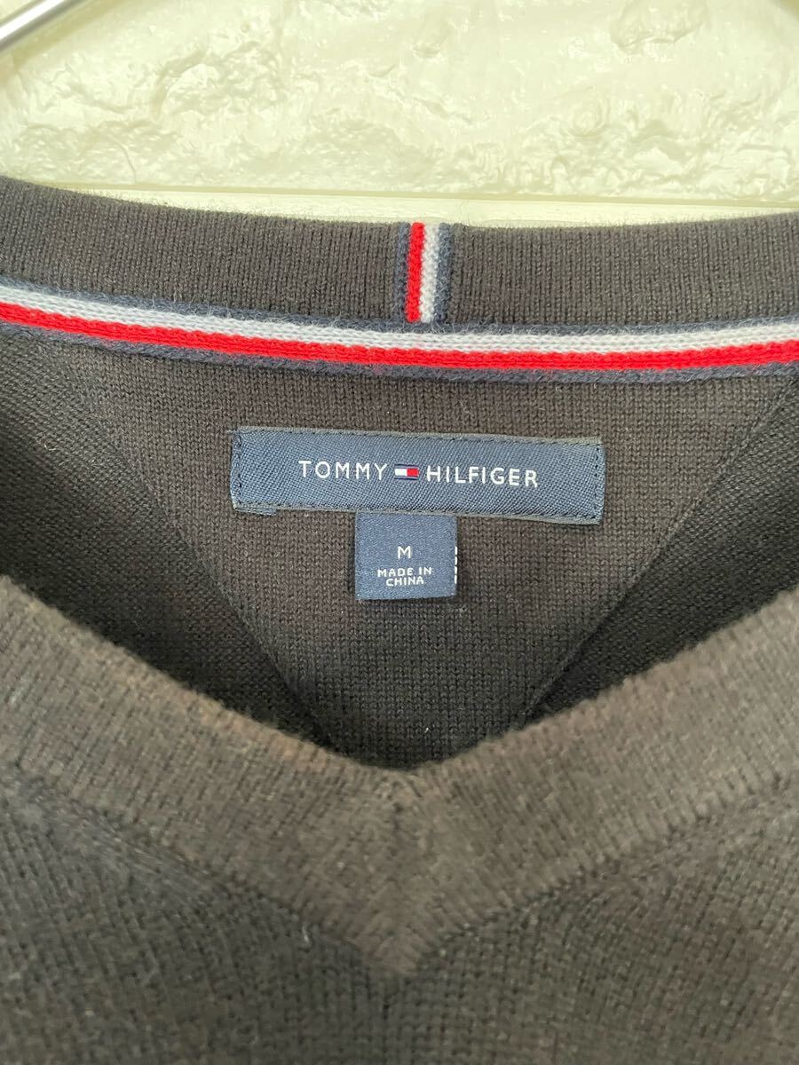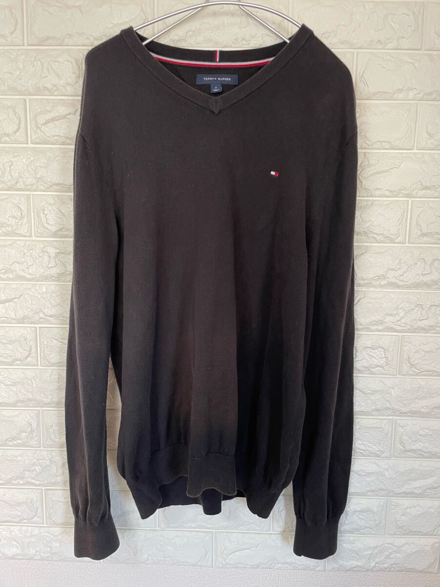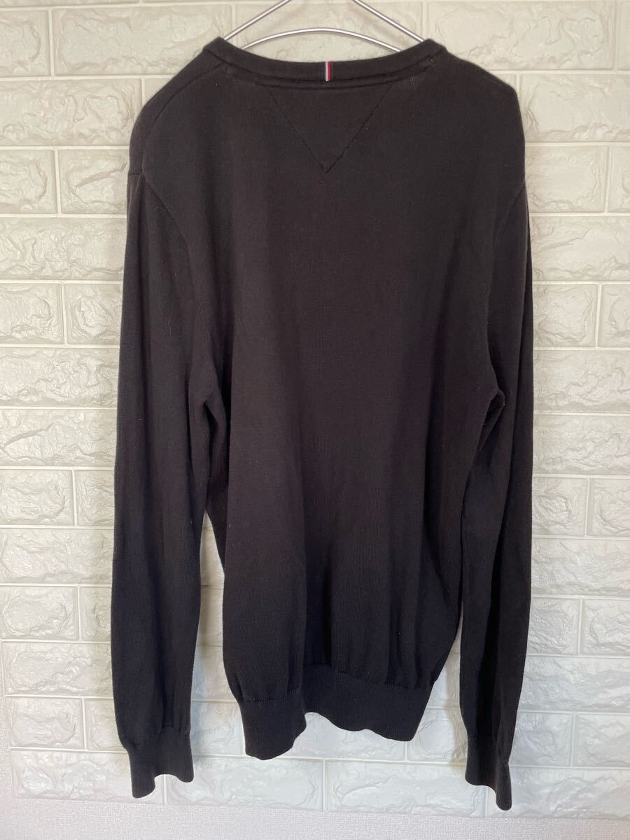 ブラックのVネックカットソー、リブ編み袖口、サイズM。