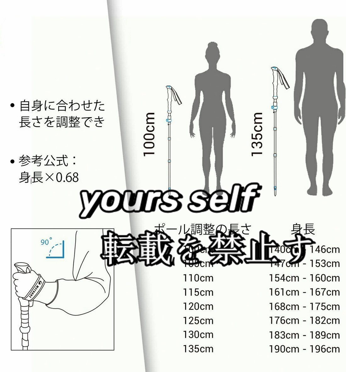 トレッキングポール 折りたたみ式 2本セット 超軽量 ◆1.【2本セット】トレッキングポール 折りたたみ式 2本セット 超軽量。 ◆2.【超軽量&耐久性】トレッキングポール本体は、アルミ合金製で超軽量かつ強度もしっかり確保。それで、耐久性もあるアルミニウムは耐熱性と防腐性にも優れています。 ◆3.【折り畳み式&3段式伸縮シャフト】ハンドルの部分を外して長さを36cmに折り畳むことができるので、持ち運びにとても便利です。 折りたたんだ後は、バックパックに収納できます。3段伸縮機能を搭載していますので、110CMから130CMまで調整できます。子供から身長180cm以上の大人まで適用です。 ◆4.【お手触り快適】レバーロック式で長さ調整も簡単、素早くロックできます。グリップにはEVA素材を使用、汗をかいても滑り難くフィット感も最高です。 ◆5.【使用便利】高品質キャリングバック+タイラップで簡単収納。持ち運びも楽です。 ・重さ:約280g(1本当たり) ・長さ:110~125cm ・収納サイズ:34cm