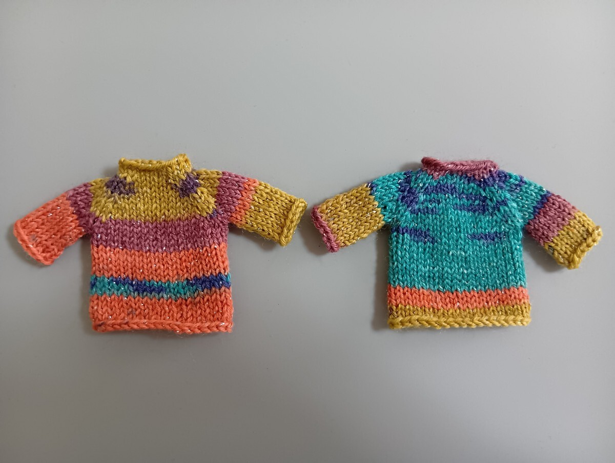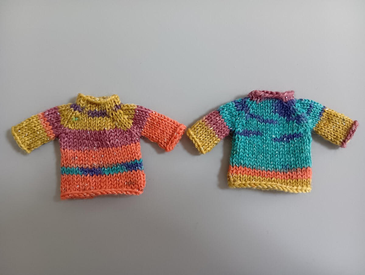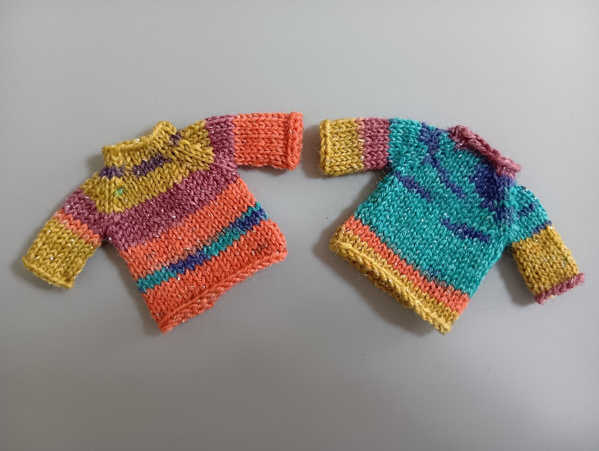 ラメがかわいいopal毛糸でミニセーターを編みました。2点セットです。 オーナメント、ガーランド、ストラップ、ブローチなどにいかがでしょうか。