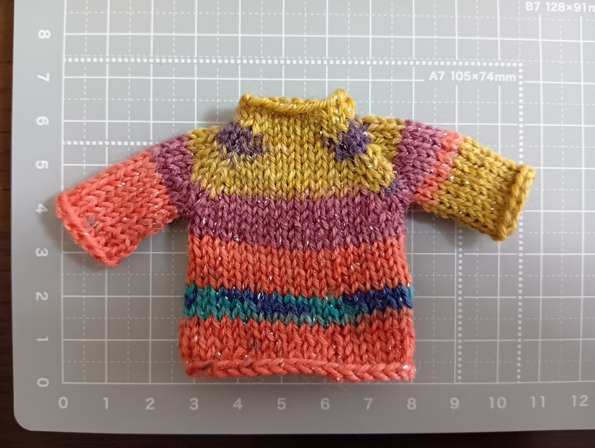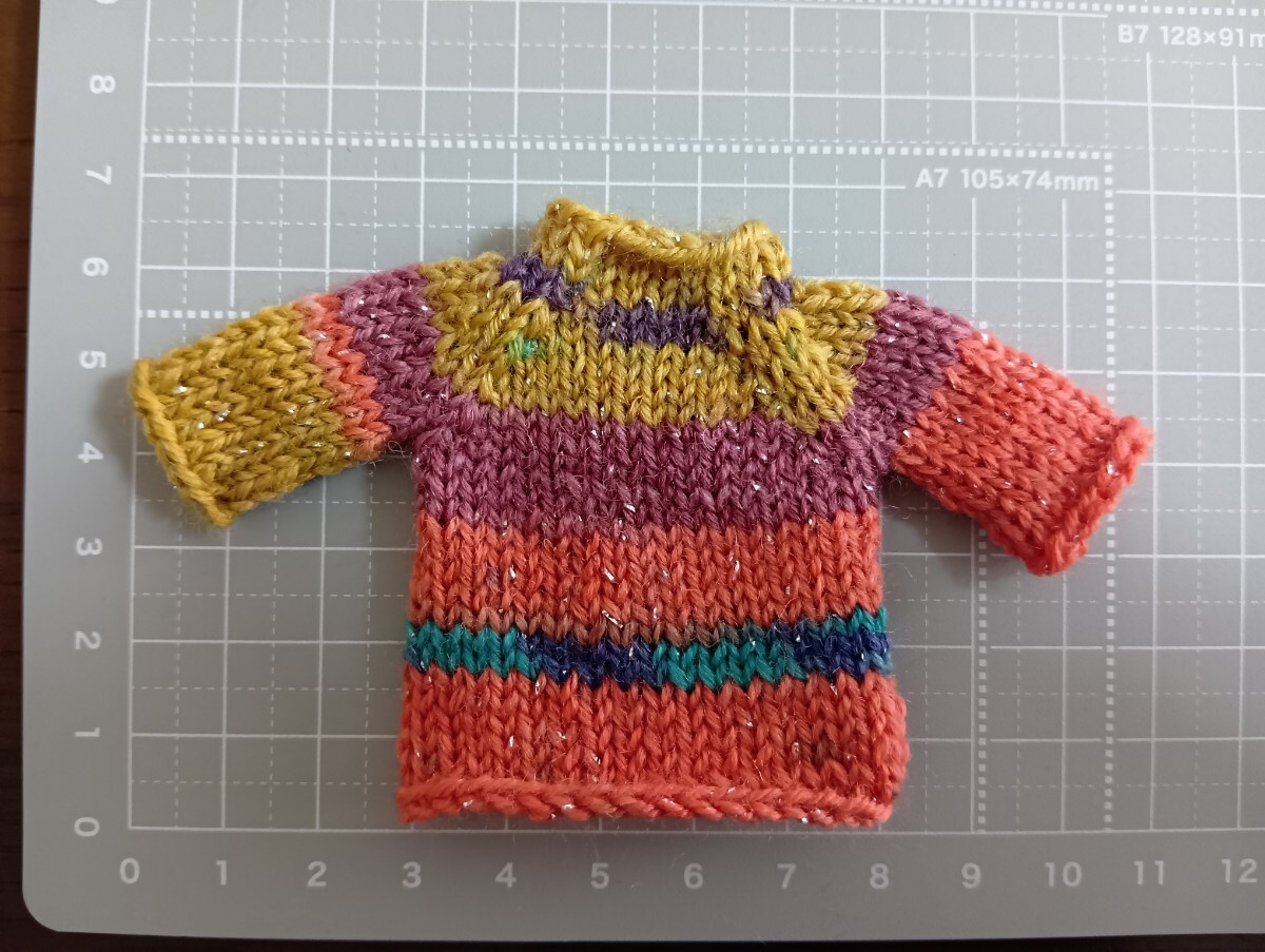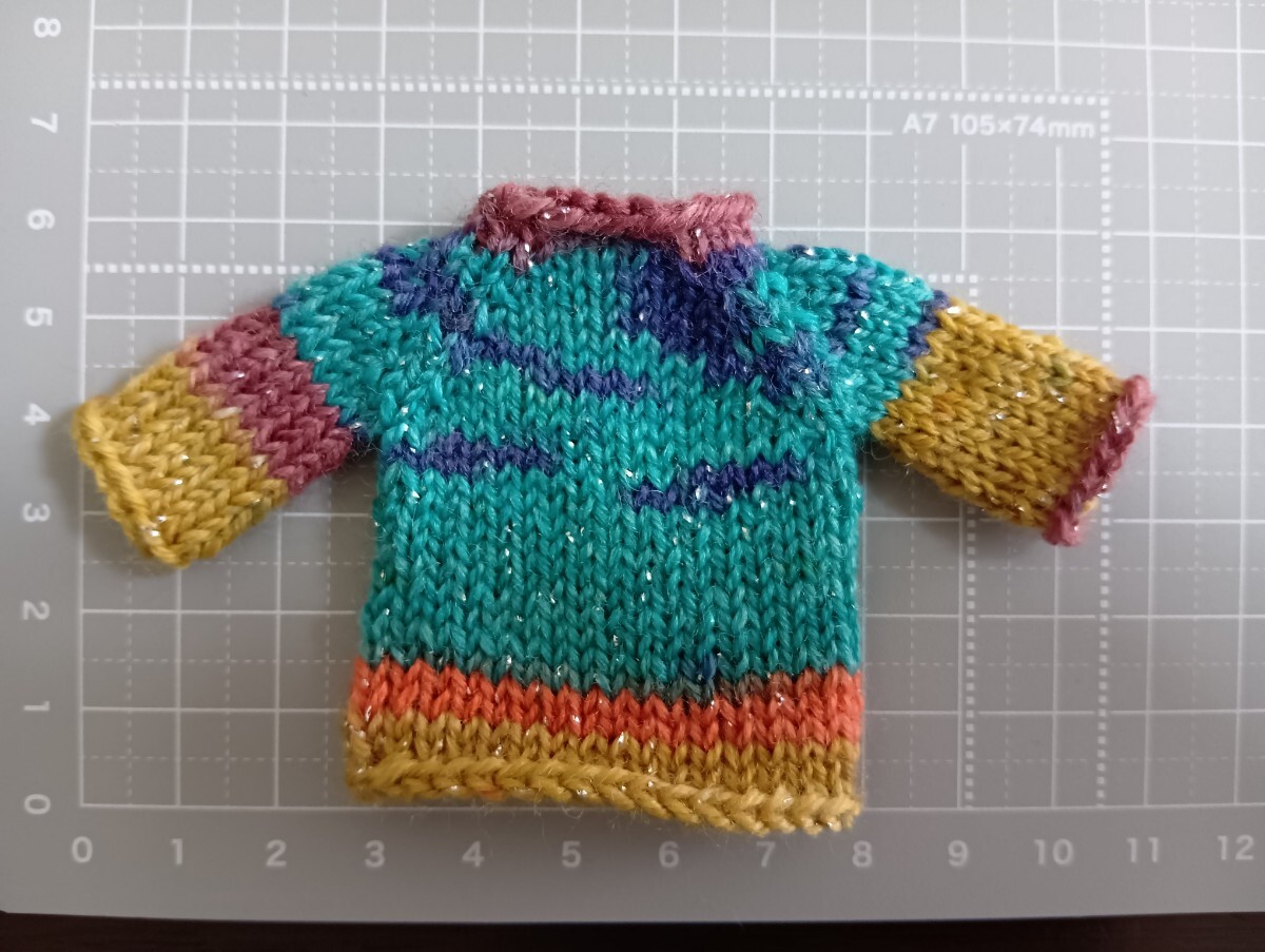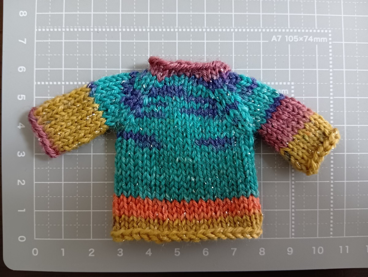 ラメがかわいいopal毛糸でミニセーターを編みました。2点セットです。 オーナメント、ガーランド、ストラップ、ブローチなどにいかがでしょうか。