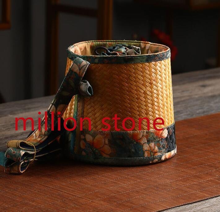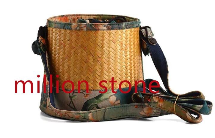 レトロ竹編みバケツバッグ*ハンドバッグ**女国風サテンプリント文芸斜め掛けバッグ**収納キャリーバッグ