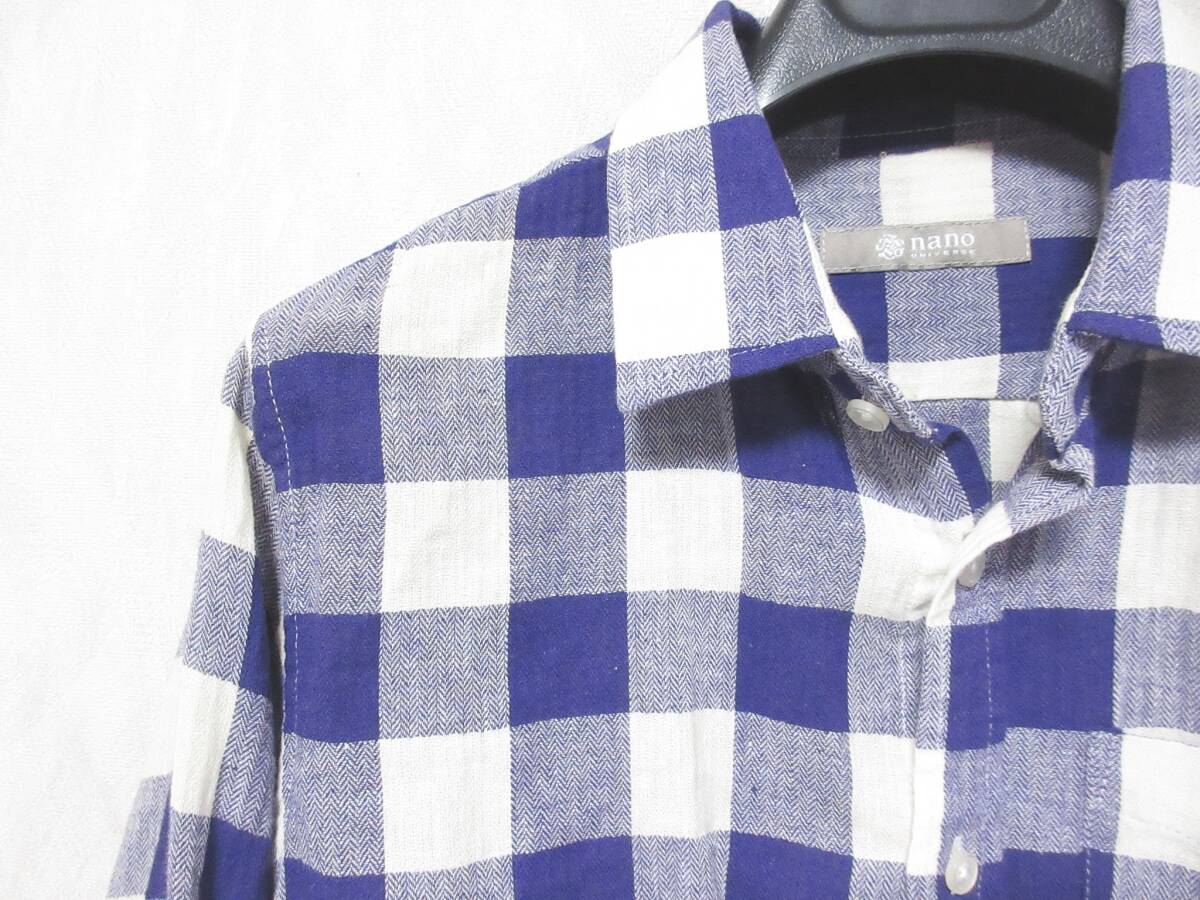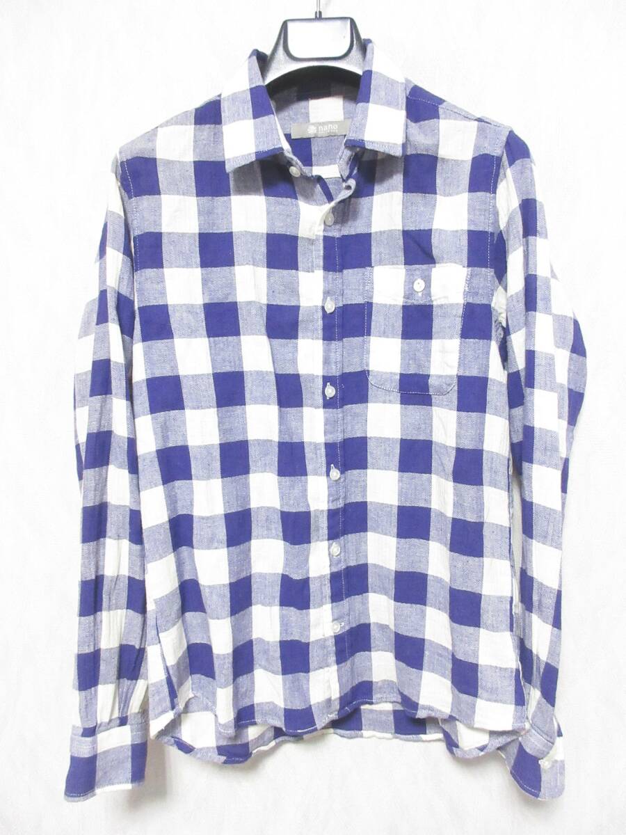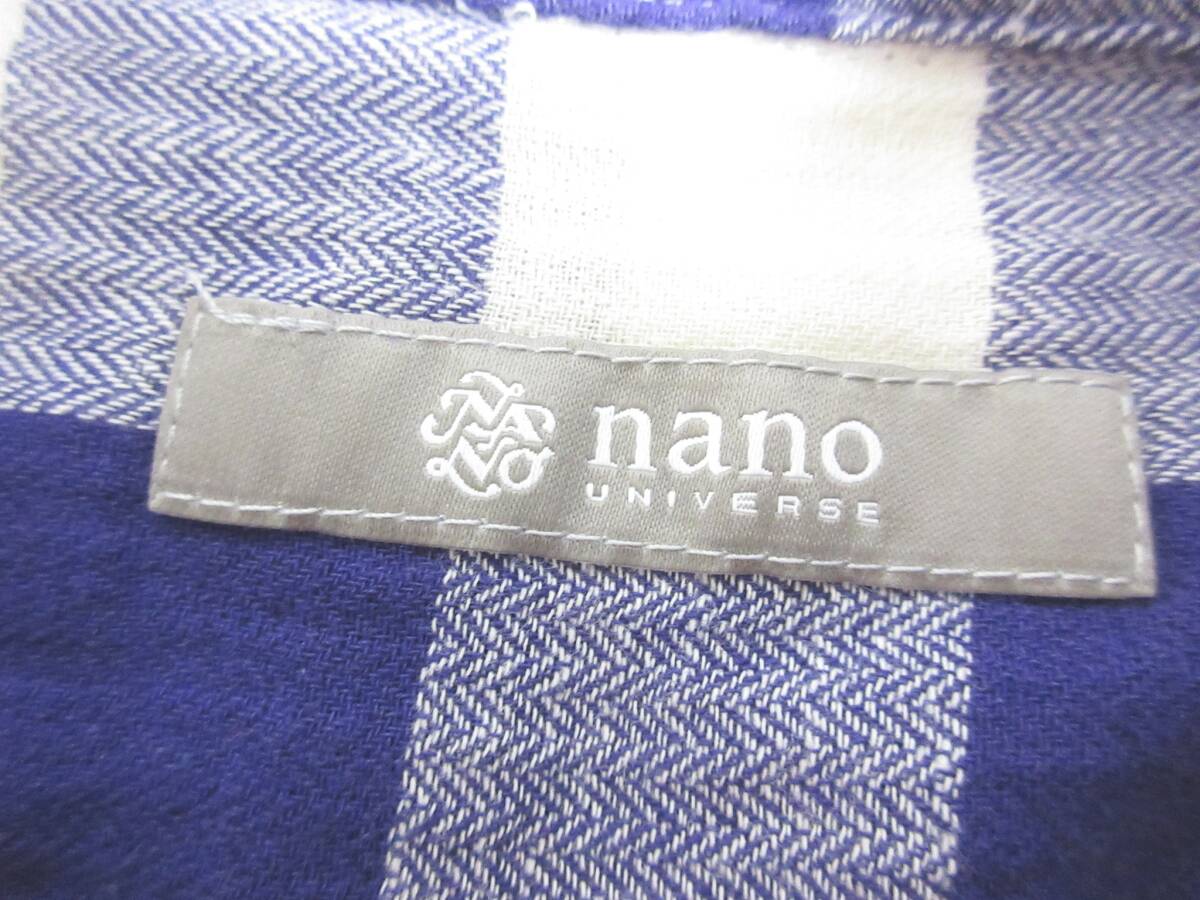 ナノユニバース nano・universe チェック柄 コットン リネン 長袖 シャツ 紫 白 S 亥5279