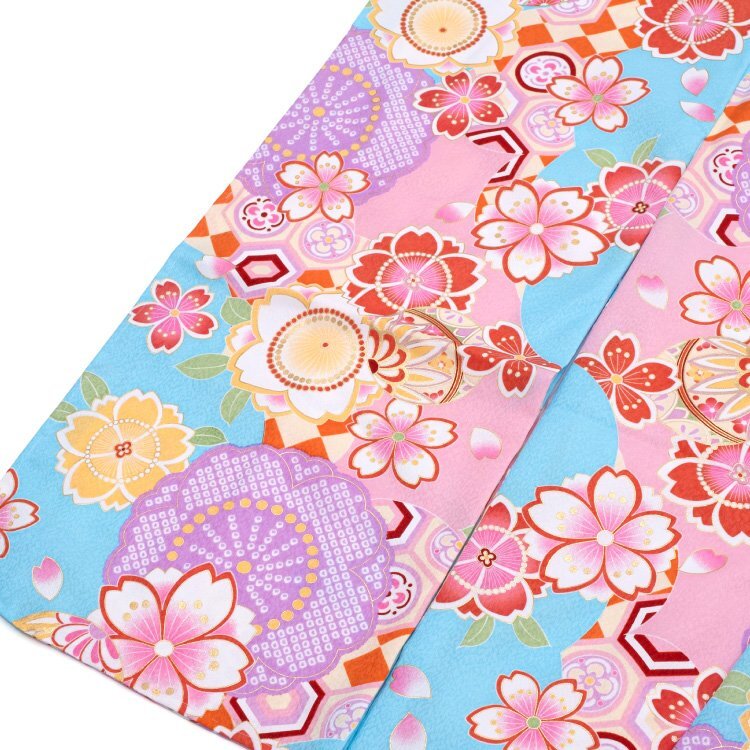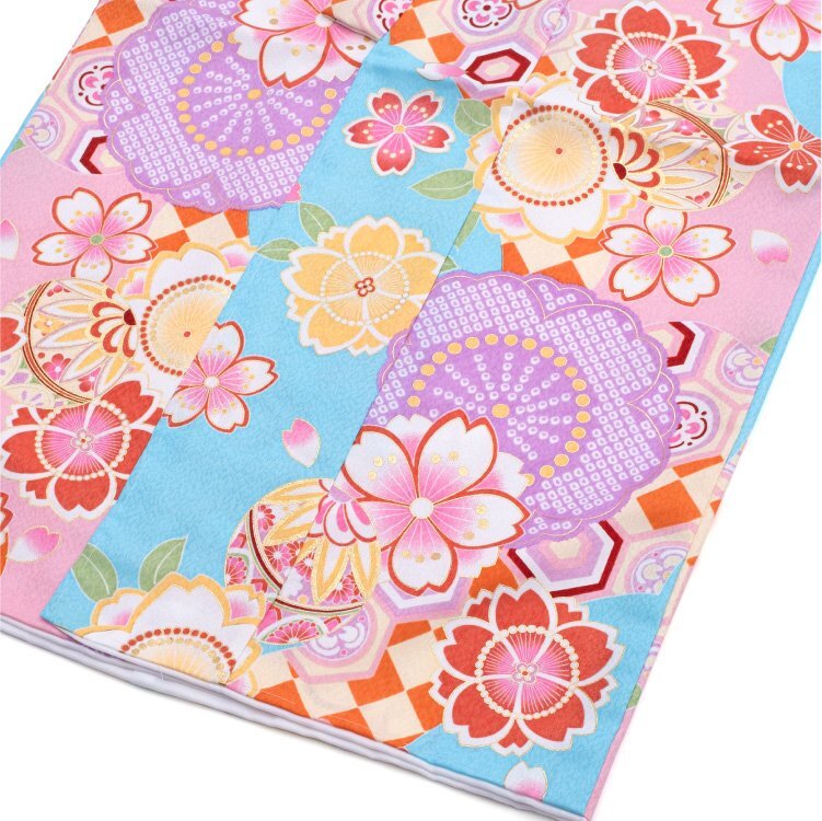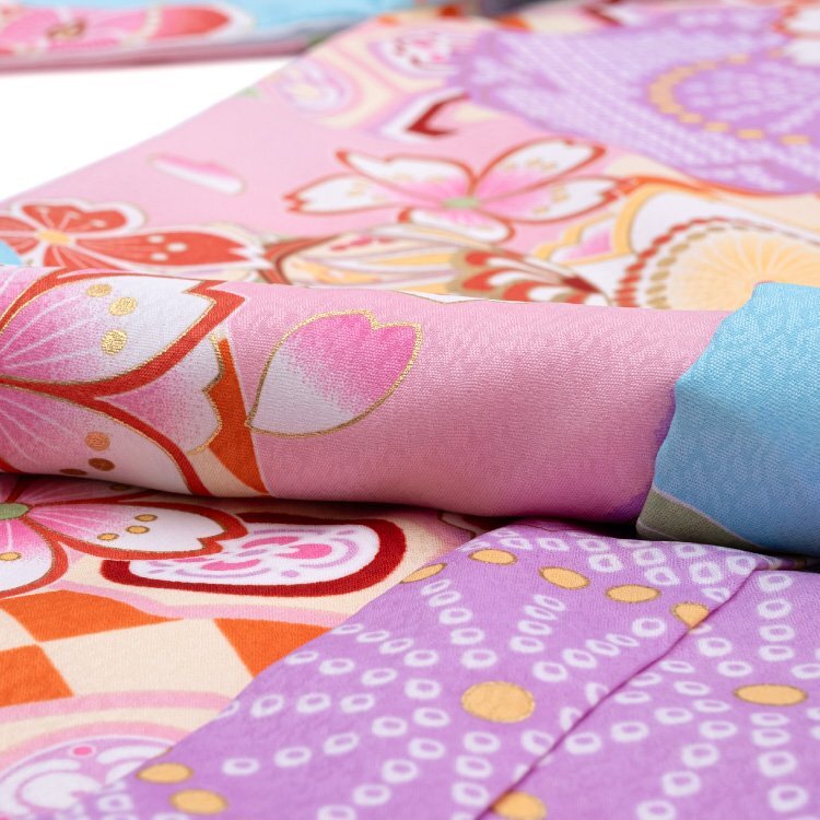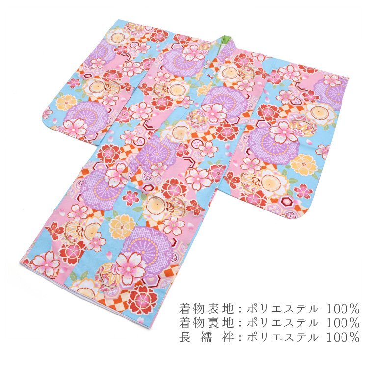 | 素材 | 着 物 : ポリエステル 100% 長襦袢 : ポリエステル 100% 結び帯 : ポリエステル 95%・ナイロン 5% 帯揚げ : 正絹 100% しごき : ポリエステル 100% |