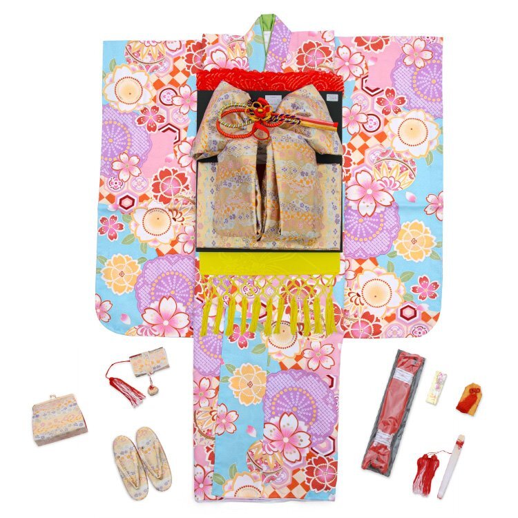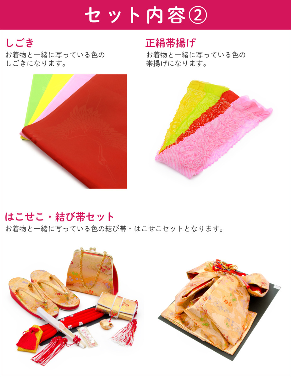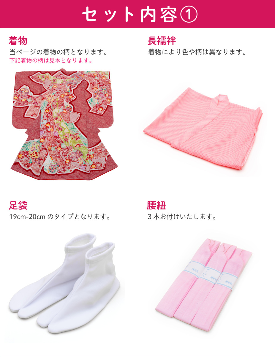 | 商品説明 | 着物・重ね衿・長襦袢・結び帯・草履・バッグ・筥迫・末広・帯締め・お守り・かんざし・帯揚・しごき・足袋・子供用腰紐3本が付いたフルセットです。 たくさんの花柄が描かれています。 御祝着に最適な賑やかな柄になります。 |