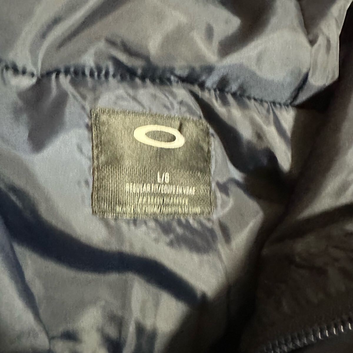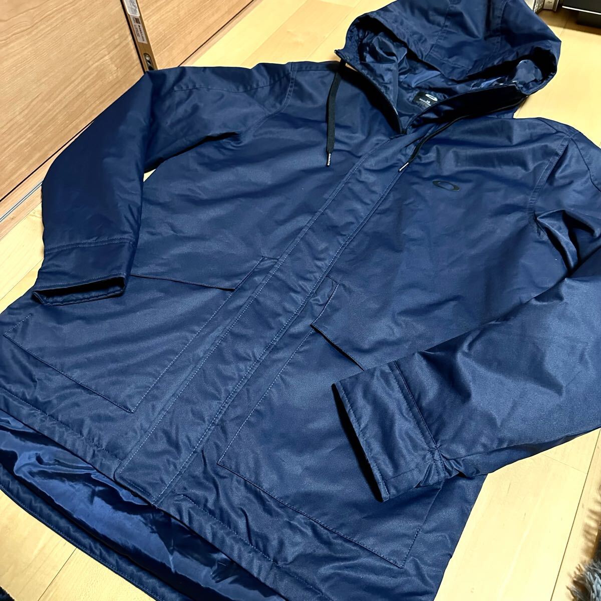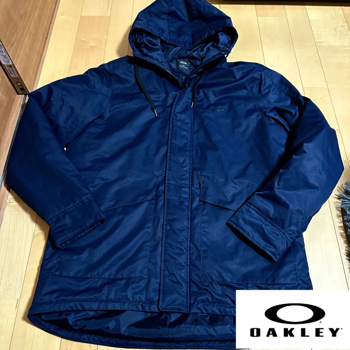 オークリースカル L(XL程度)★フード付き中綿ジャケット ネイビー系 メンズ ロゴ プリント 高級ゴルフブランド