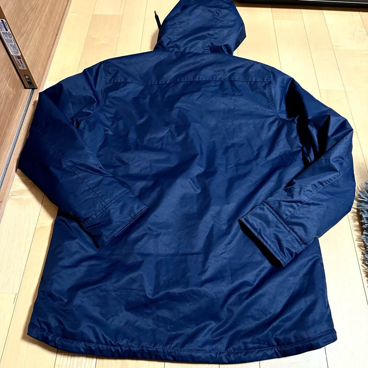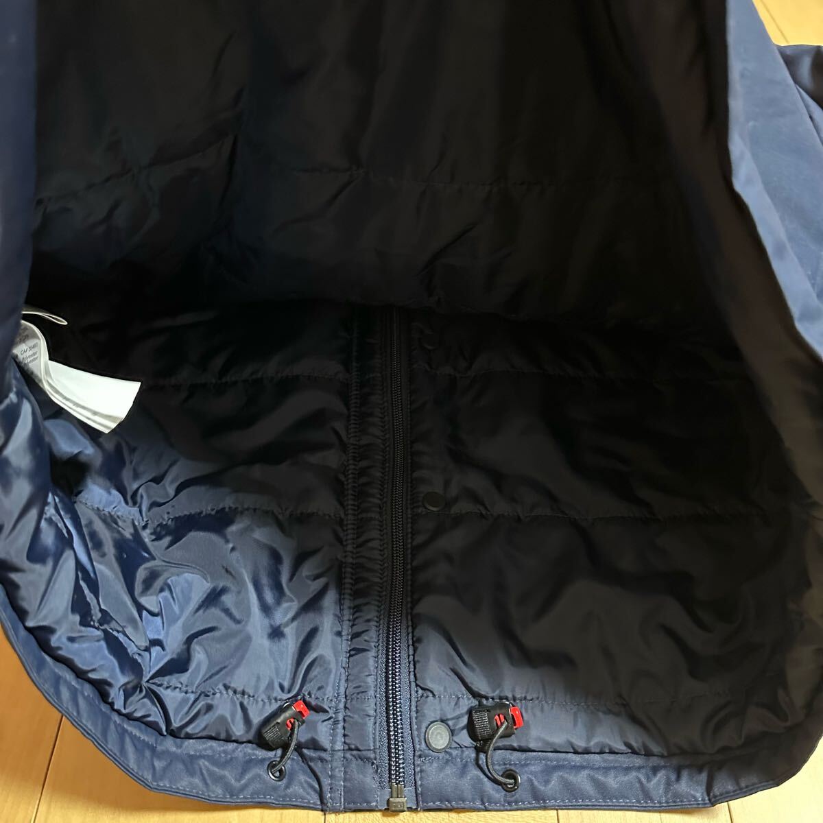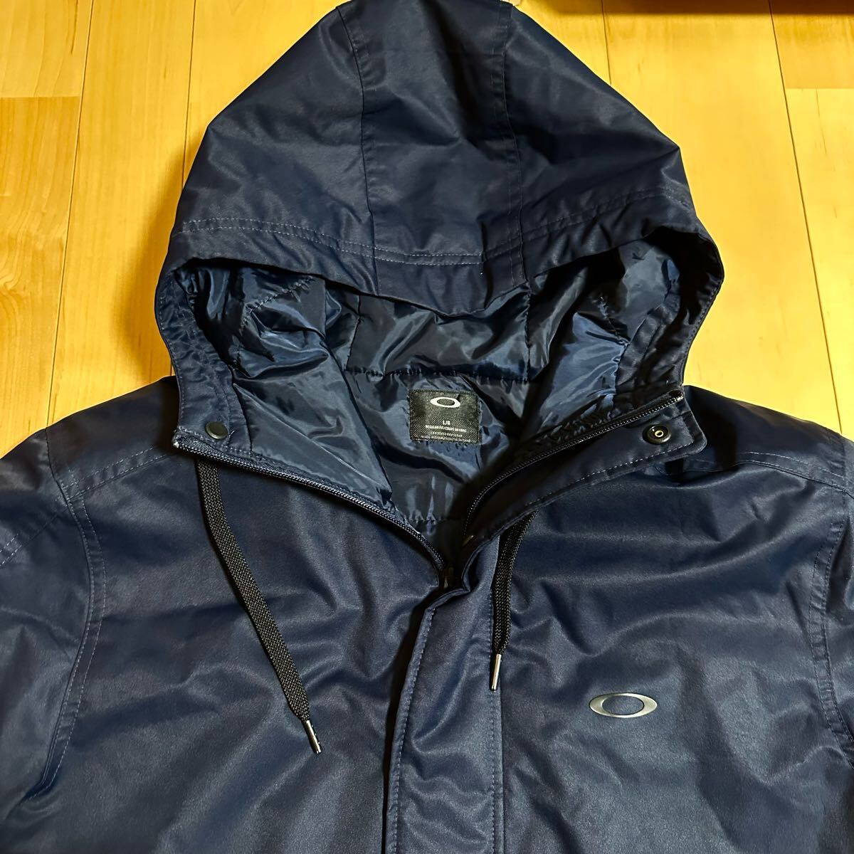 オークリースカル L(XL程度)★フード付き中綿ジャケット ネイビー系 メンズ ロゴ プリント 高級ゴルフブランド