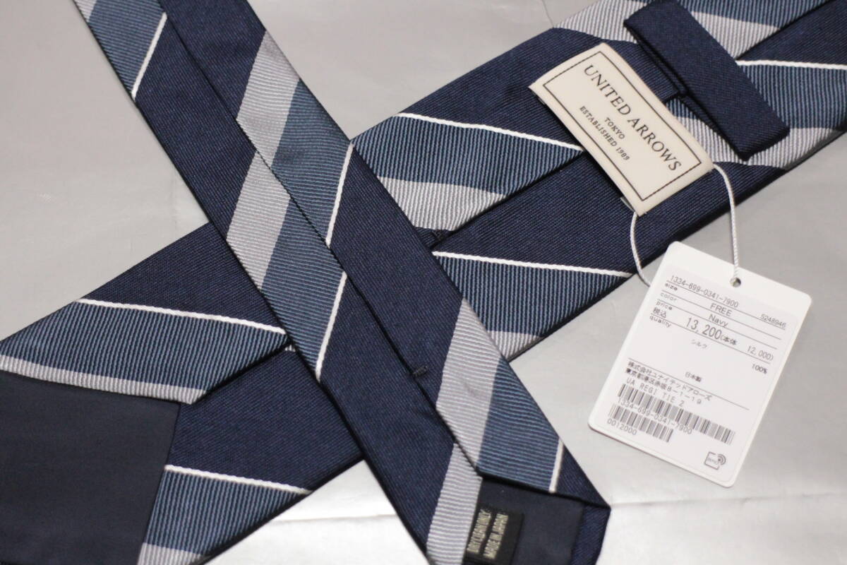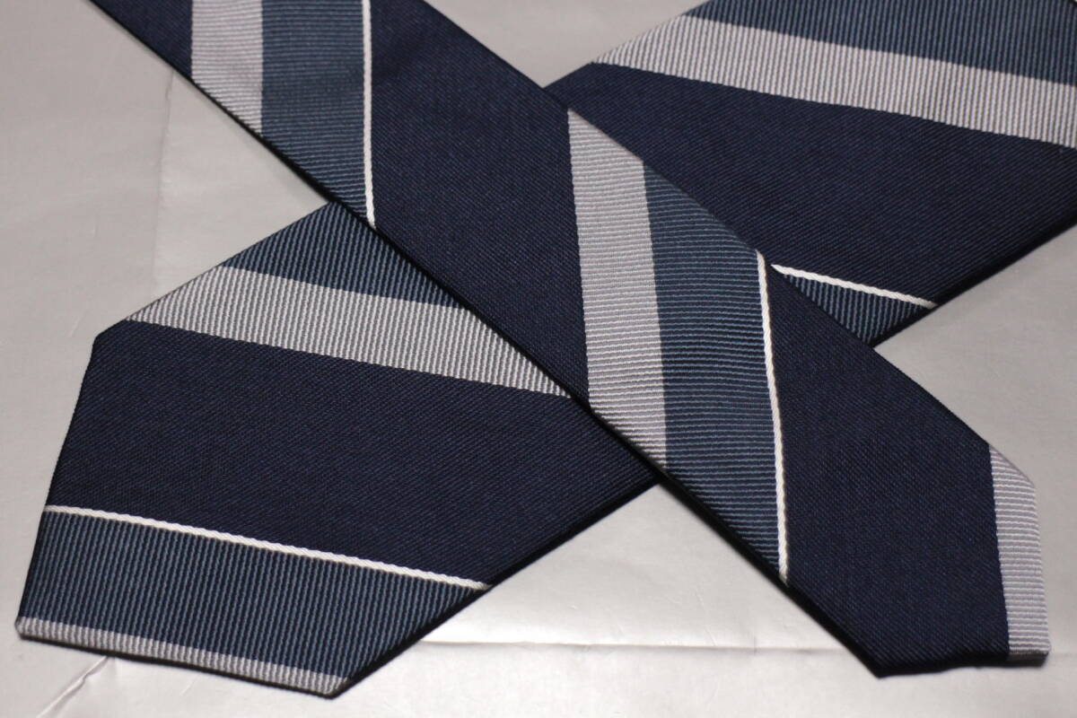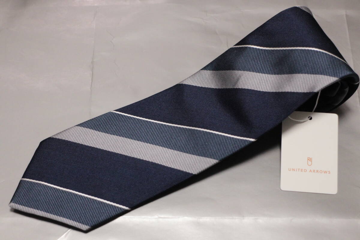 ユナイテッドアローズ新品ネクタイ超知的ネイビー*スレートブルー*シルバーレジメンタル重厚ツイル織段落ちブロックラインハンドメイド