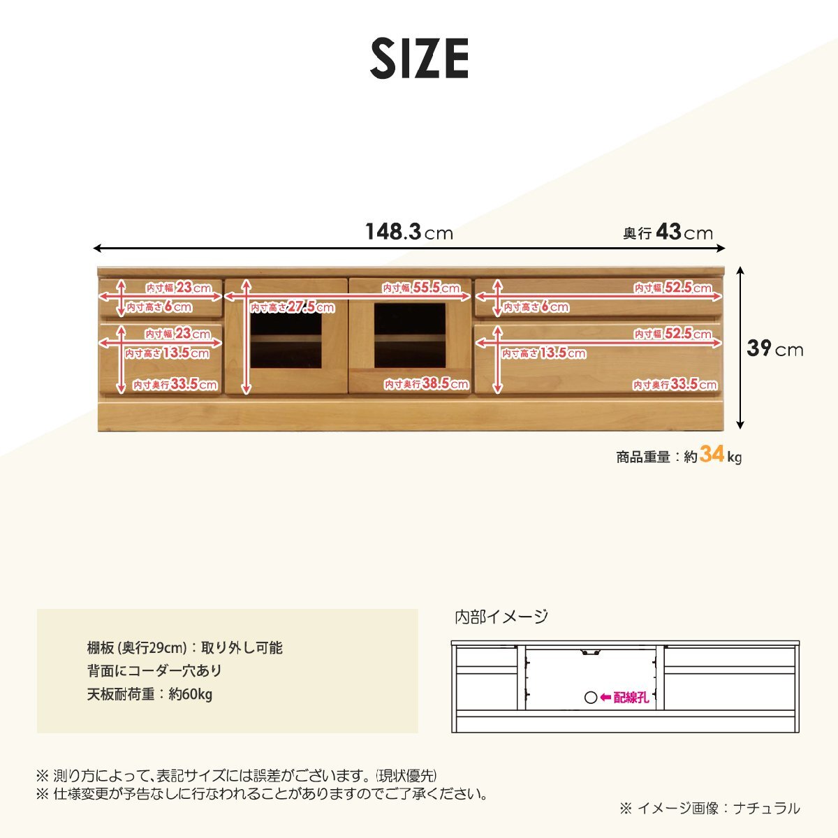 商品サイズ本体:幅148.3cm×奥行き43cm×高さ39 cm