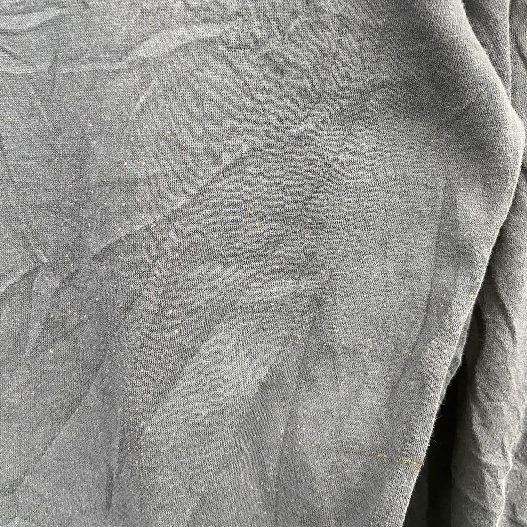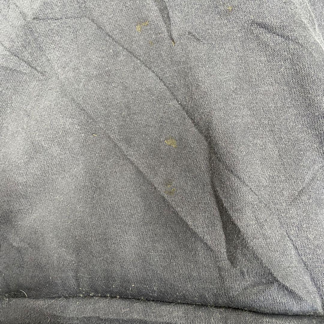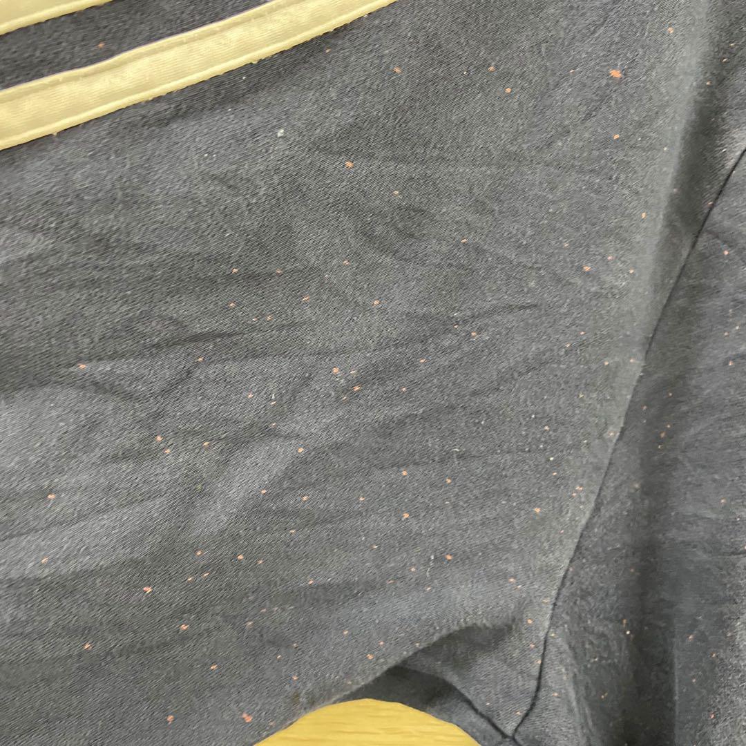 前面中央から右袖真ん中にかけて+後面右側に赤っぽい細かな汚れがあります。それとは別に右袖に汚れあり。(10枚目写真)