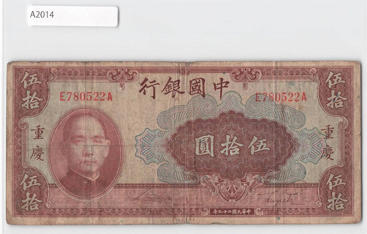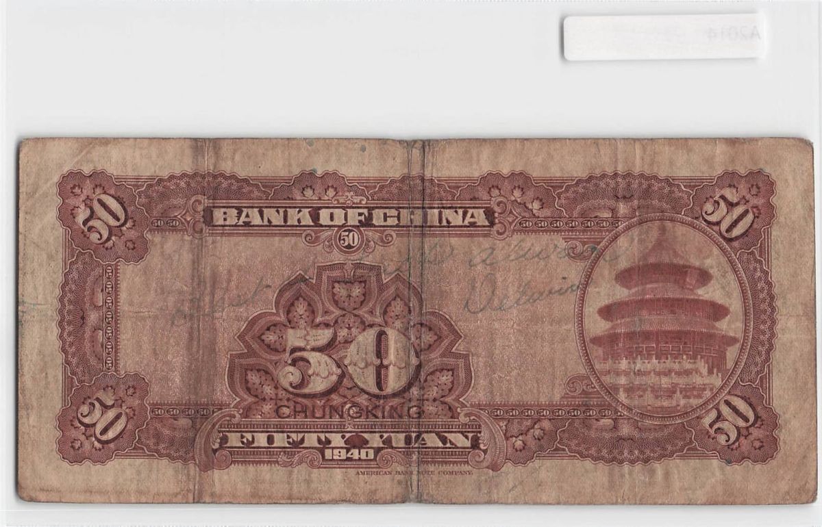 *[令和コイン]中国紙幣 中国銀行 50圓(1940)[A2014]7b0
