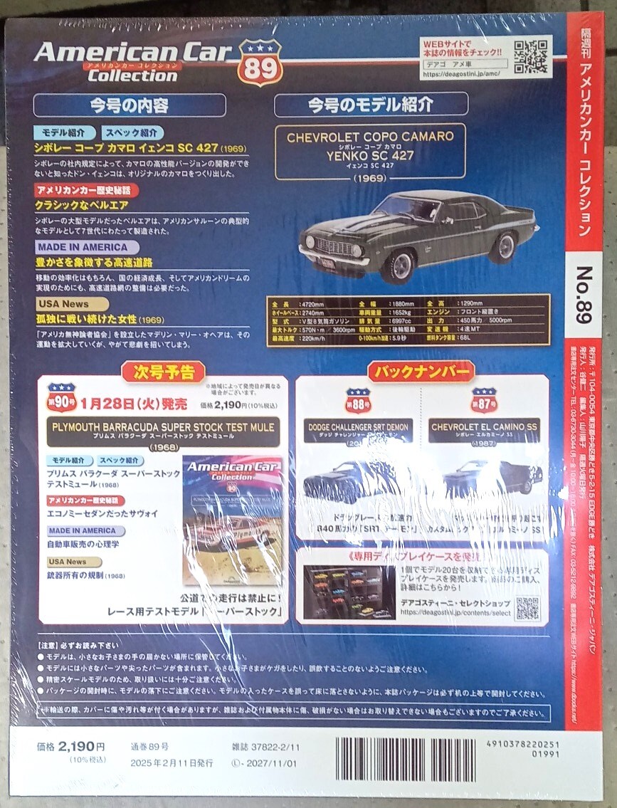 ☆ディアゴスティーニ No.89 1/43 アメリカンカーコレクション シボレー コープ カマロ イェンコ SC 427(1969)☆新品未開封品