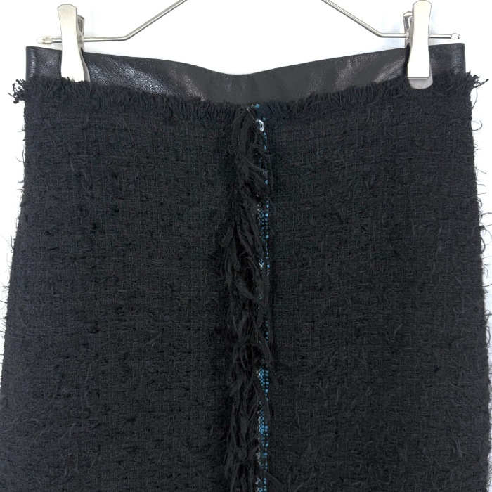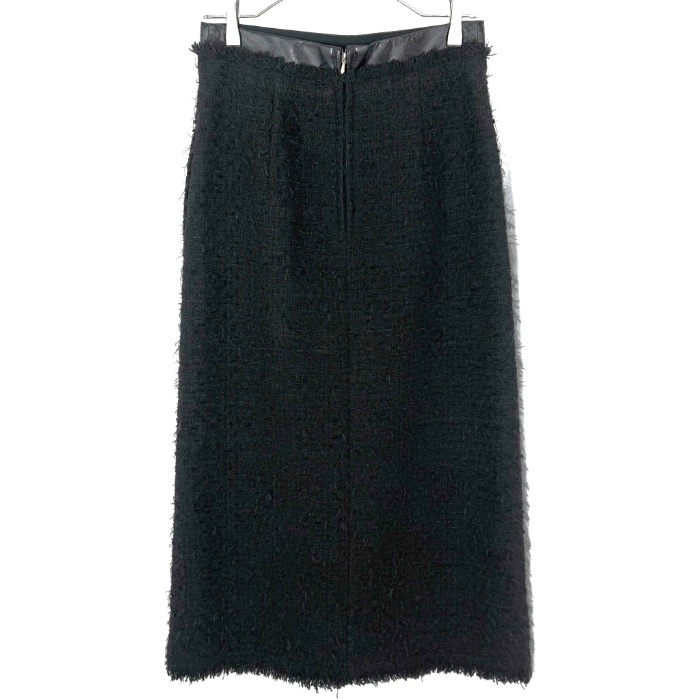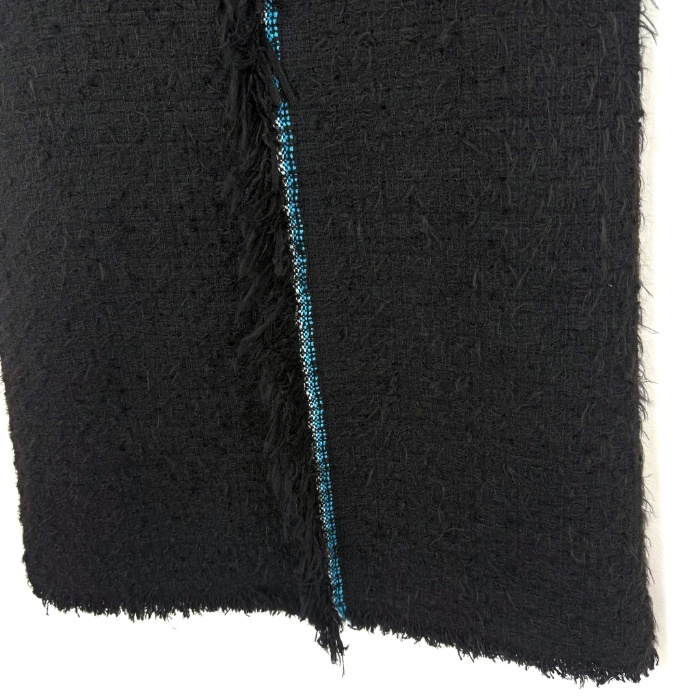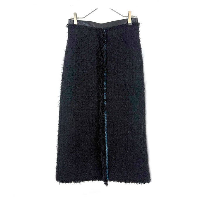 | 【コメント】 セミタイトのツイードロングスカートです。ブルー系のセンターラインがアクセントになった素敵なデザイン。前にスリットが入った綺麗なシルエット。少し毛羽立ちがありますが、気になる汚れはなく全体的に状態の良い綺麗なお品物です。 |