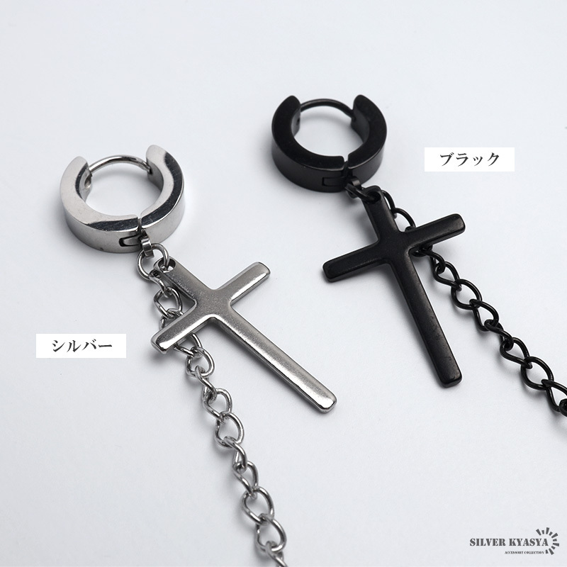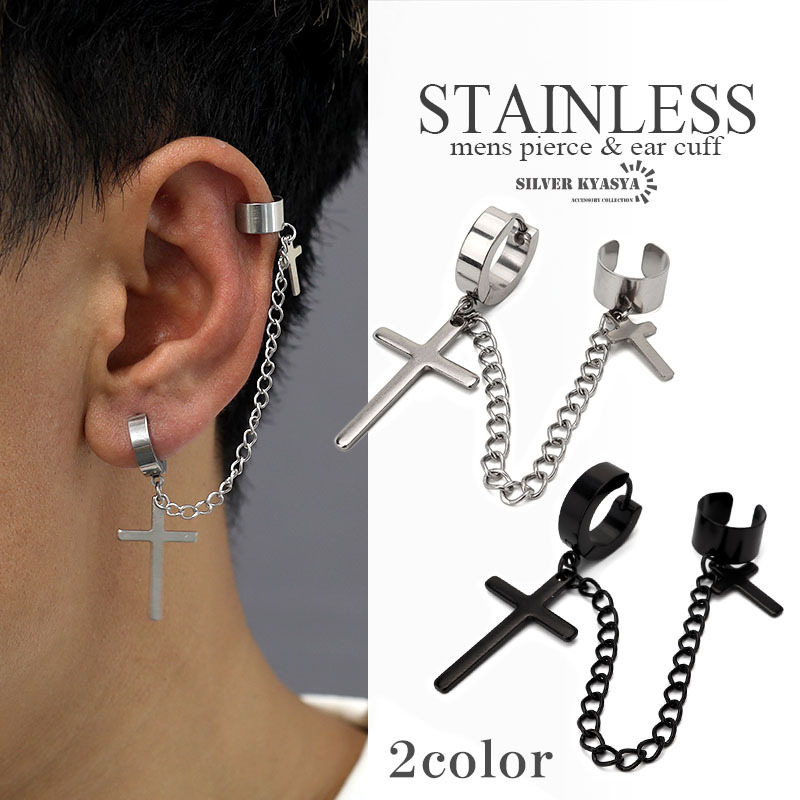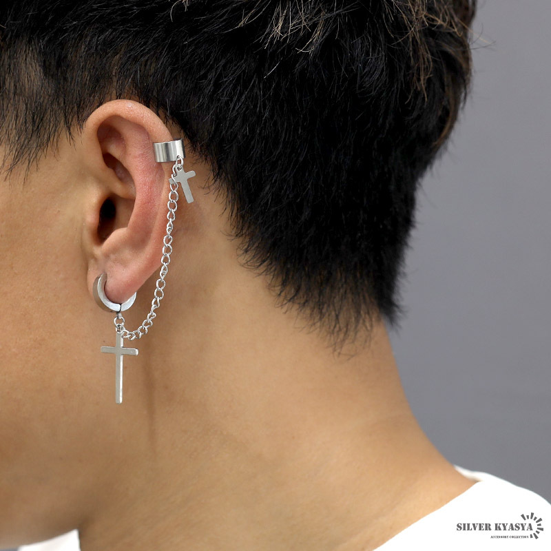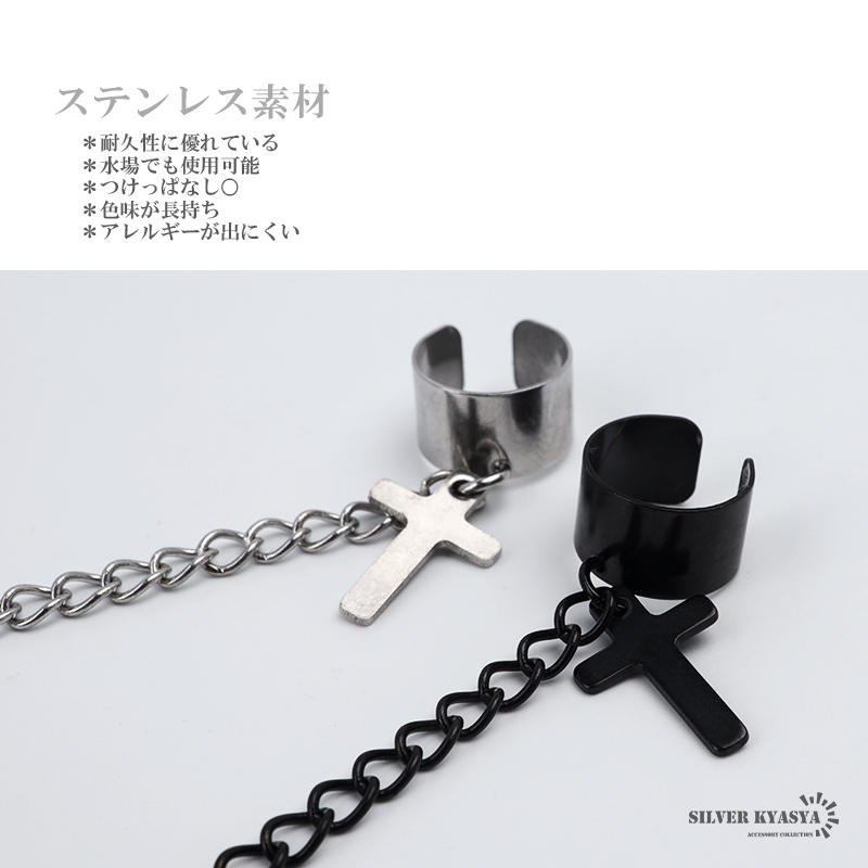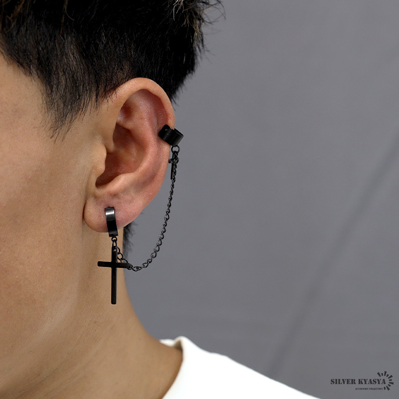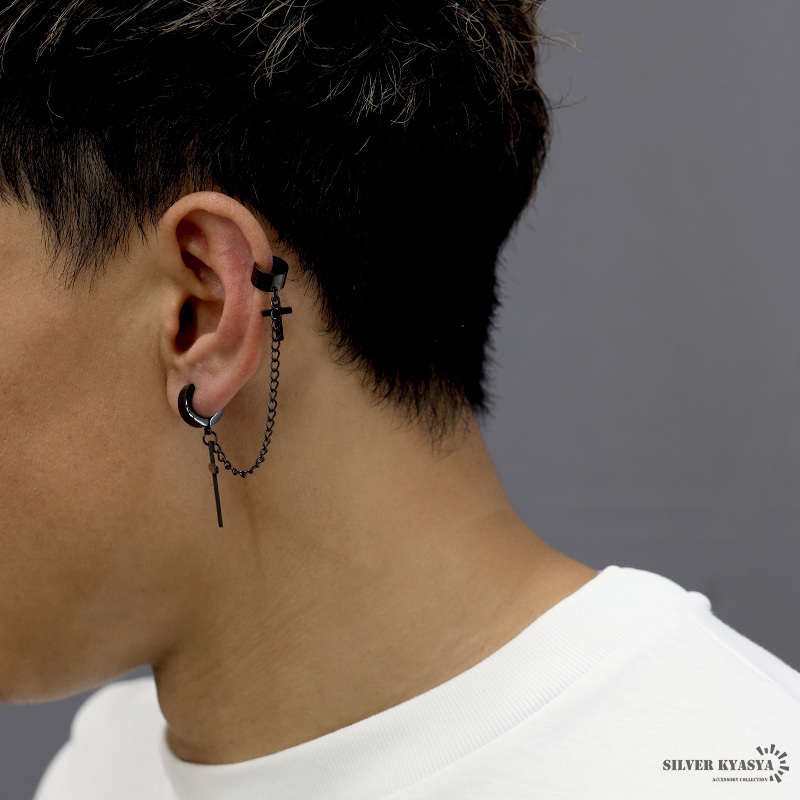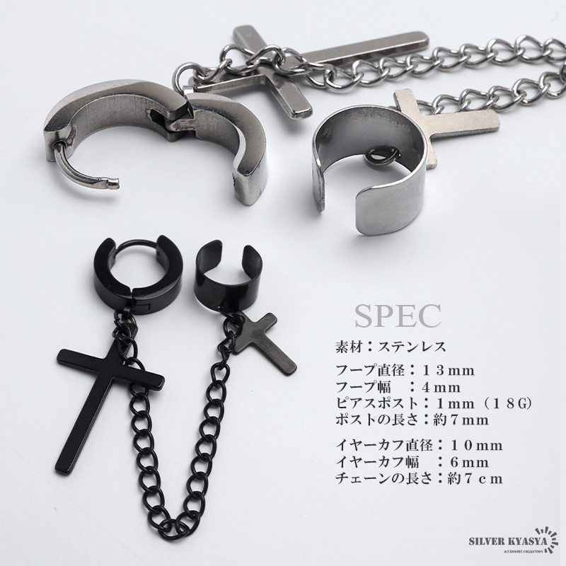 商品概要 | ■ITEM DETAIL クロスピアスとイヤーカフをチェーンで繋いだパンクなピアス。ド派手なデザインが存在感を発揮し、耳元に注目を集めるアイテム。 ■ステンレス素材を使用 金属部分は頑丈なことで知られるステンレス素材を採用。耐久性はもちろん耐水性も高く水場での着用も可能。金属アレルギーも出にくいとされている金属です。 |