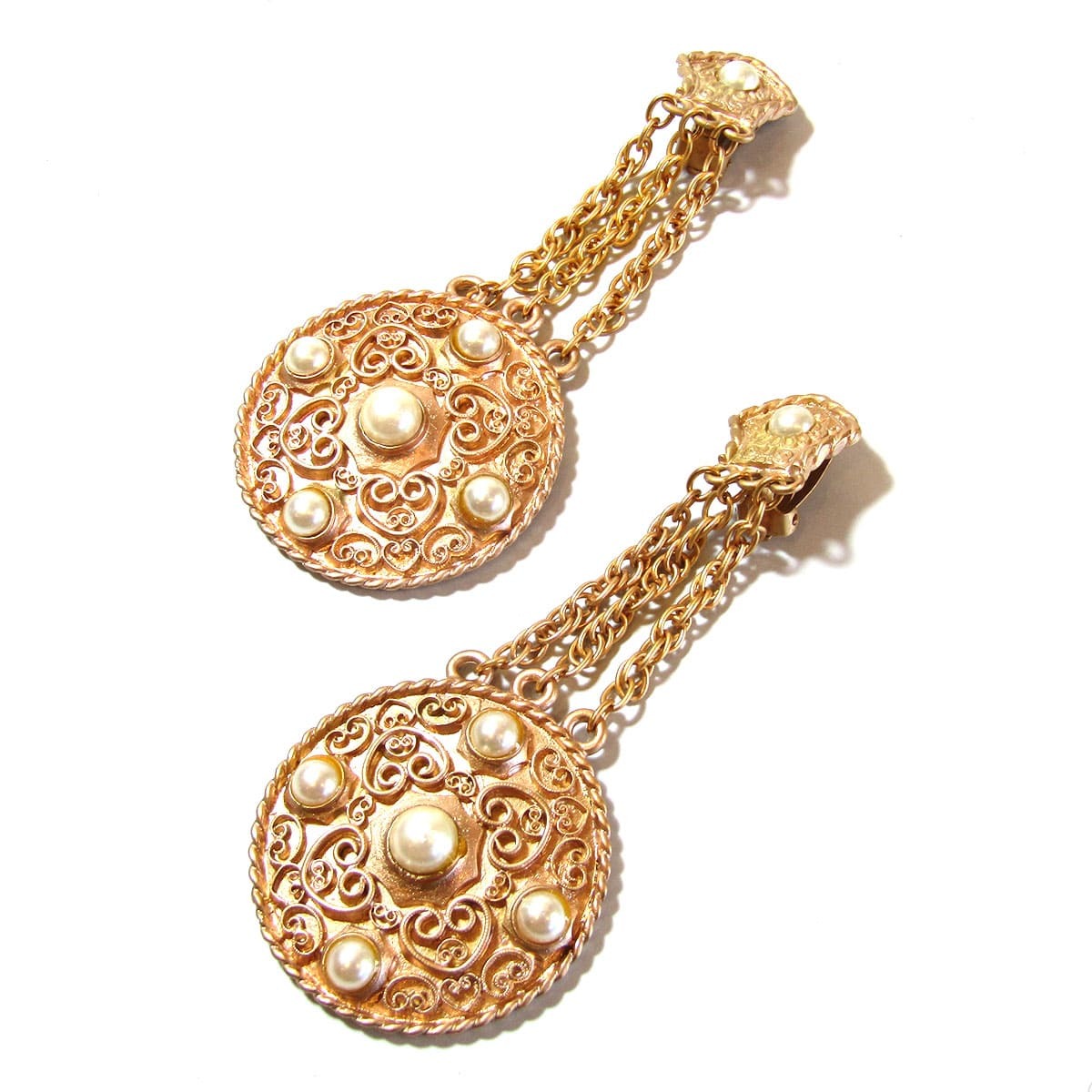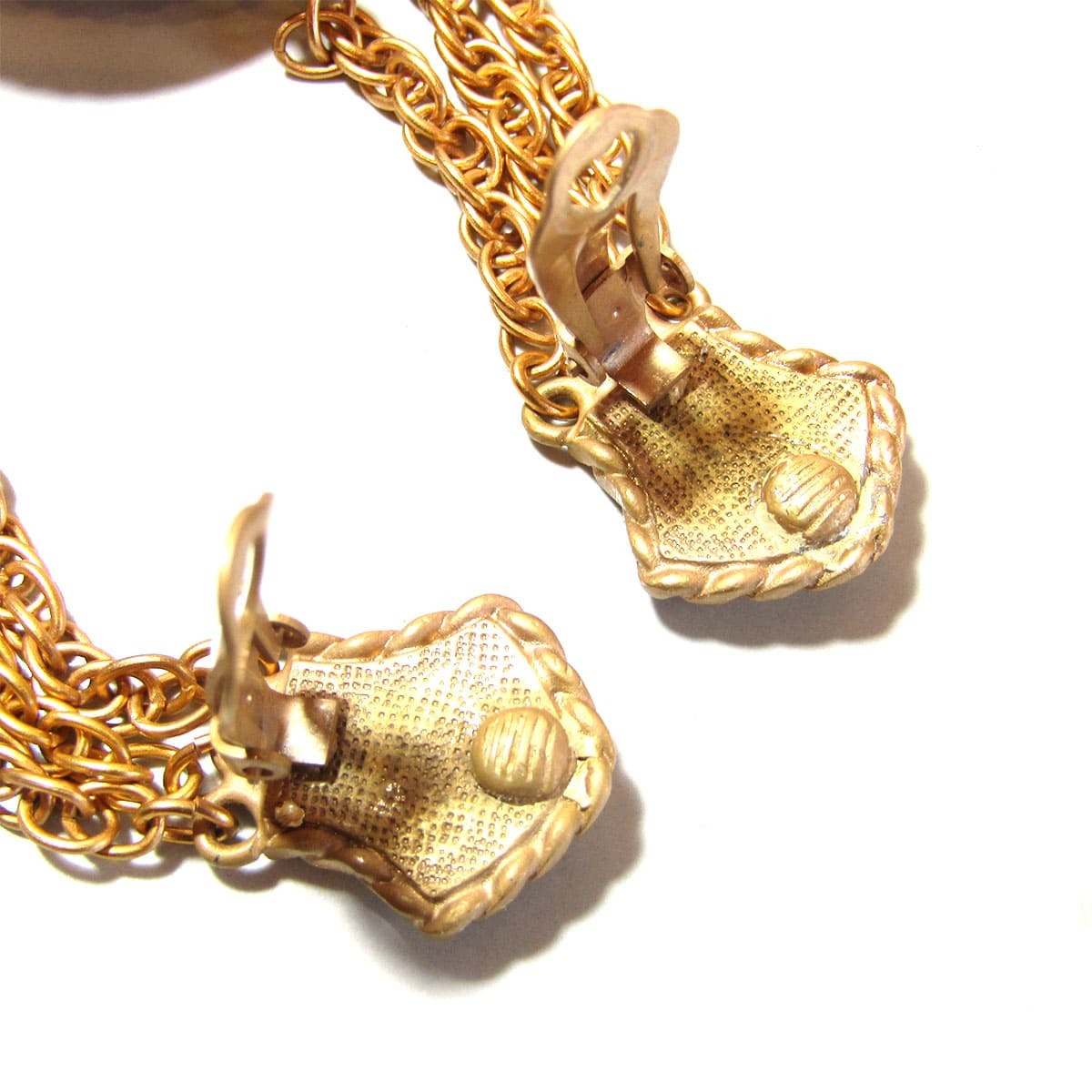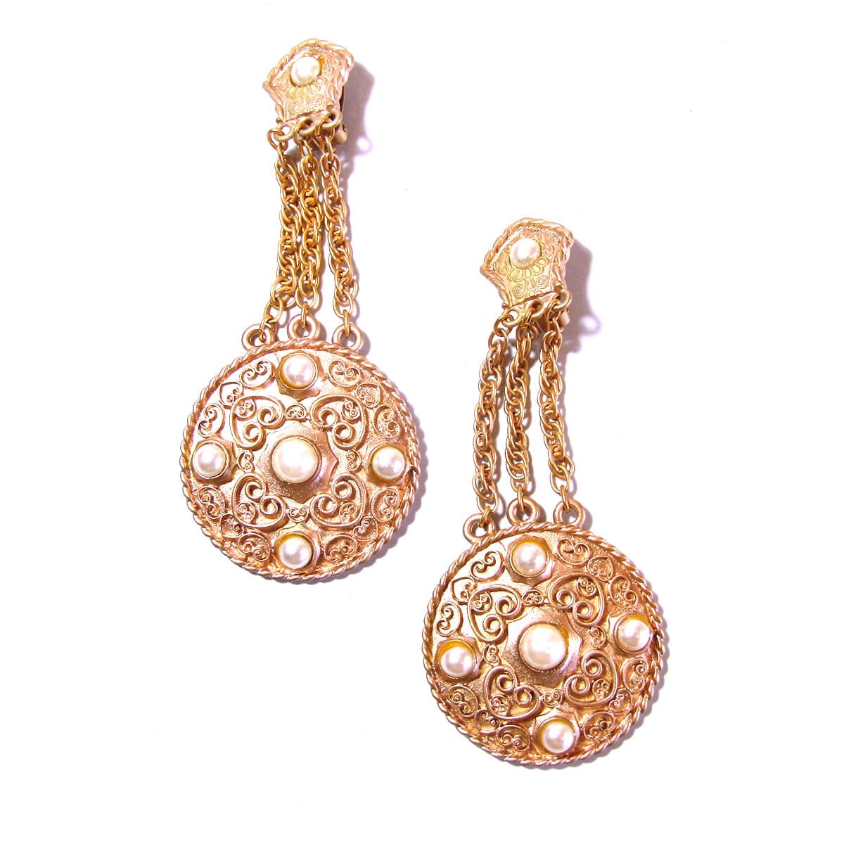 Vintage Gold Tone Oriental Design Big Drop Earring