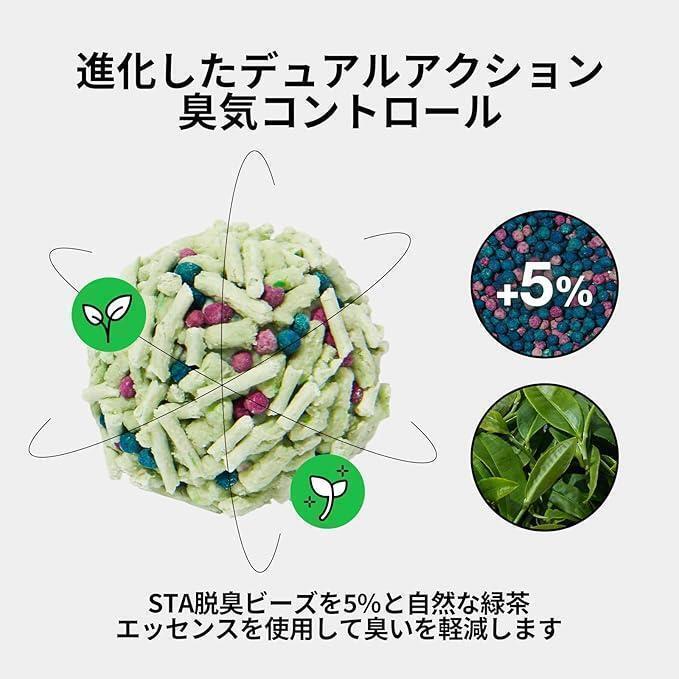 この猫砂には、不快な臭いを隠す天然の緑茶植物エキスが含まれています。また、5%の消臭ビーズが効果的に臭いを抑え、常に新鮮で無臭の環境を提供します。